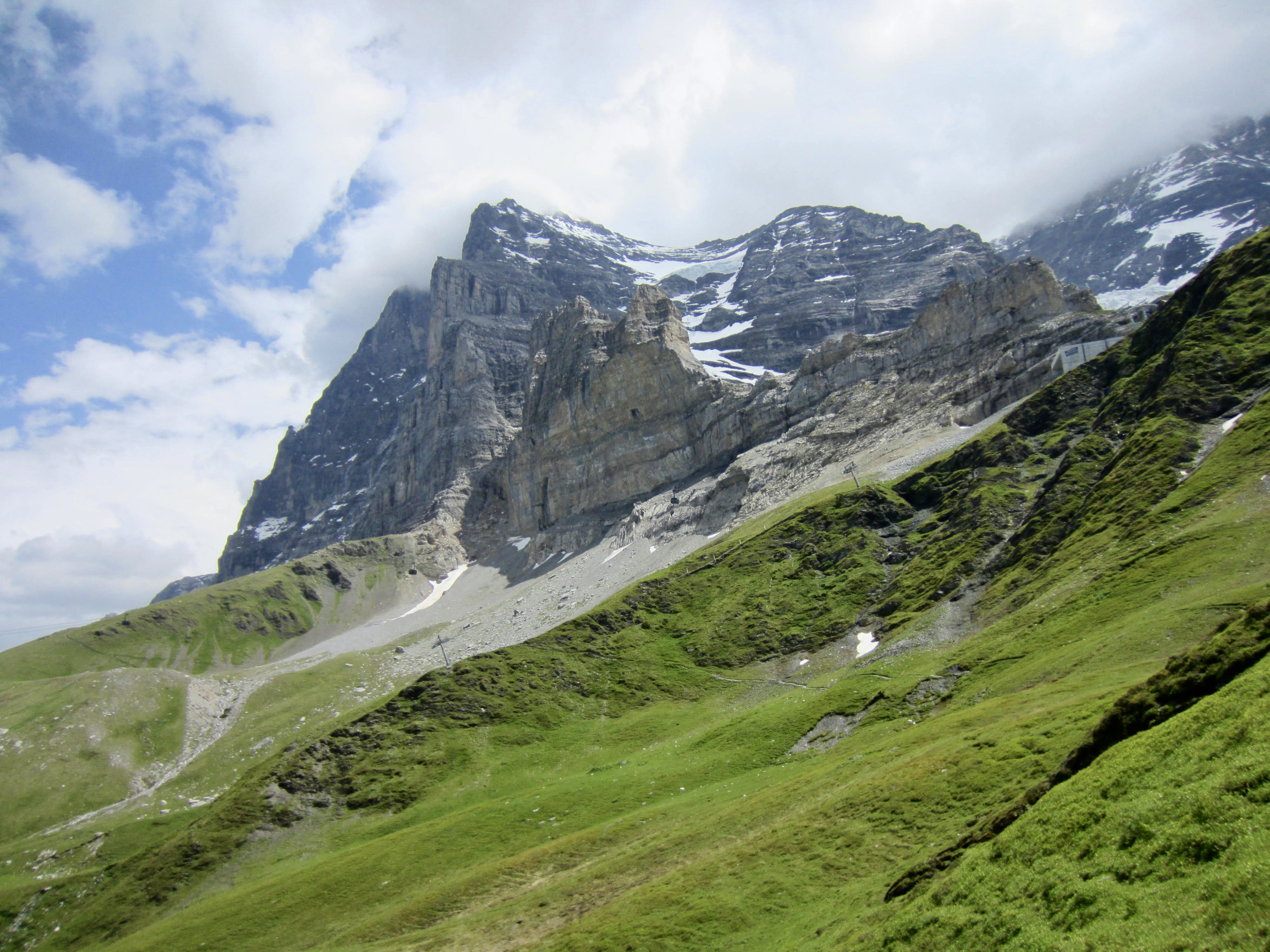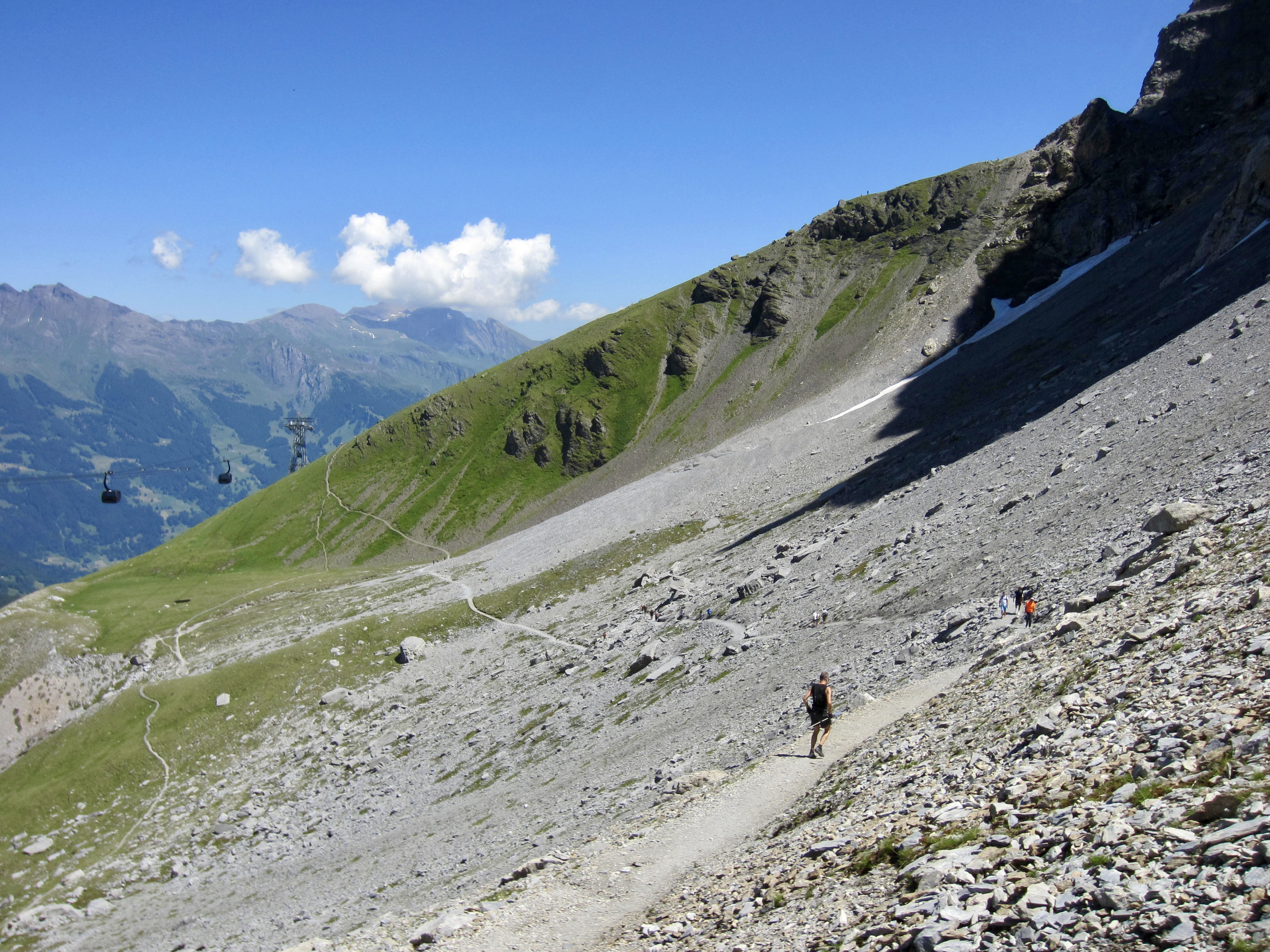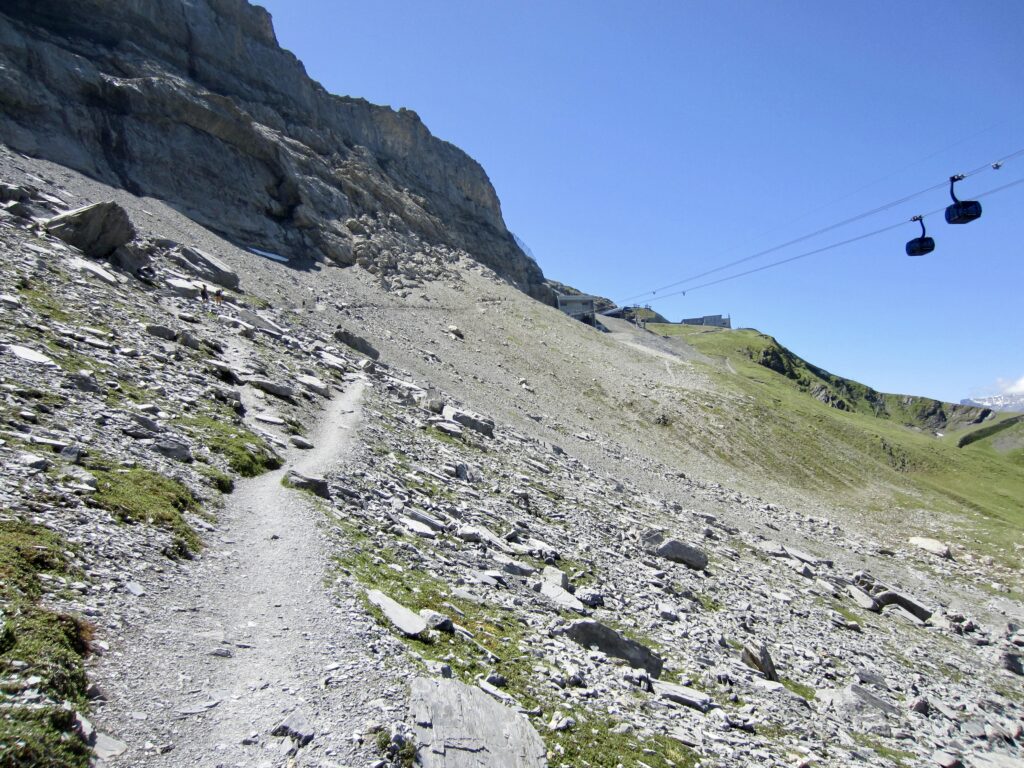 Beyond the historical monuments, the Eiger Trail descends a broad talus and scree slope, staying almost underneath the Eiger Express gondola. After hiking 0.45 miles / 0.7 kilometers from Eigergletscher Station, you will arrive at the three-way junction.