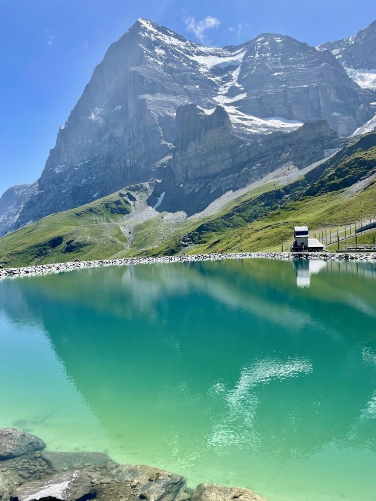 From the hotel buildings, a gravel road (signed as Eiger Walk) winds uphill to a water reservoir called Fallbodensee. This reservoir serves as a fine reflective surface for photographing the nearby Eiger.
