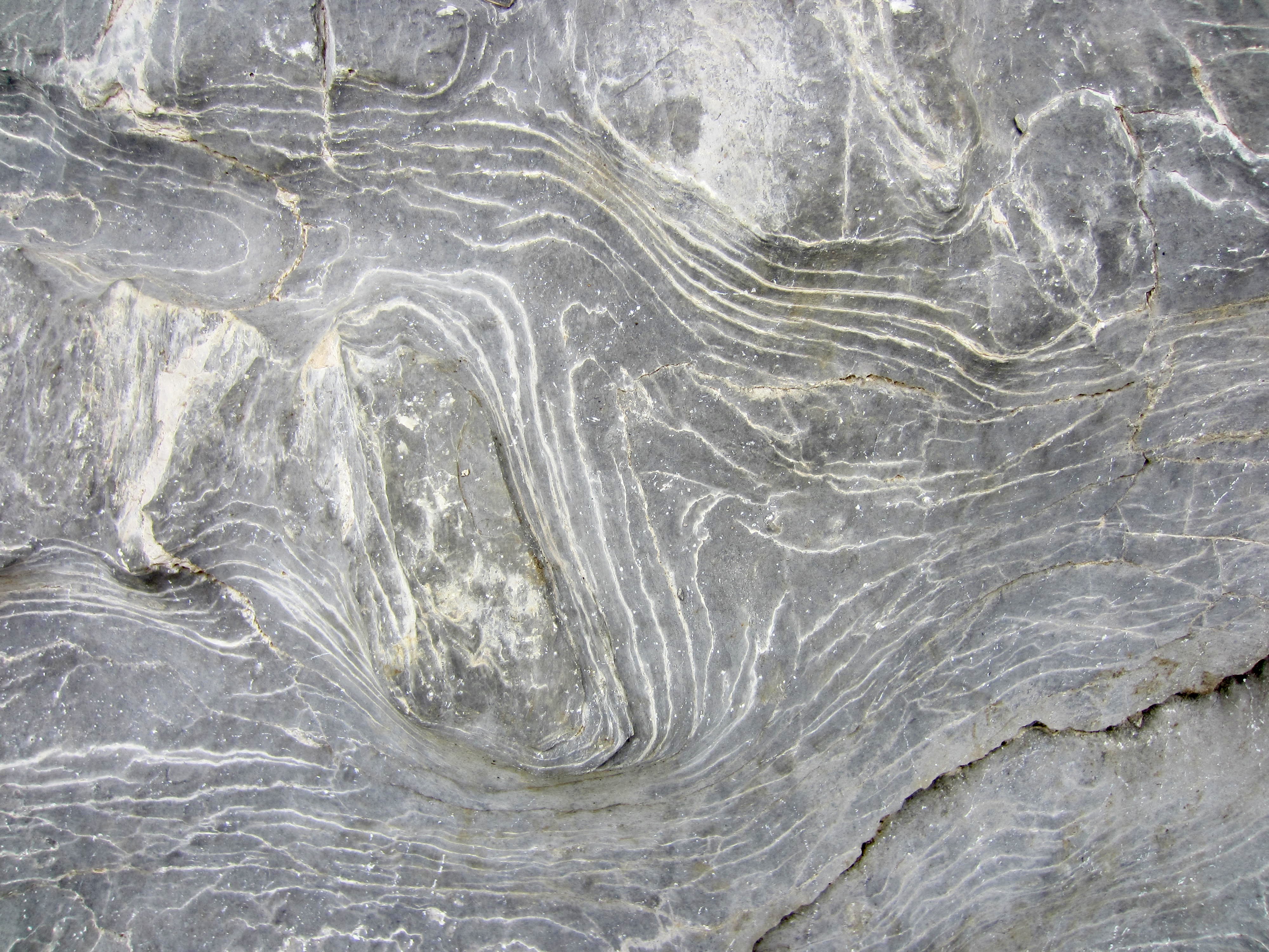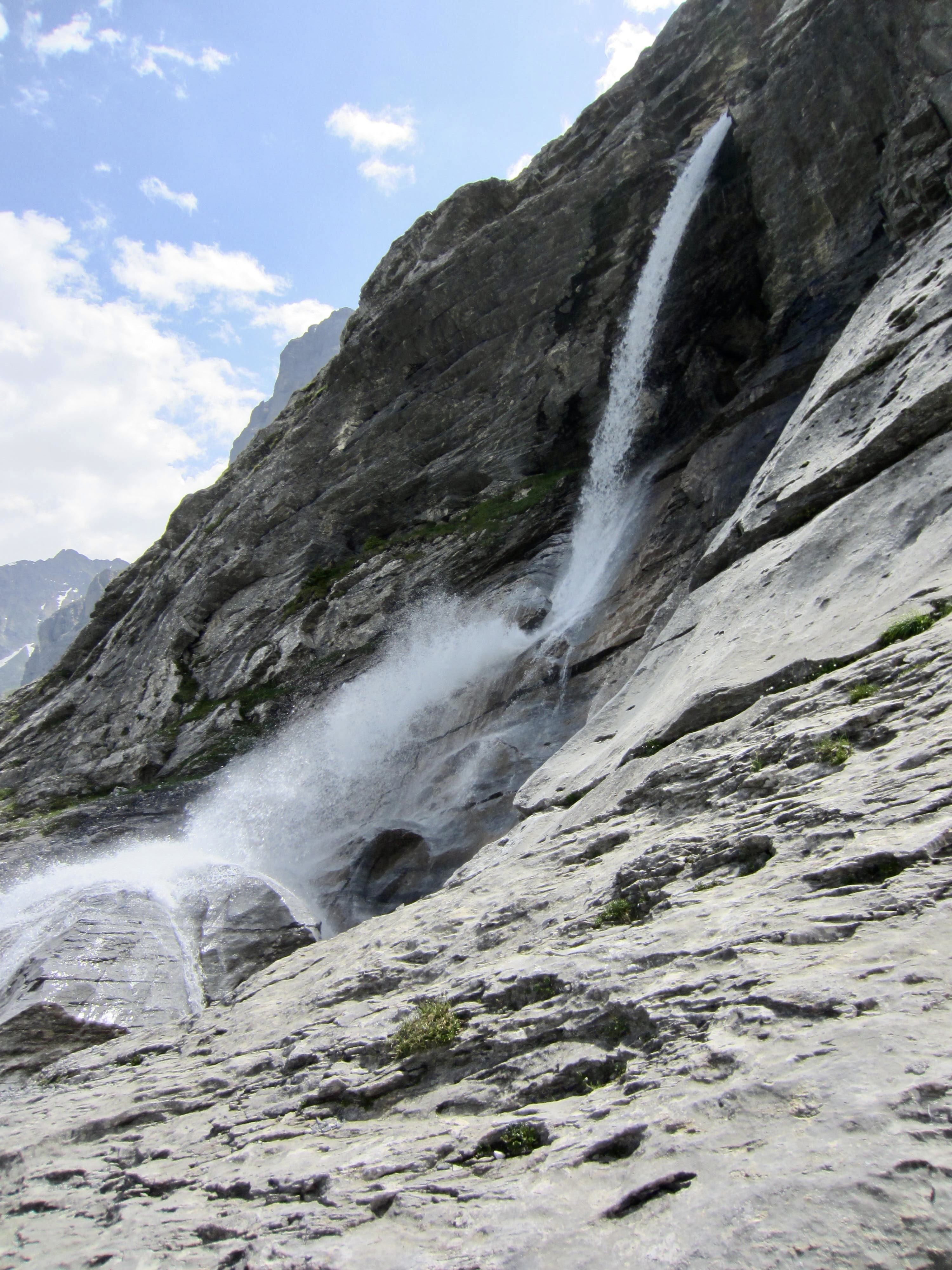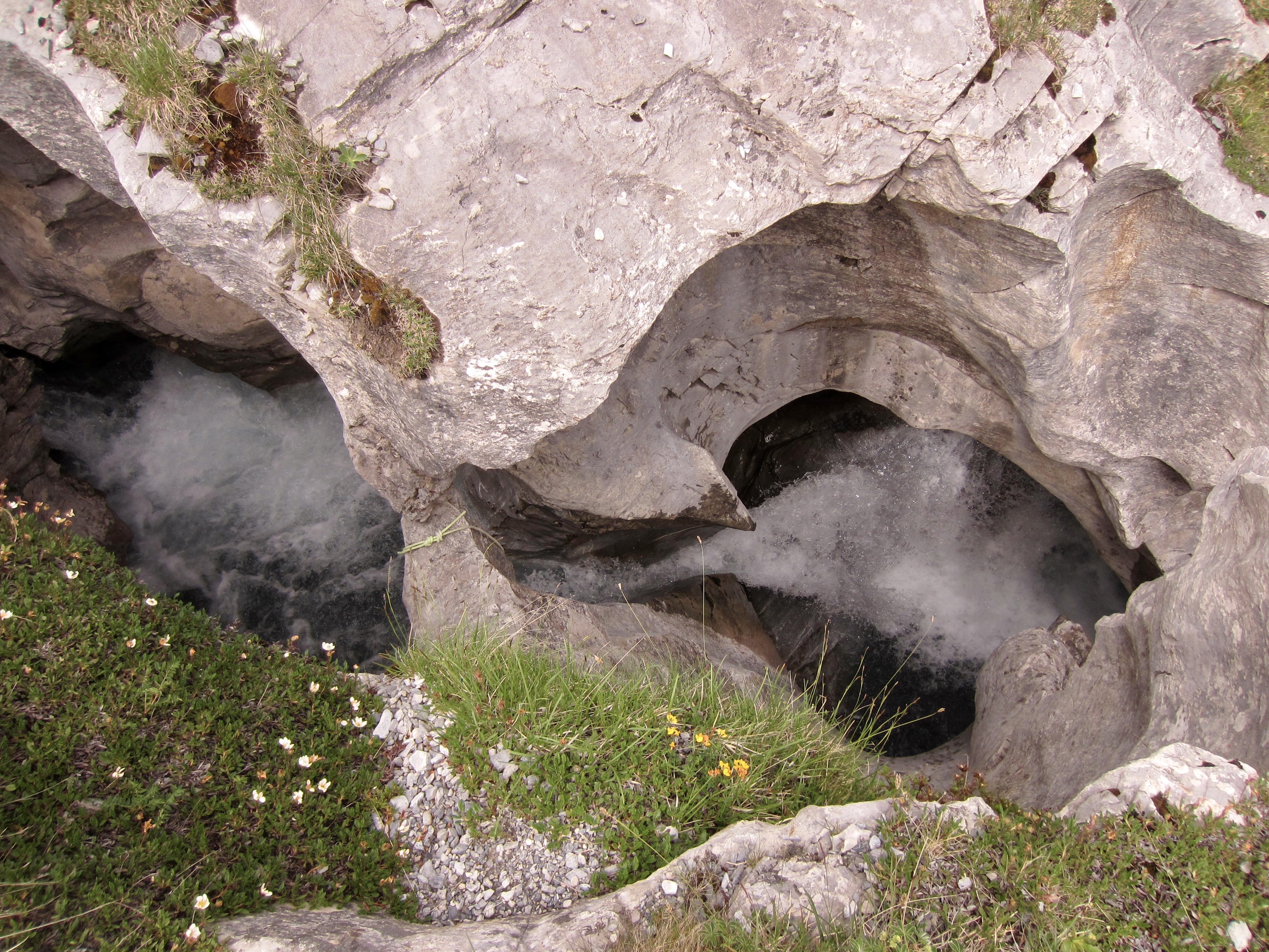 The trail soon passes a small but vigorous stream that has carved an impressive slot into the limestone bedrock. Farther uphill, this same stream creates a striking waterfall where it cascades over a cliff.
