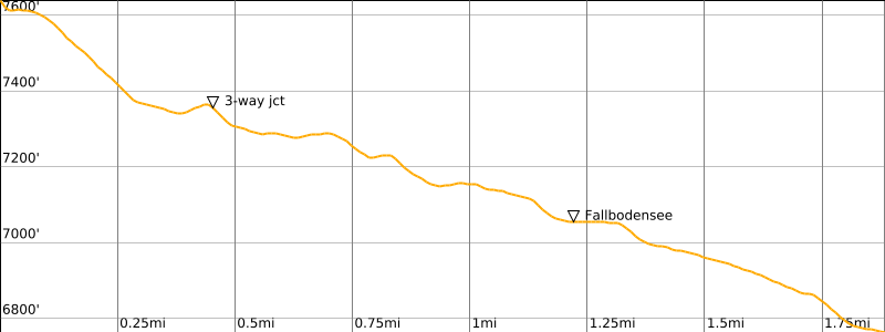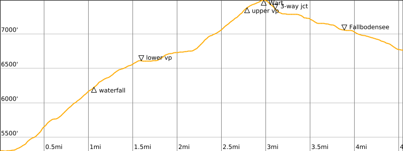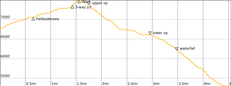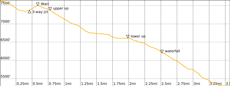 Approximate Stats: 3.6 miles / 5.8 kilometers traveled; 150 feet / 45 meters gained; 2500 feet / 760 meters lost.