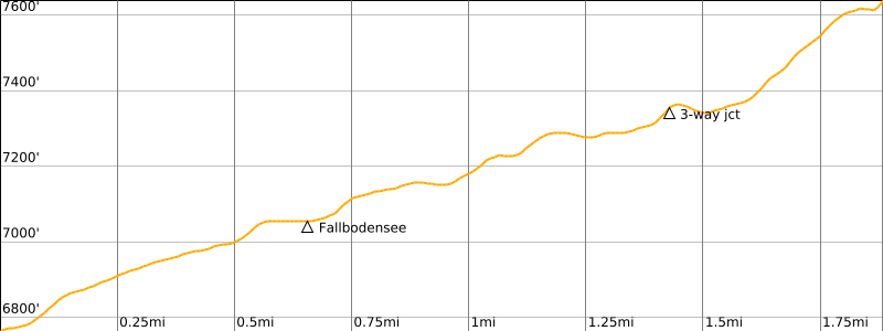 On the far side of the reservoir, a signpost marks the formal start of the Eiger Trail. The first part of this trail makes a gently rising eastward traverse across the grassy hillside, curving around several small basins and ribs.