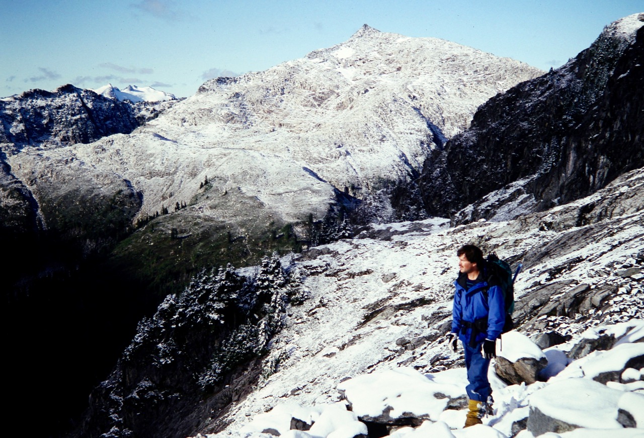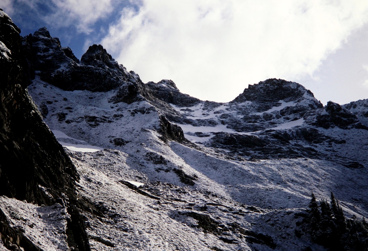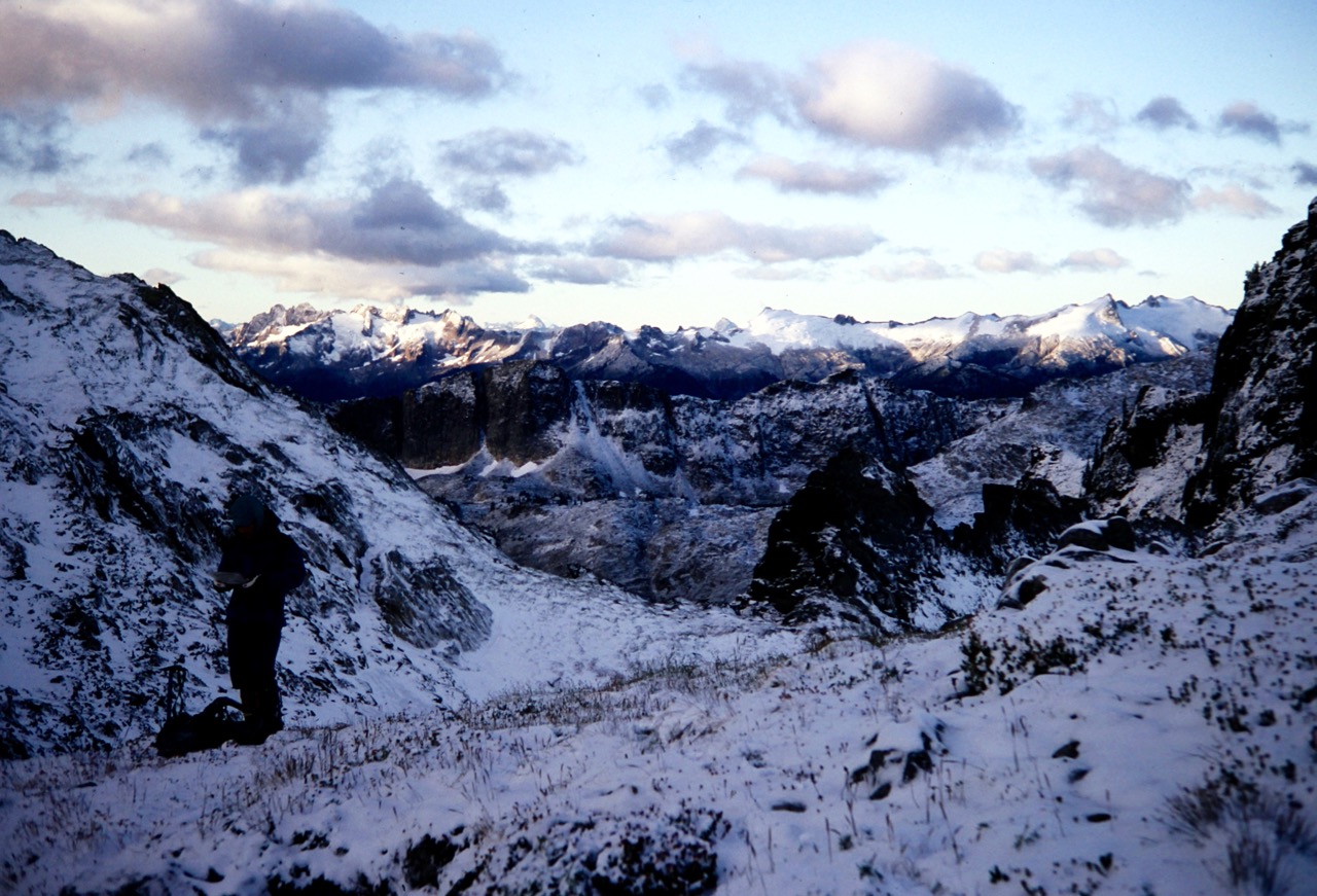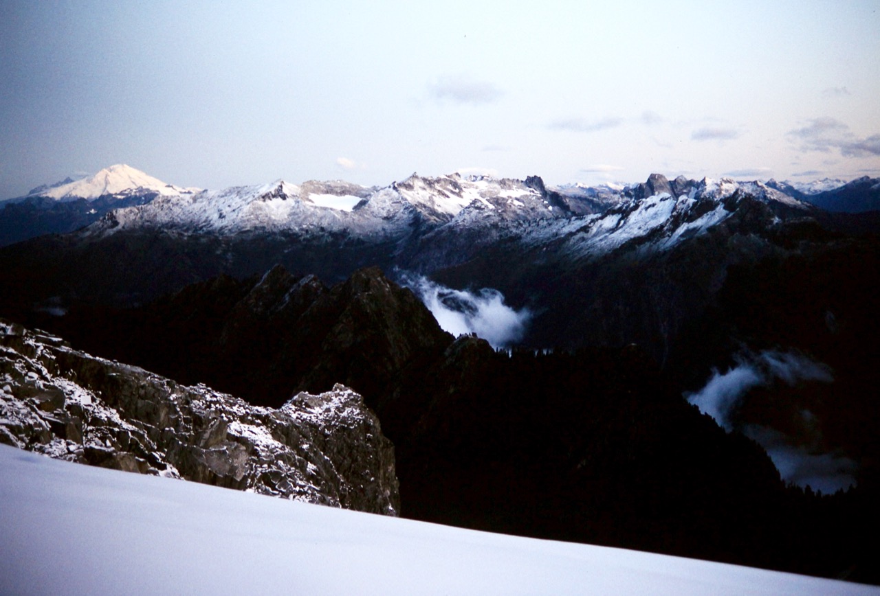 After a frigid night, we awoke to find several inches of fresh snow blanketing the rocks and snowfield. Eldorado Peak was visible across Marble Creek Cirque, about 3 miles away and looking quite foreboding with its dark, snow-dusted rock.