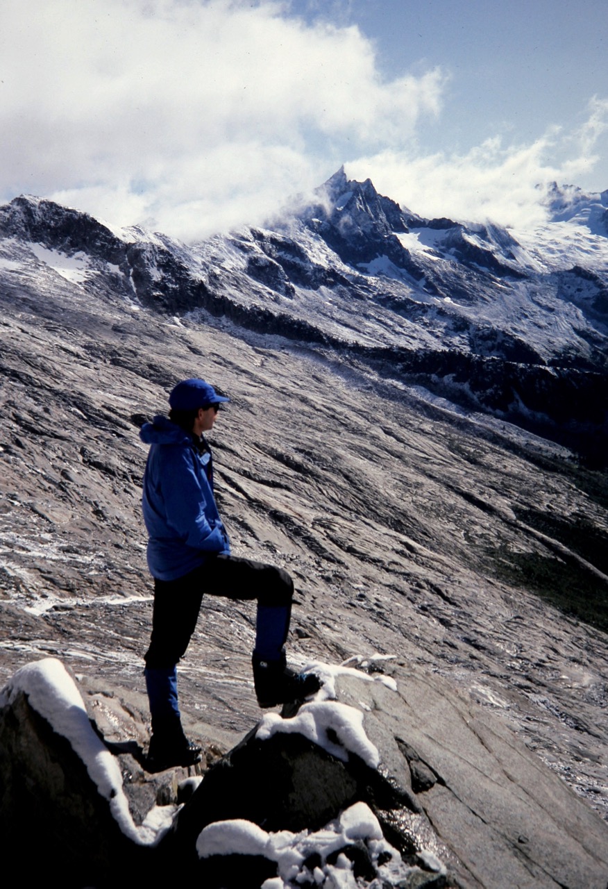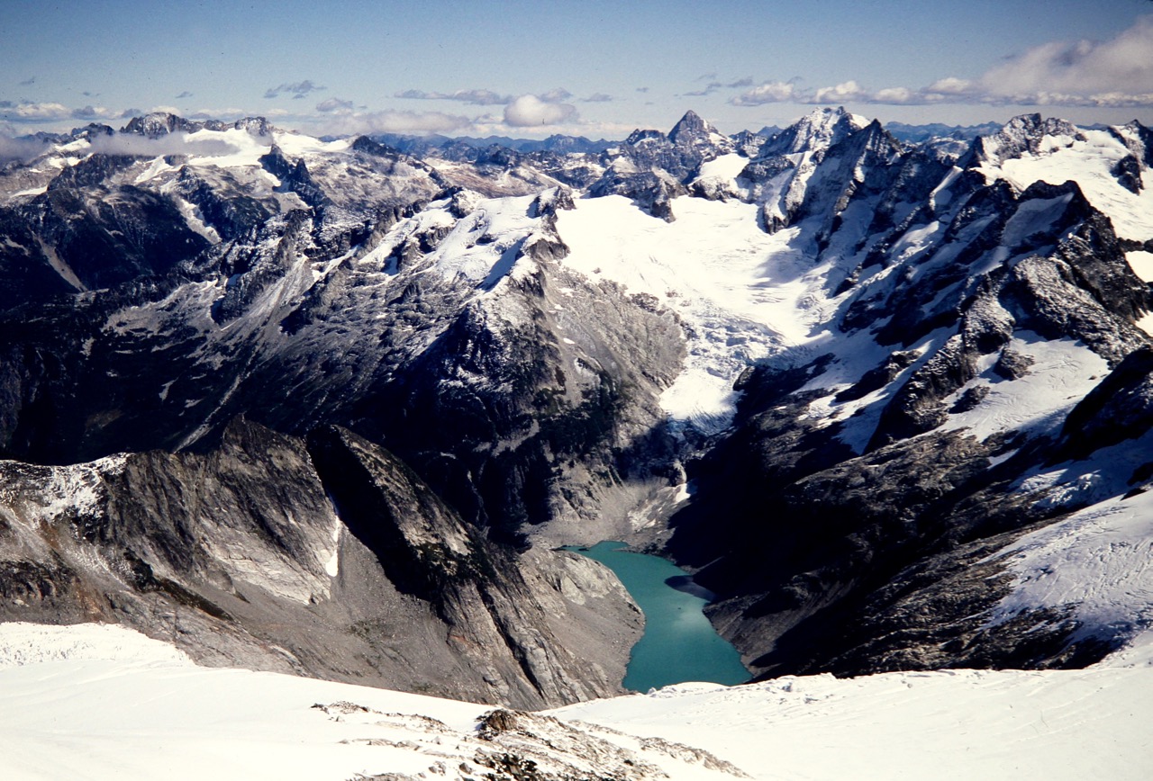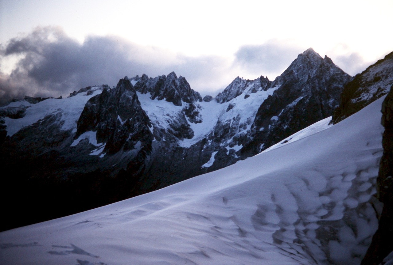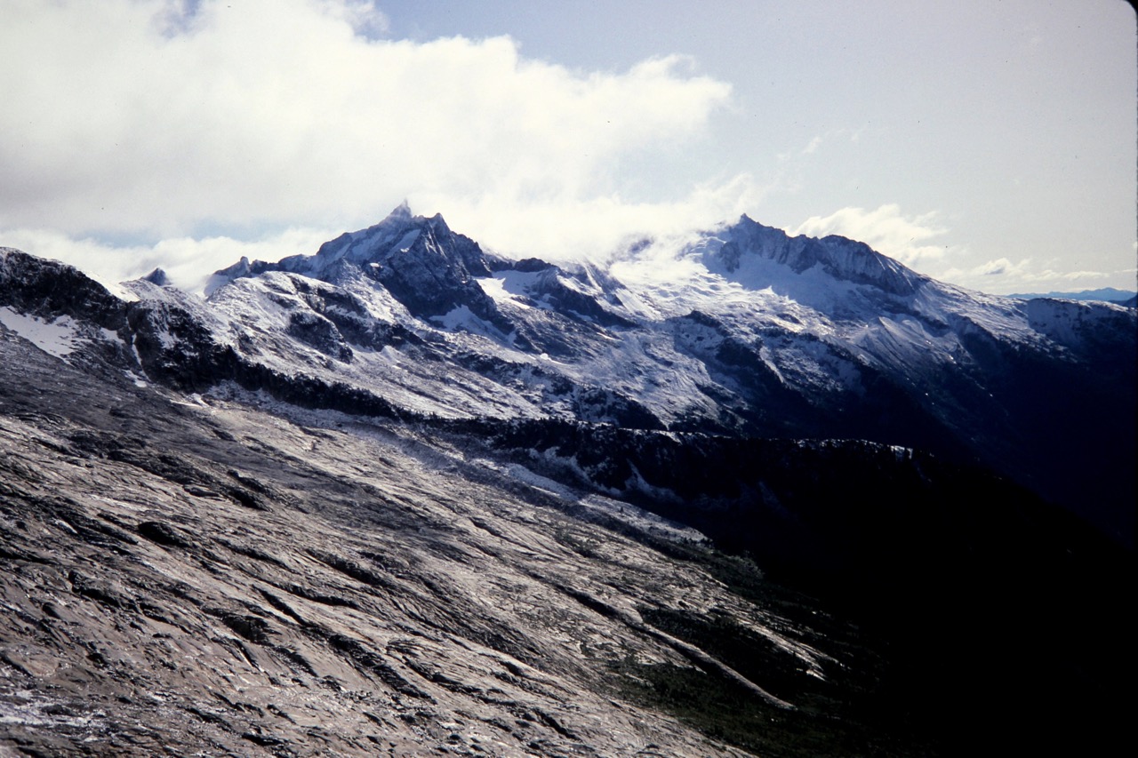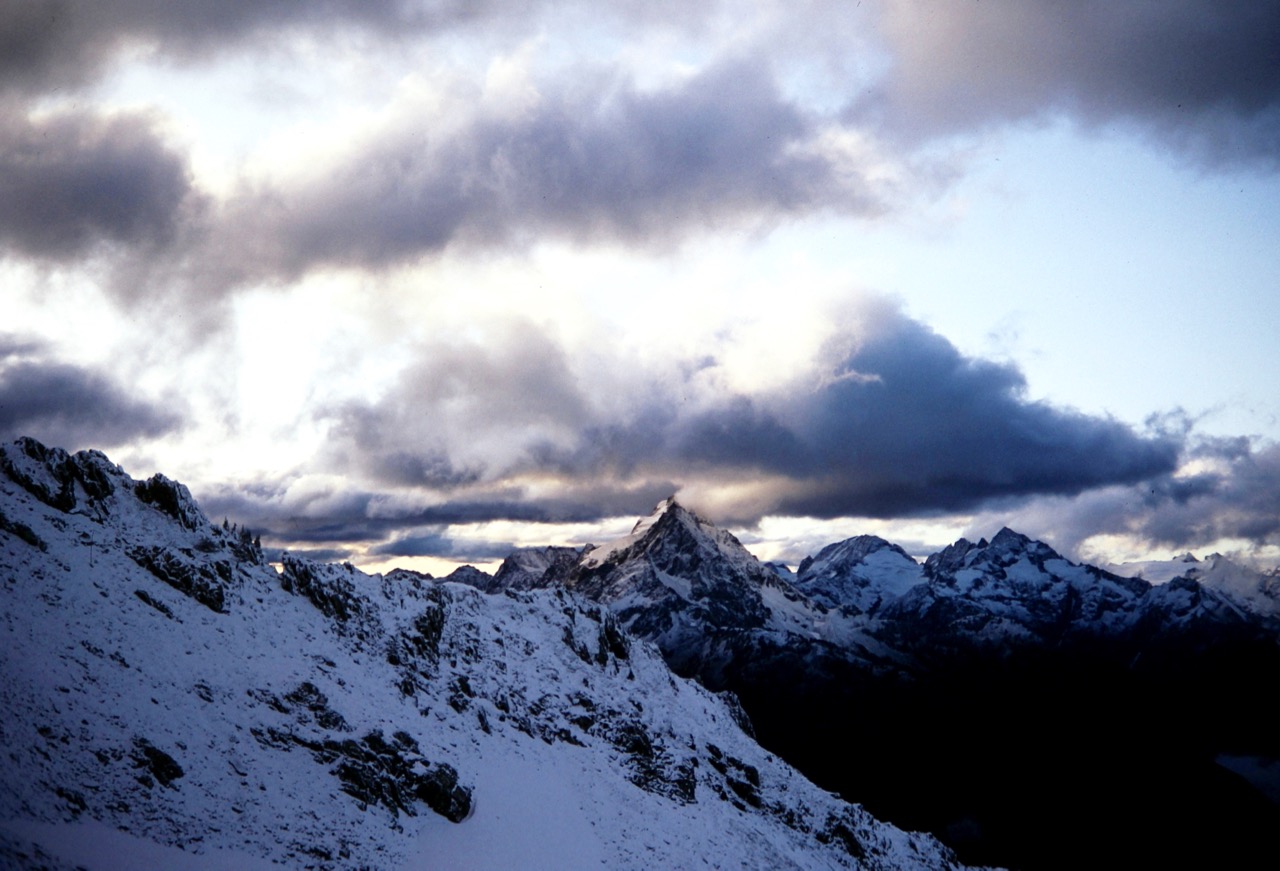 After a frigid night, we awoke to find several inches of fresh snow blanketing the rocks and snowfield. Eldorado Peak was visible across Marble Creek Cirque, about 3 miles away and looking quite foreboding with its dark, snow-dusted rock.