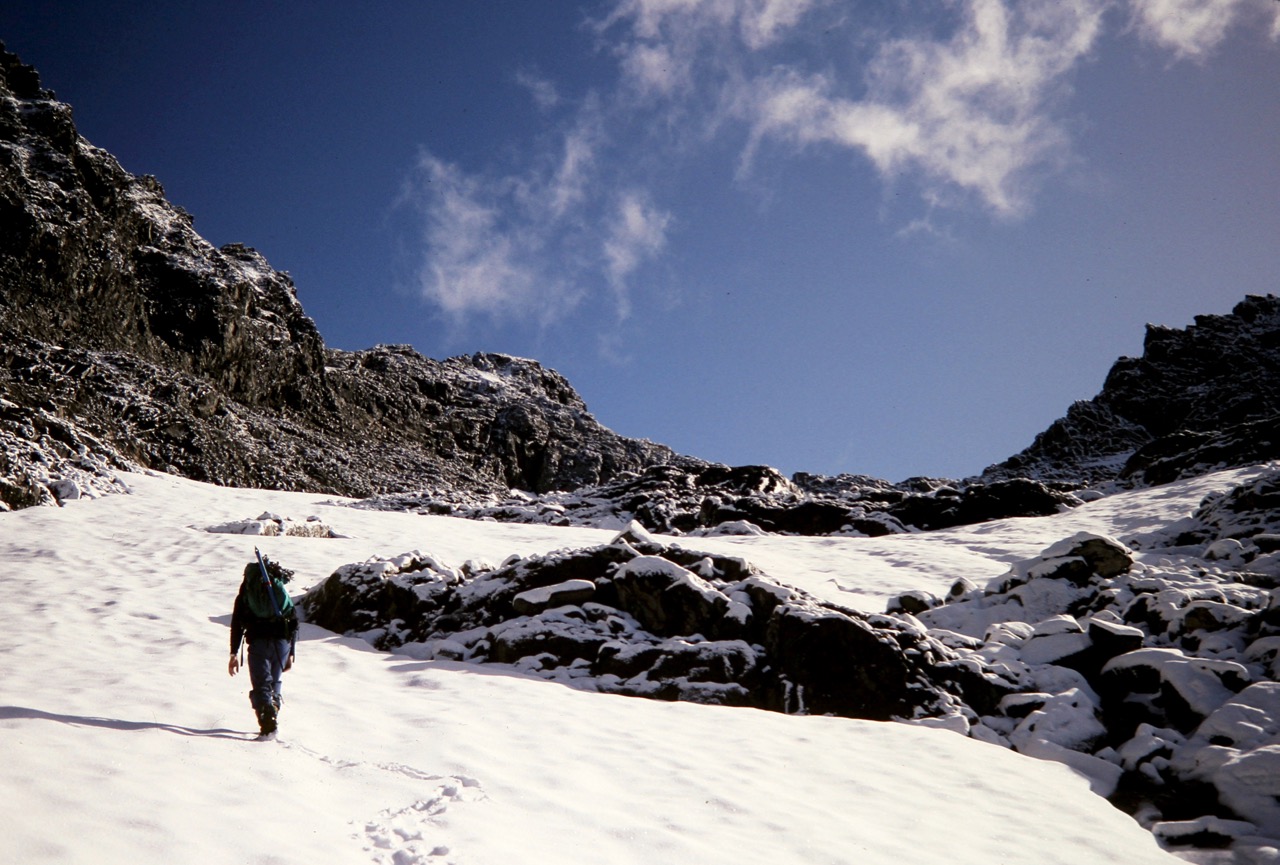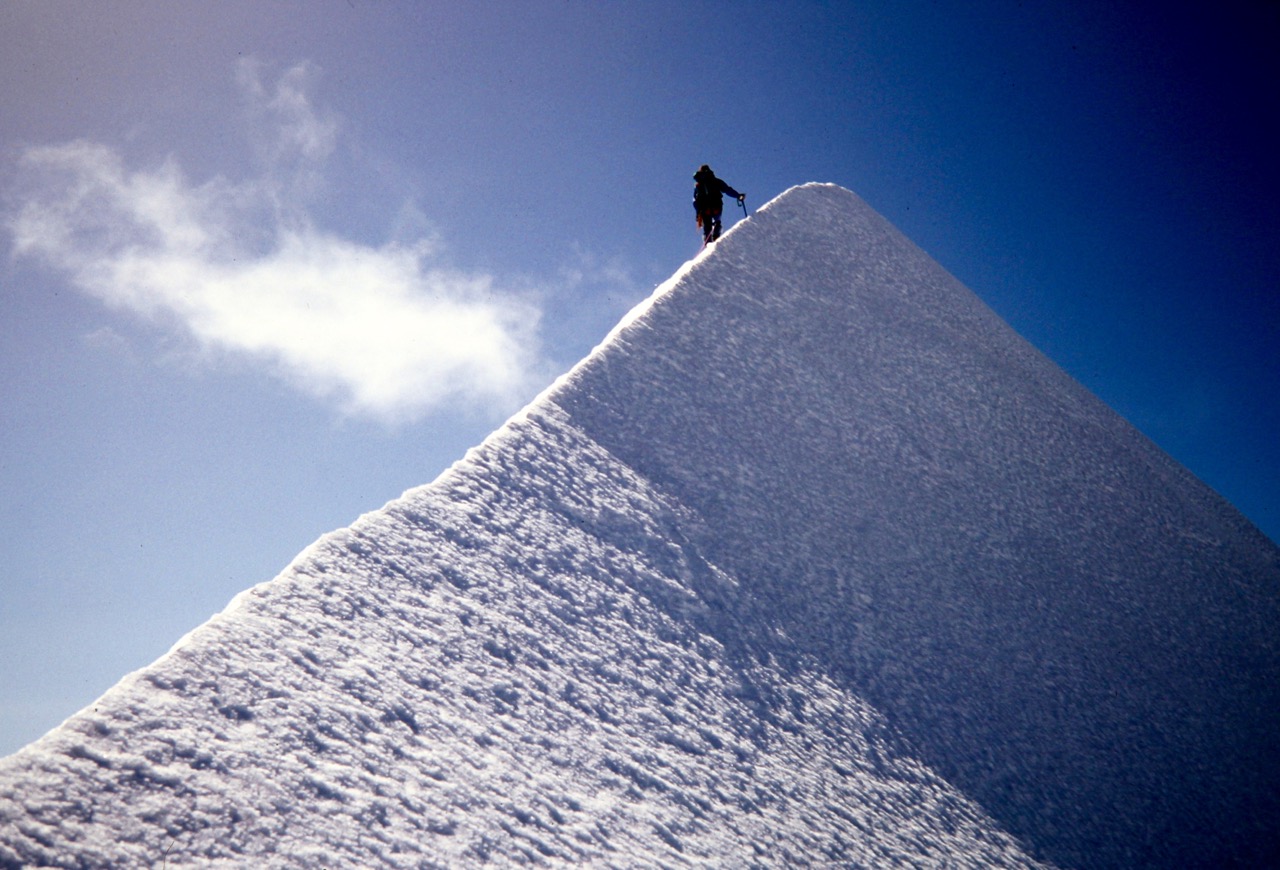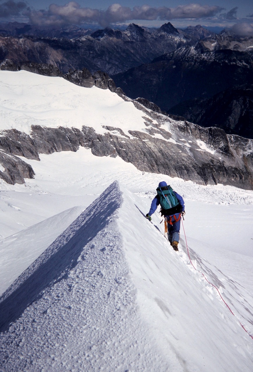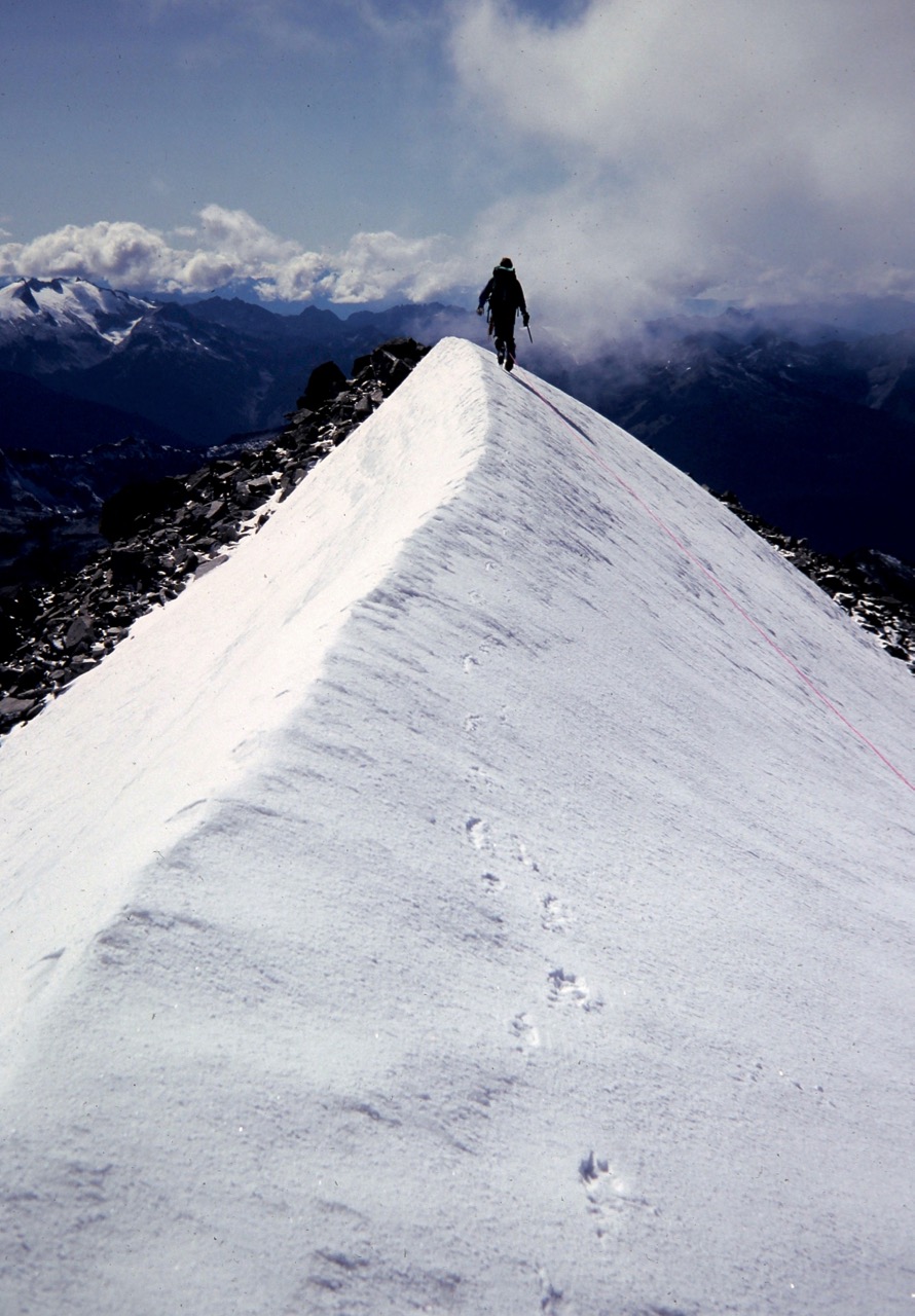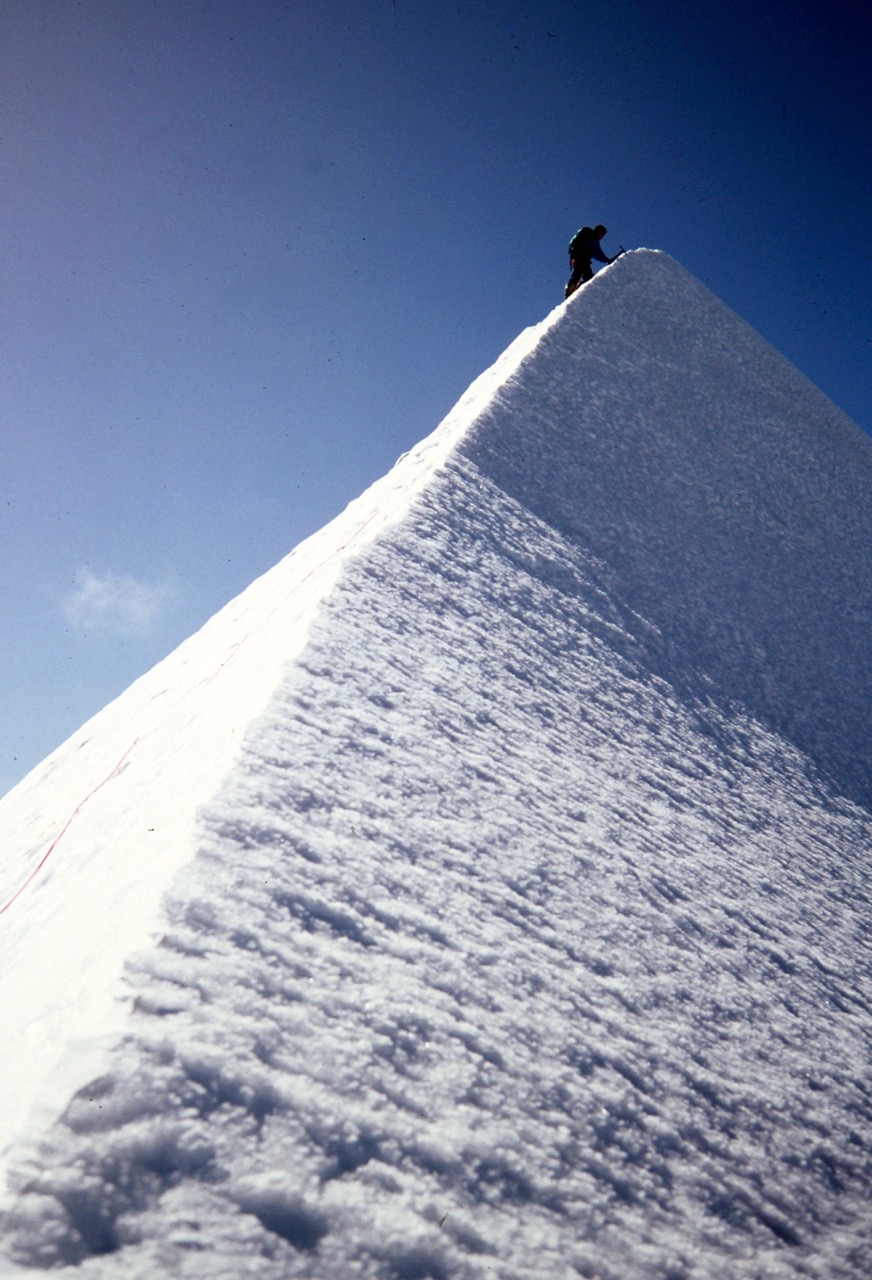 When the rope went taut, I followed Craig’s crampon marks up the arete. The climbing was incredibly exposed but incredibly scintillating! At the top of the pyramid, the arete became nearly horizontal, and I saw Craig strolling along the right side of the crest, about 50 yards away. He stopped on a tiny point of snow and reeled me in.
