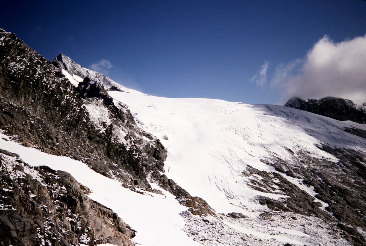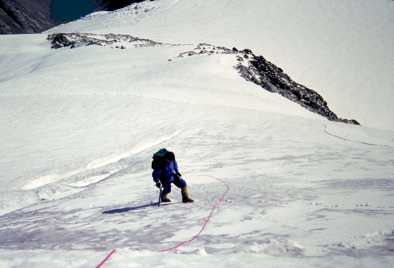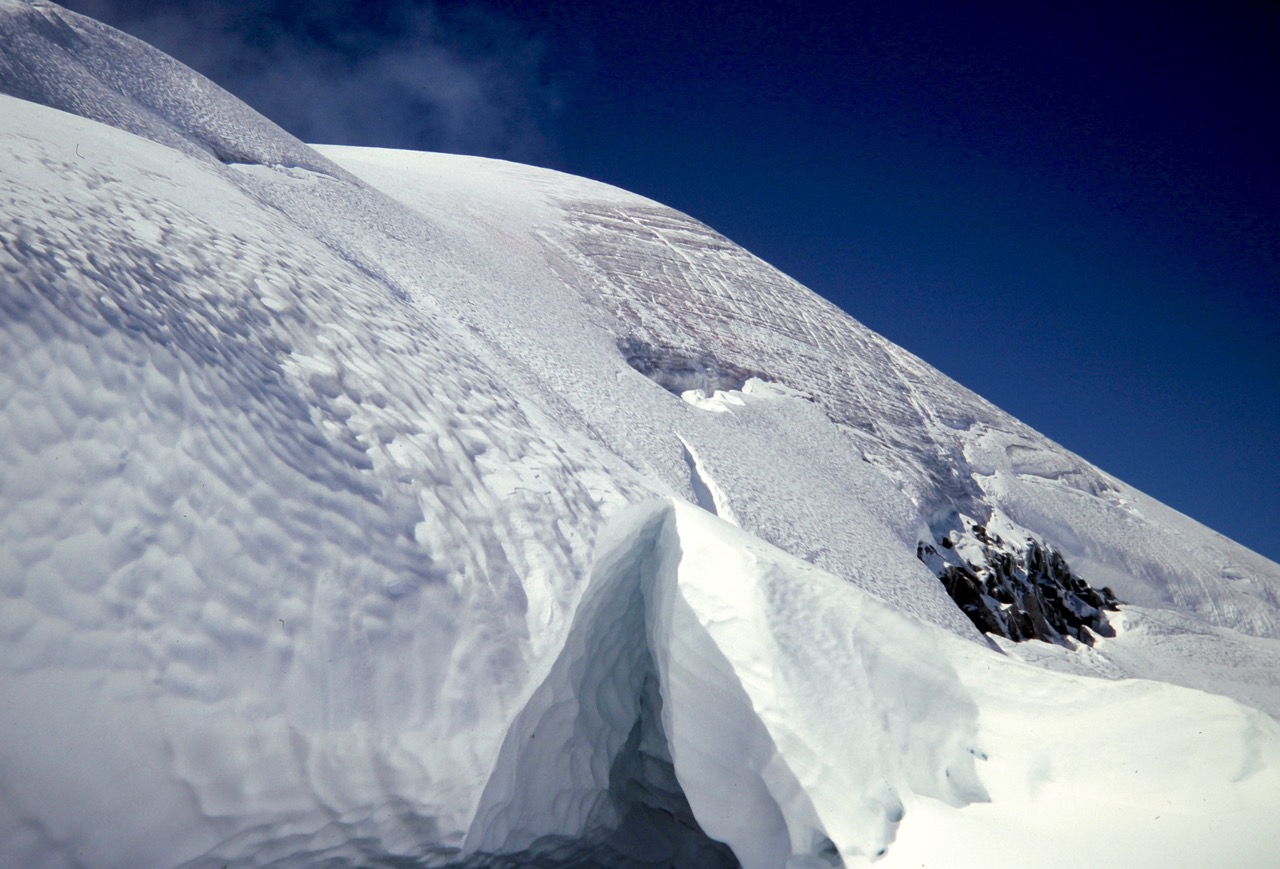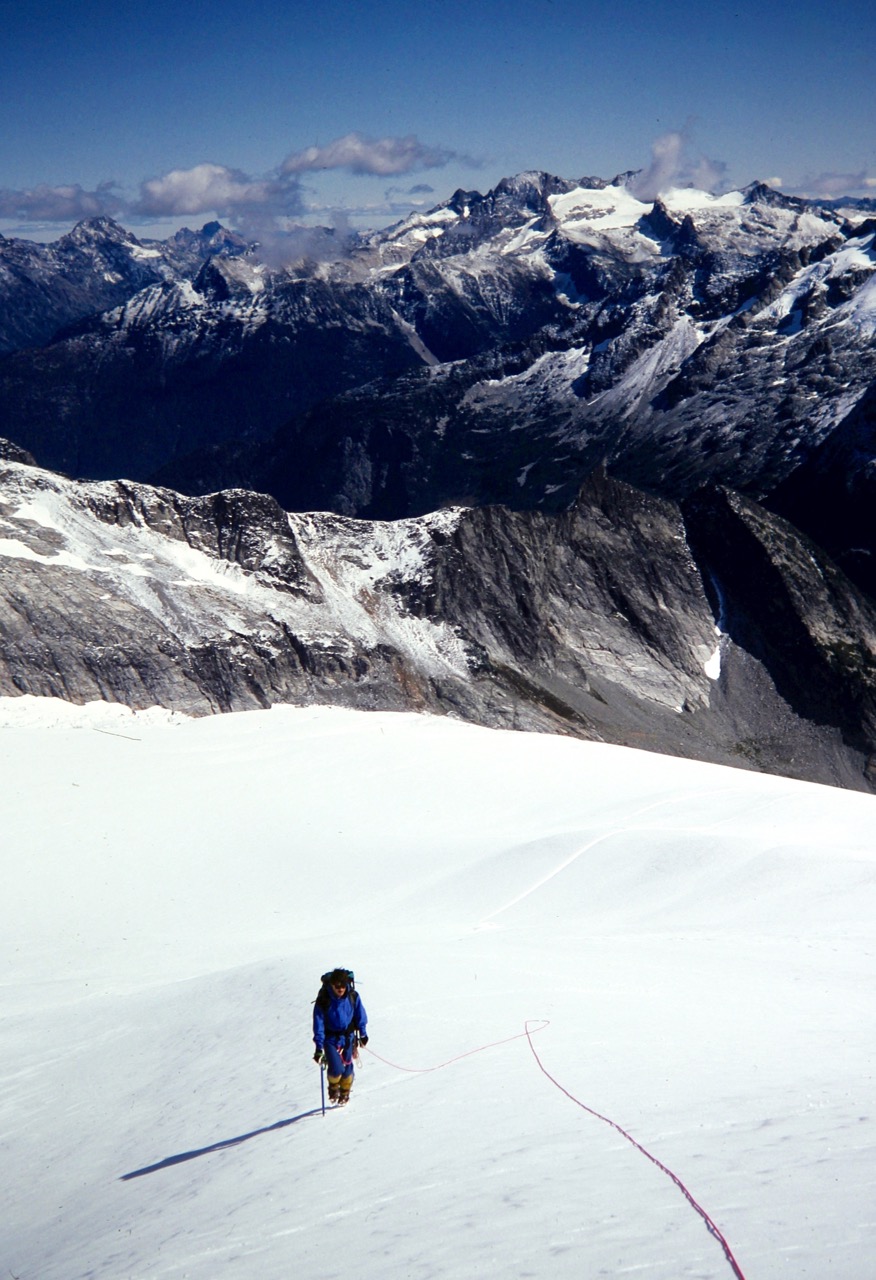 Our ascent was fairly moderate at first but gradually became quite steep and icy, so we roped up. The summit appeared to be a benign snow dome at the top of this slope, so we had no inkling of what lay ahead.