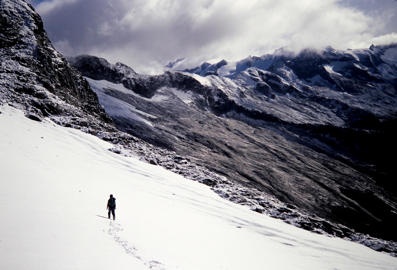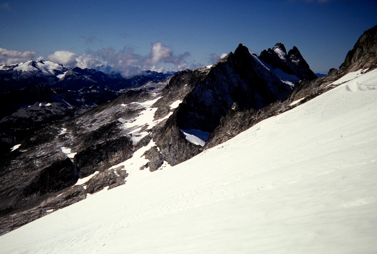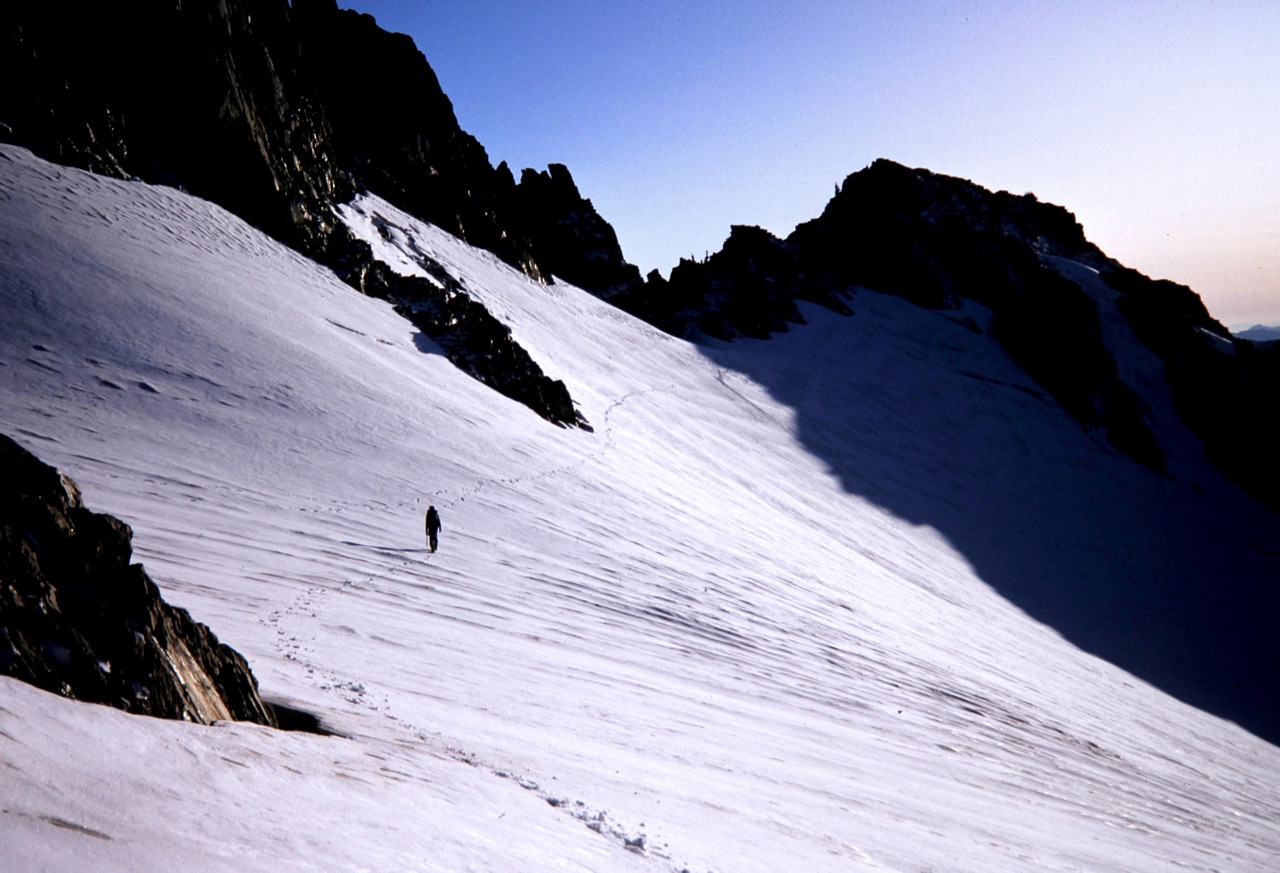 After scrambling down the other side of the col, we continued traversing in a northeasterly direction across unstable, snow-covered talus. It was a great relief to finally get off this treacherous slope and set foot on snowfields. We donned crampons and proceeded across the Roush Creek Cirque, generally aiming for the Eldorado-Inspiration Saddle.