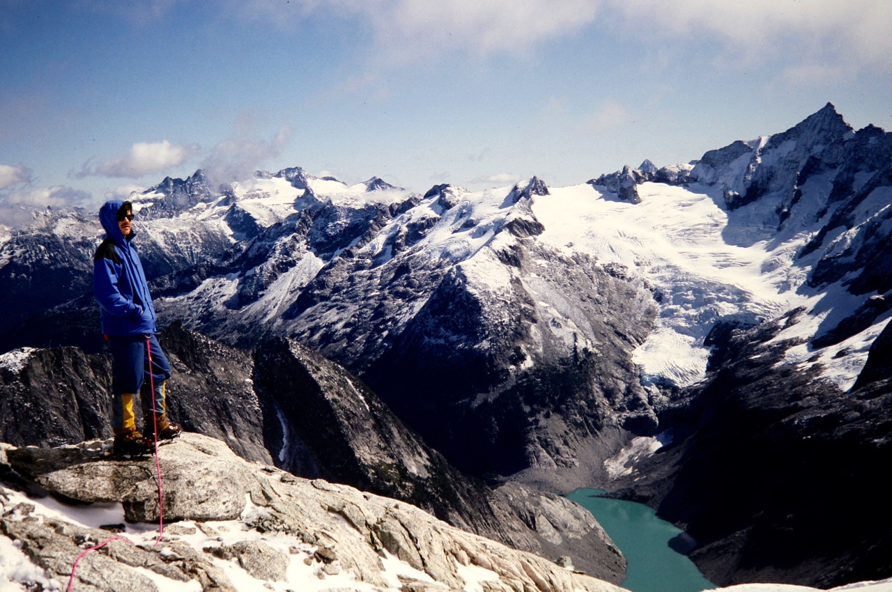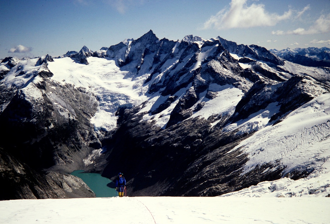 I had taken the lead on the Inspiration Glacier and was completely surprised when the glacier slope abruptly ended at a knife-edge snow arete. Wow! I belayed Craig up to my position, and we both stood there with our eyes and jaws wide open. The snow arete swept upward to join an adjacent arete, thereby forming a perfect pyramid. It looked like something you would expect in the Himalayas or Andes! Craig took the lead and carefully cramponed up the arete, first staying just right of the edge and then crossing over to the left side. We were wishing that we’d brought some pickets or ice screws, so it was an unspoken agreement that if he fell on one side, I would lunge to the opposite side.