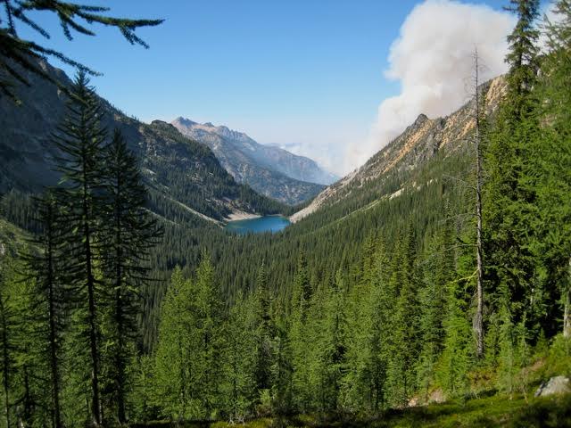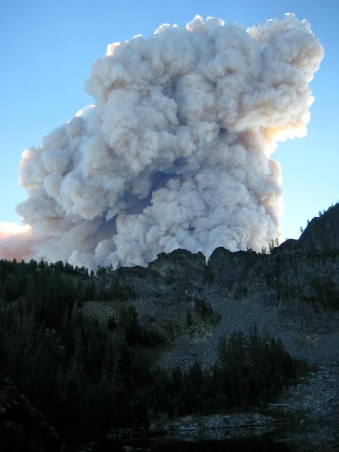 Two miles down the valley, Mirror Lake glimmered in the hot afternoon sun. Farther away, the Wolverine Creek Fire was building up a smoke tower.