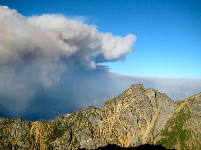 Southwest of us, the air was remarkably clear and blue. It was very reassuring to see many nearby and distant peaks so vividly, since our main concern about the wildfire had been lack of summit views. It now seemed obvious that the fire would not be an issue for the rest of our trip. Right?