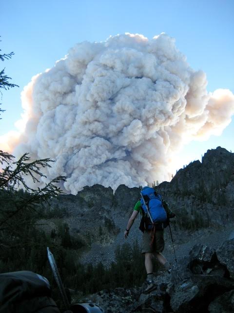 For the first time during our trip, we all felt a sense of…urgency. I suppose an atomic-mushroom-cloud of smoke will do that to a person. We headed west out of the lake basin and traversed over a mile-wide talus field in what had to be record time for us. We didn’t stop until reaching a grassy saddle at the head of Klone Creek. Every time we looked back, the smoke monster seemed to be following us.