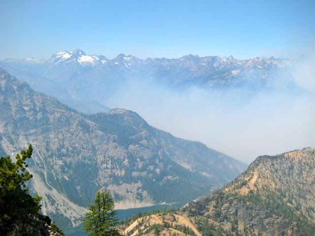 Thick smoke filled Railroad Creek valley to the north, and the surrounding atmosphere was moderately hazy. Nonetheless, we could see as far as Bonanza Peak and Glacier Peak. Mirror Lake looked enticing below.