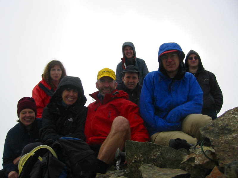 Despite the cold and fog, we socialized on top for nearly an hour. Surprisingly, there were two register tubes: a brass Mountaineers tube with a fairly new book, and an aluminum Alpine Roamers tube with a few paper scraps dating back to 1969. Signing in was an unfamiliar treat for Kim and Stefan, who haven’t yet been bitten by the summit bug. Actually, Sheila hasn’t either, but she does have to live with someone who is badly afflicted, and anyone who knows Don knows that Sheila deserves a medal for tolerance and fortitude!