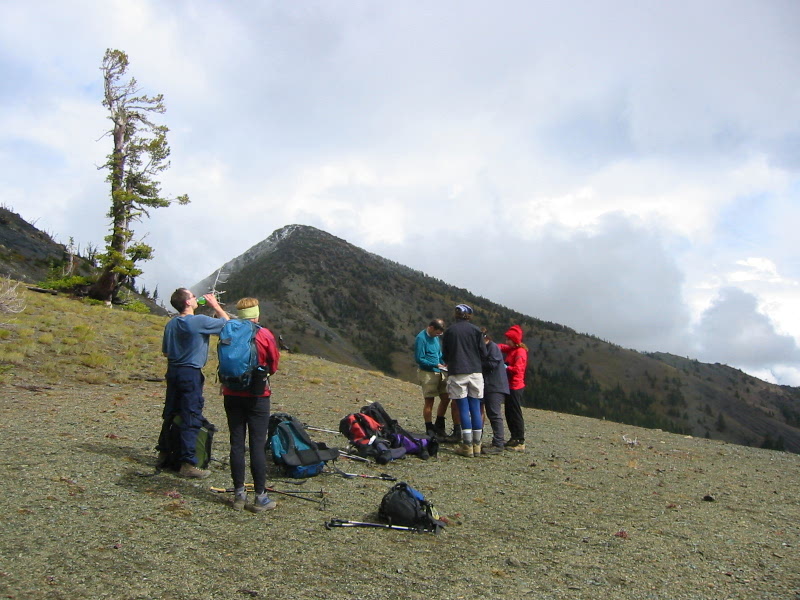Our objective summit was clearly visible a mile to the northeast, but our weather was beginning to deteriorate. Apparently, the Teanaway rain-shadow had reached the limits of its abilities. Don, Steve, and Suzanne decided to make a quick side-trip up Freedom Peak while I marched the others on to Three Brothers. We enjoyed a leisurely hike over to Falls Creek Pass and up the peak’s southwest ridge, which features Class 1-2 terrain decorated with knarled pines and firs. The side-trippers caught us just as we topped out on the gentle summit (4.4 hours from TH).