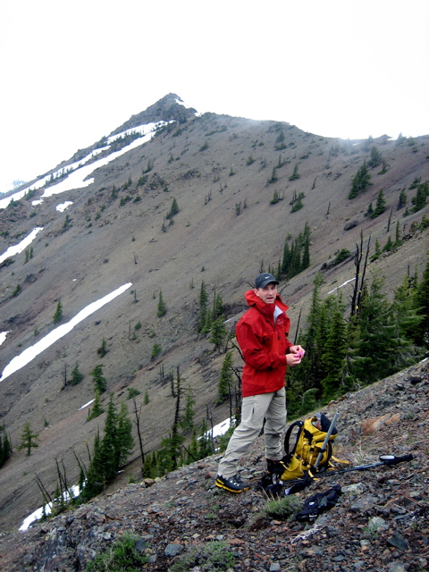 I’ve always been a staunch believer in the Teanaway rainshadow, but it was difficult to keep the faith this morning, as the rain was coming down hard. Fortunately, Kevin was game to get out, regardless of weather. We set our goals low: Freedom Peak (aka Little Navaho Peak), up Stafford Creek. As it turned out, we needn’t have worried; there was perhaps only 15 minutes of spitting rain, and a good hour of mostly sunny skies. otherwise, it was merely cloudy.
