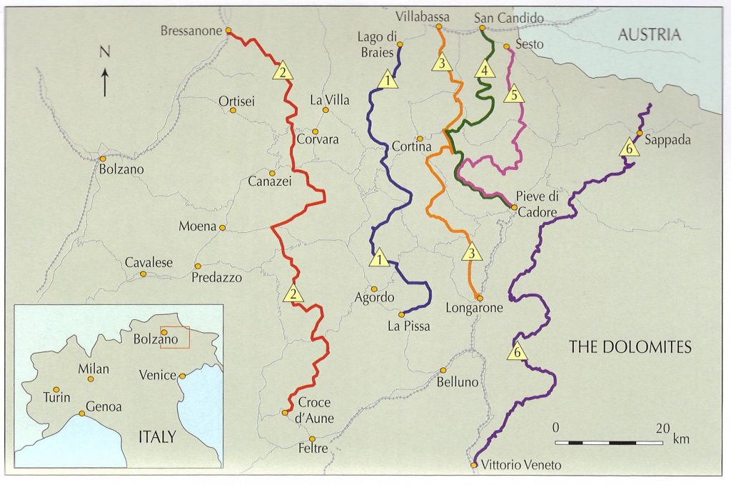 We noted major passes, huts enroute, alternate routes, and via ferrata data.
