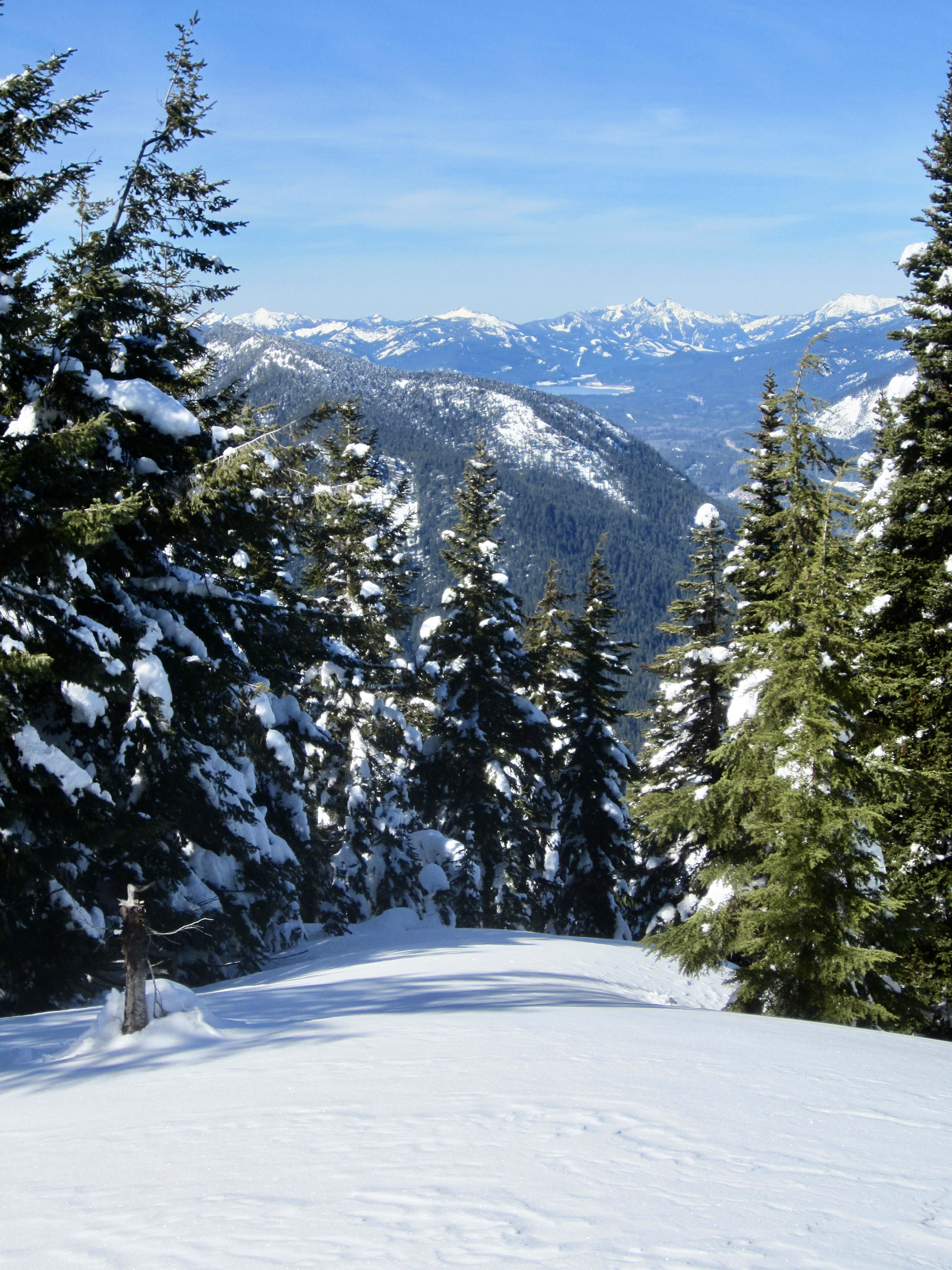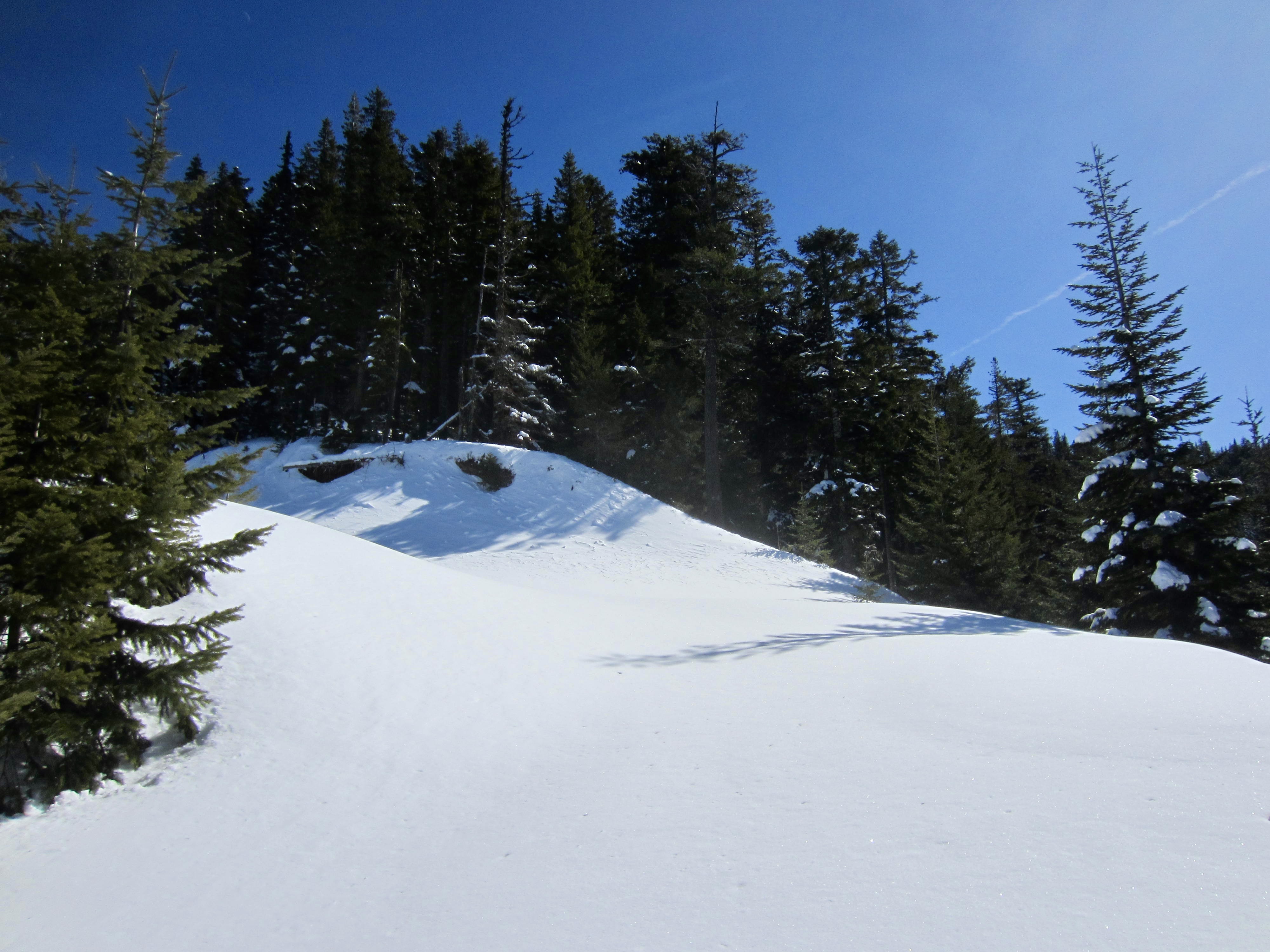 Upon arriving at a major road junction (1.8 hours + 3.2 miles + 1400 feet from sno-park), we veered leftward on Goat Peak Road and descended a short distance to a culvert crossing of upper Cole Creek. Most snowmobiles veer rightward on Cole Butte Road, which leads to wide open slopes on Cole Butte; as such, our left-hand branch was blanketed with 6 inches of untracked snow.
