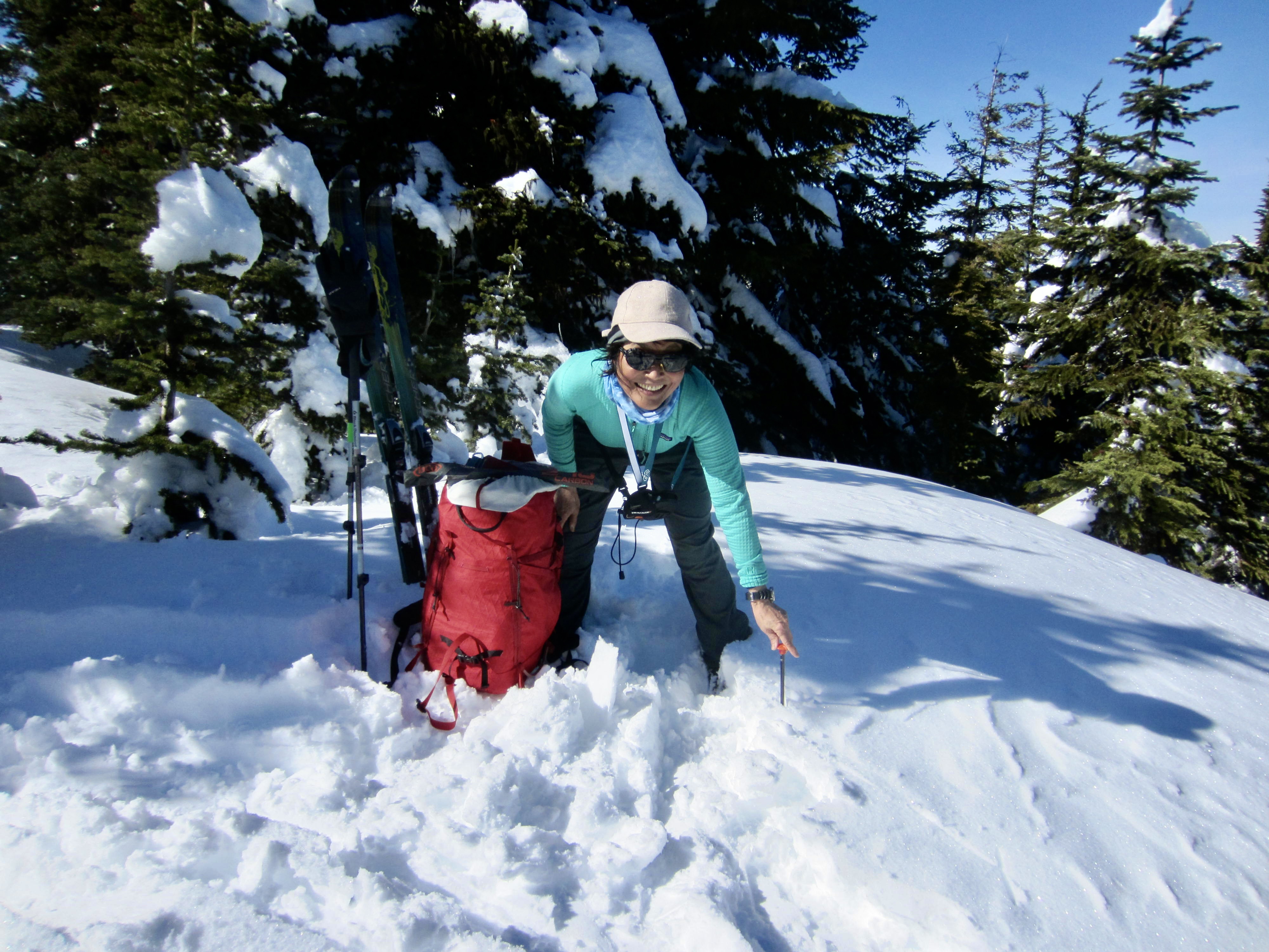 Using her avalanche probe, Yoko measured a snow depth of 8 feet on the summit. This is below normal but probably much greater than it was before the recent storm cycles. It was also interesting to find that the old buried crusts have become much weaker in the past couple weeks.