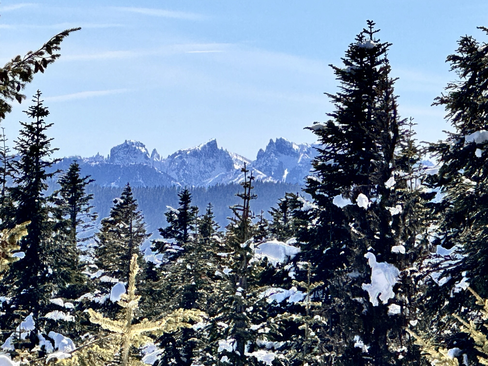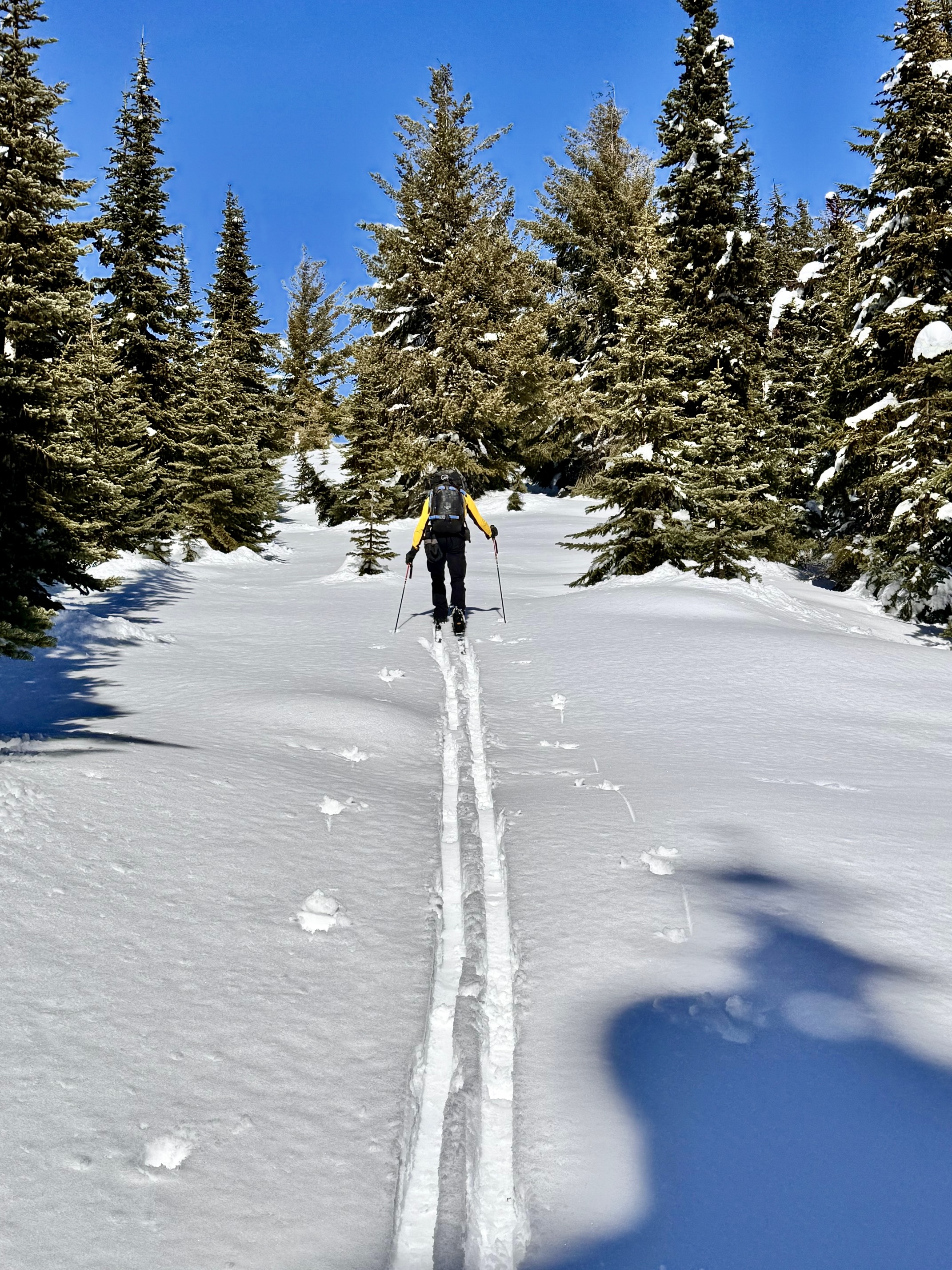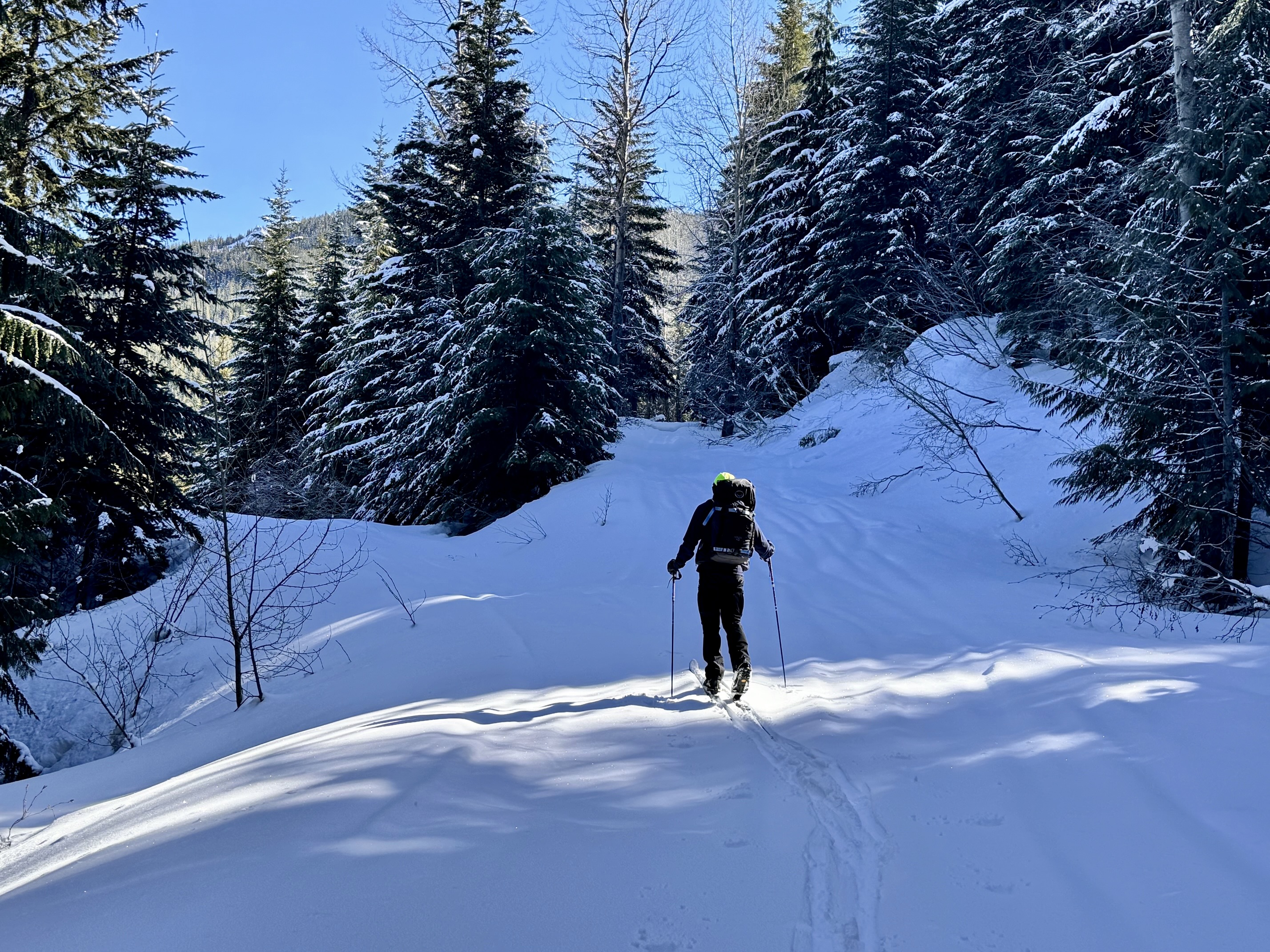 Immediately after crossing over Cole Creek on a partially collapsed wooden bridge, we turned left on Cole Creek Road #4100-140 and began skiing up-valley. This road gains elevation at a moderate gradient but was thoroughly “washboarded” by recent snowmobile traffic.