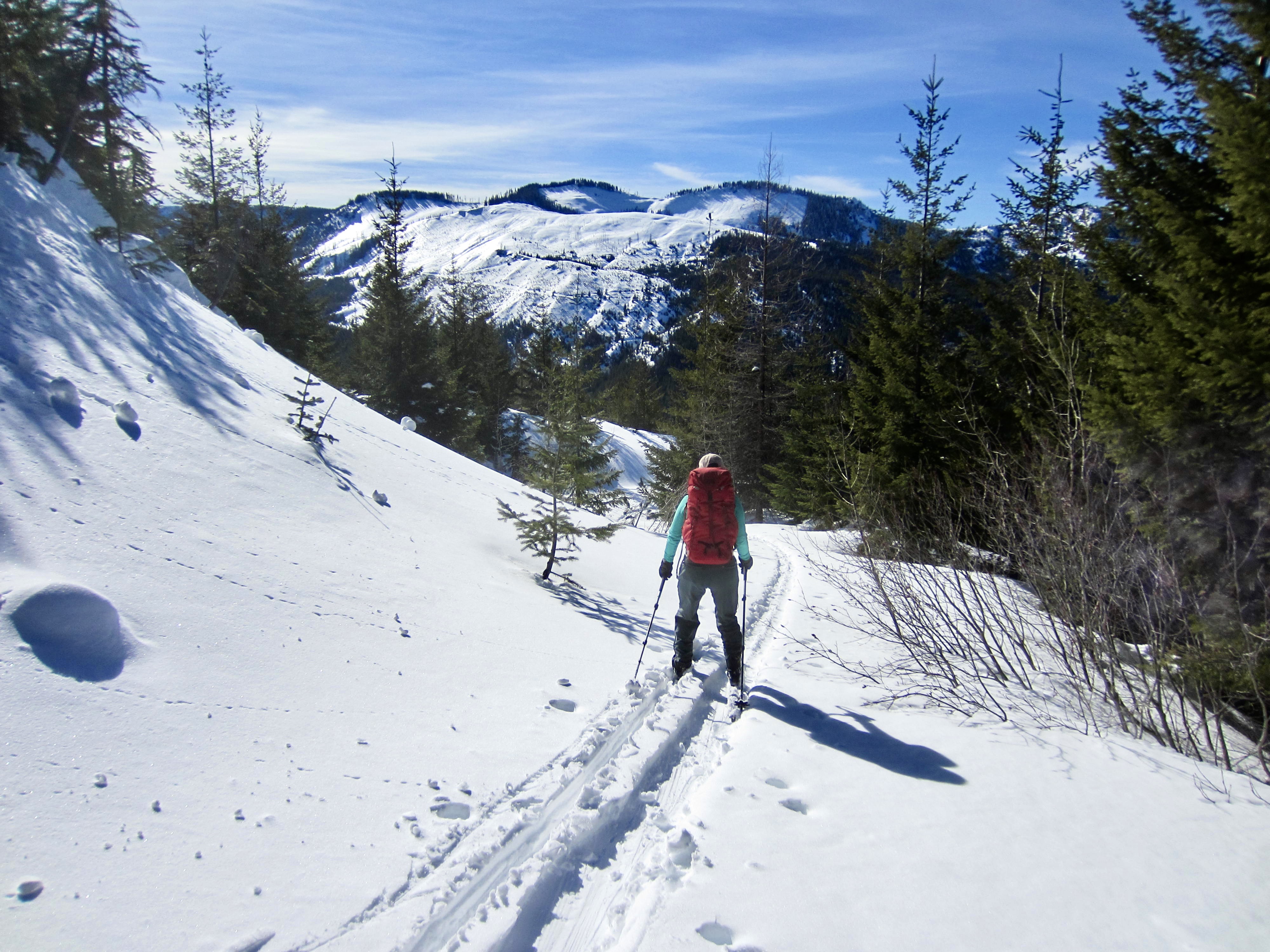 We started at Easton Reload Sno-Park and skied southward on Cabin Creek Road #41, which is very wide, fairly flat, and regularly groomed throughout the winter. In the first mile, it makes a gradual ascent over a low hump that overlooks Cabin Creek, with Cole Butte visible in the distance. The road’s refrozen snow surface necessitated the use of climbing skins despite its gentle gradient.