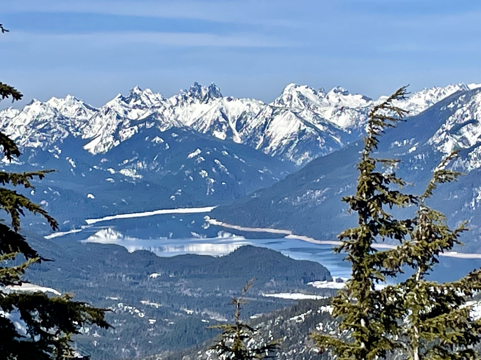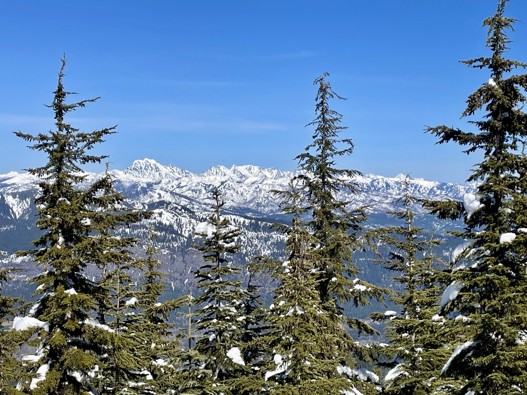 We finally gained the crest of Goat Peak’s south ridge at a point only 200 yards from the summit. Ridge crests are oftentimes narrow and convoluted in the winter, but this one is broad, gentle, and truly delightful! An easy jaunt took us to the wooded summit shortly before 2:00pm (4.8 hours + 2950 feet from sno-park).