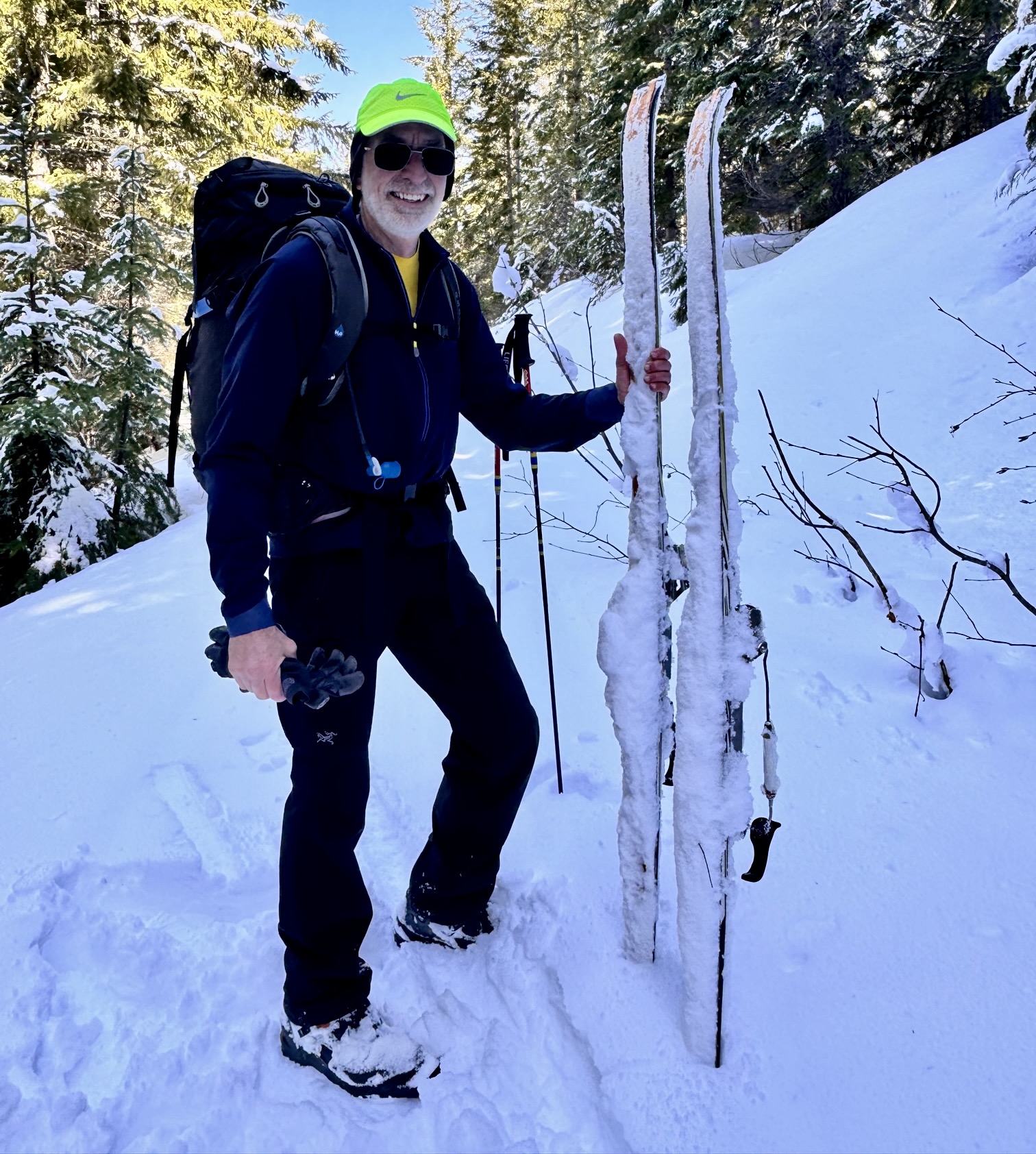 After reaching Cabin Creek Road, a fast kick-and-glide brought us back to the sno-park at 5:30pm (2.5 hours + 150 feet from summit). We both felt more tired than the mileage and elevation stats would suggest, no doubt due to the heavy snow conditions today, but it was definitely worth all the effort!