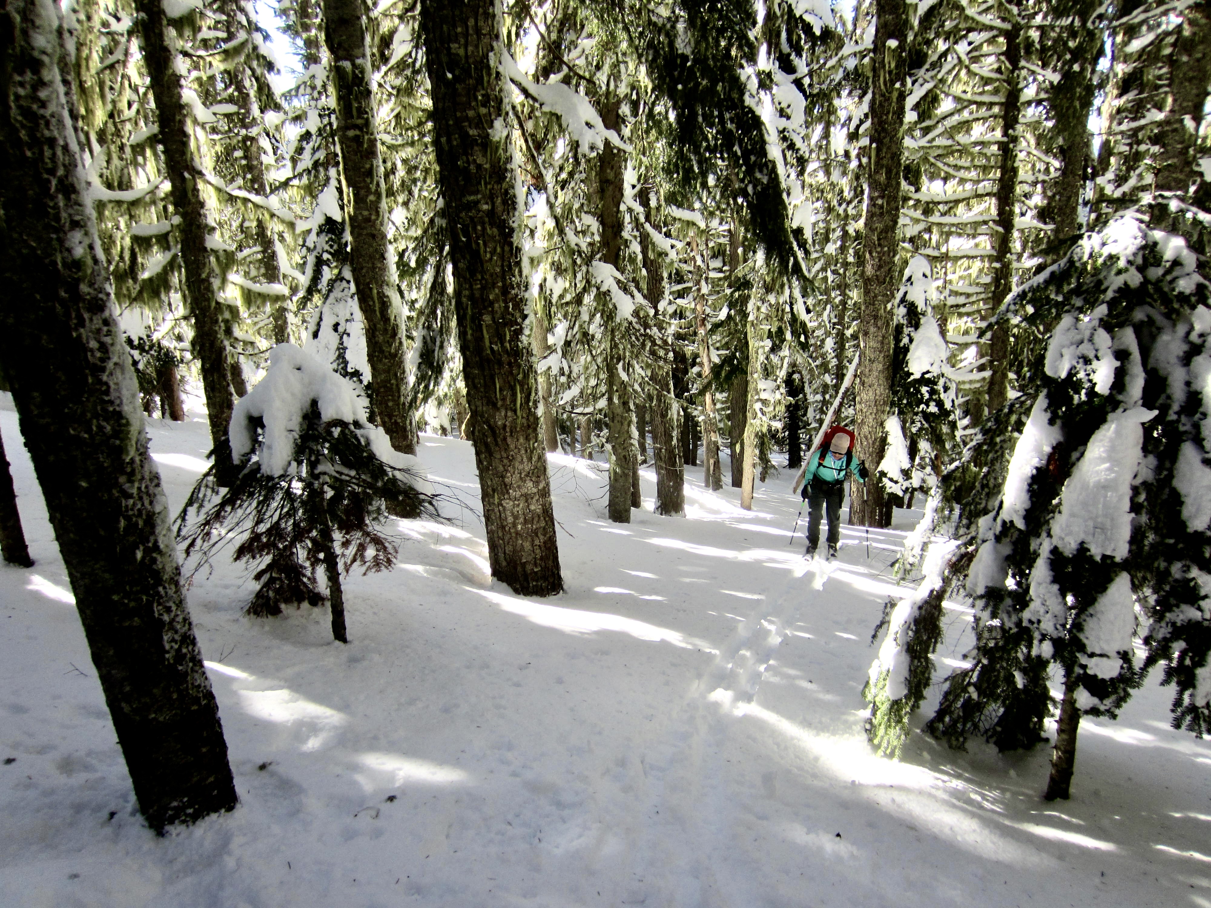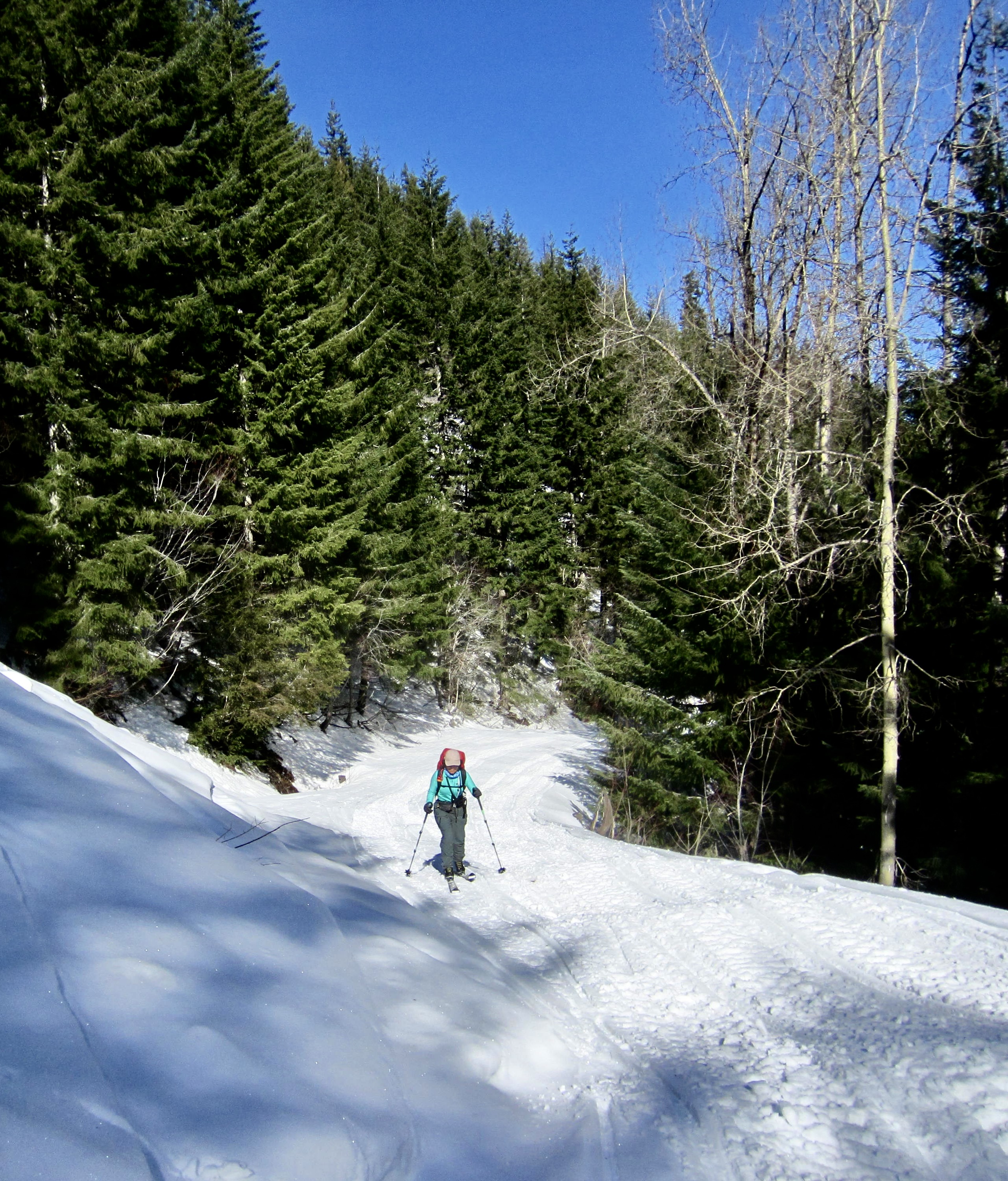 To descend, we kept our skins on our skis and carefully worked down the forest slope, making numerous traverses and kick-turns through the trees. Yep, snowshoes would have been much faster and easier here. The remainder of our descent went more quickly, but the washboard surface on Cole Creek Road was very annoying—much like water-skiing on the open ocean!