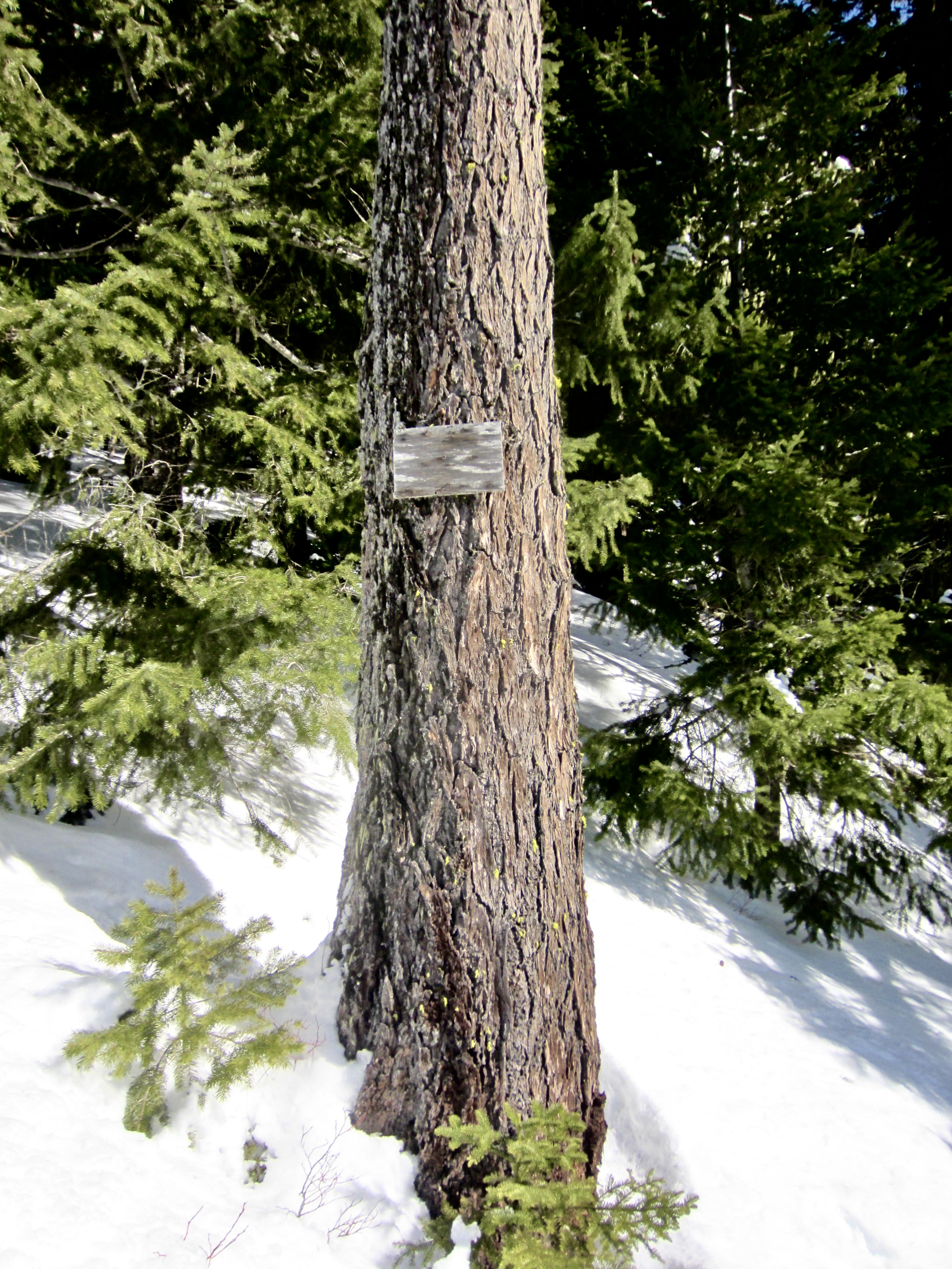 Upon reaching the edge of the clearcut slope at an elevation of about 4550 feet, our road made a wide switchback and angled up to Cole Valley Overlook. We departed from the road at this switchback and headed due eastward into the old-growth forest, passing a small wooden signboard nailed to a tall tree.