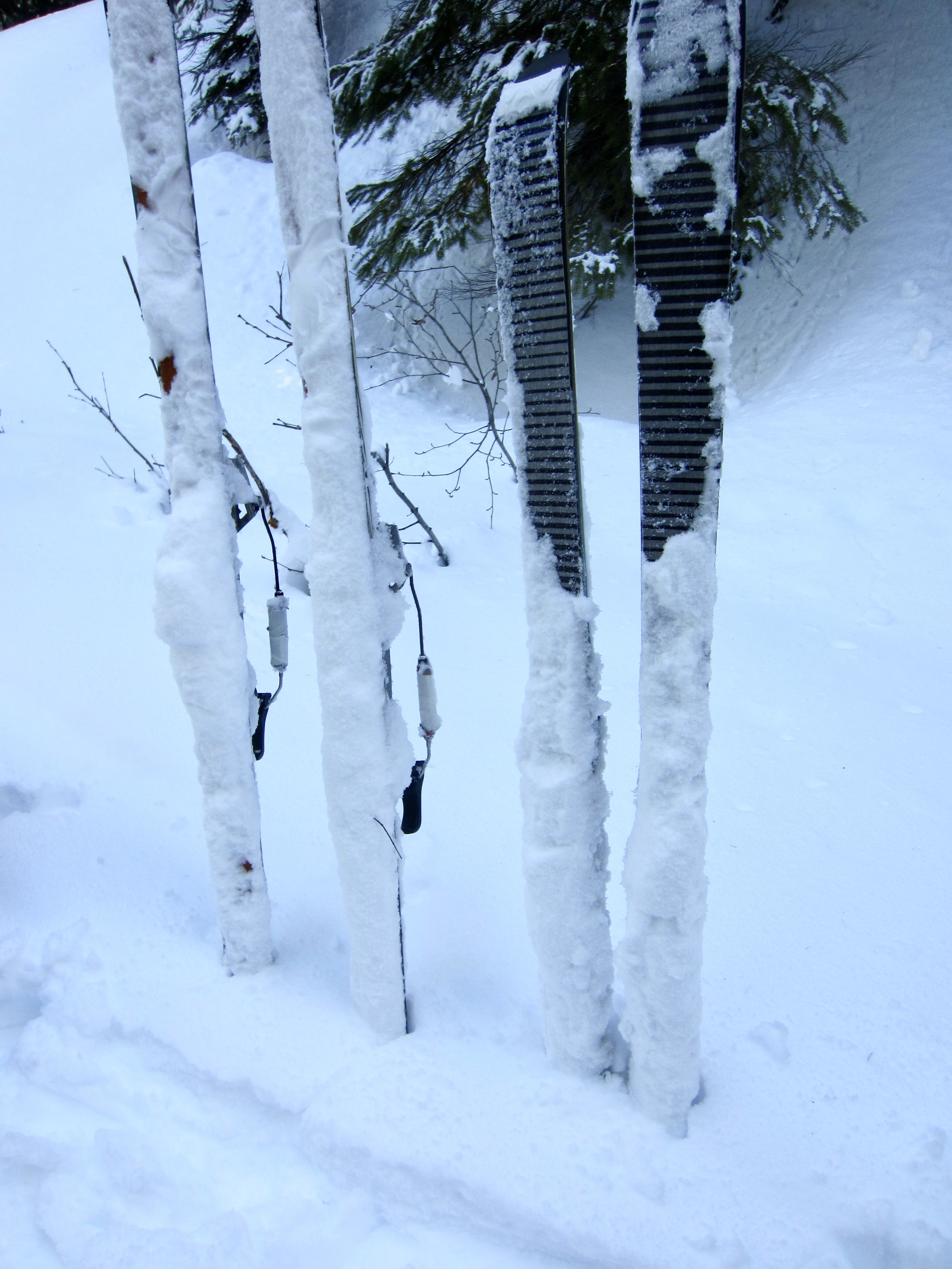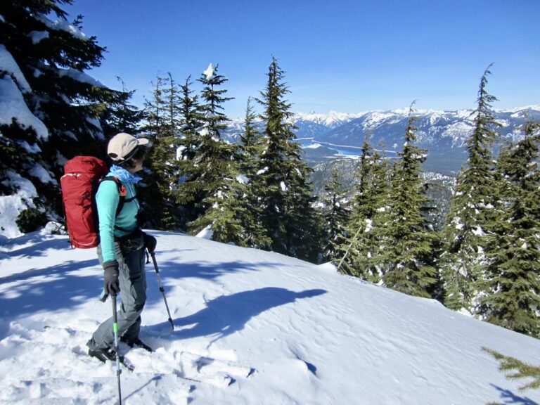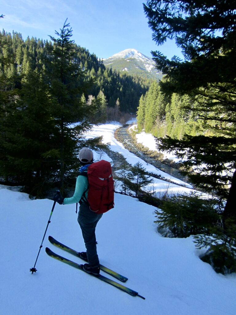For our Goat Peak ascent, Yoko and I used medium-width backcountry nordic touring skis that have a fishscale base, full metal edges, and sturdy 75-mm bindings or NNN-BC bindings, combined with compatible touring boots and full-length climbing skins. This setup proved to be a very suitable compromise for the broad range of terrain that we encountered. However, we both felt that snowshoes would have been far more efficient for the final 500 vertical feet of ascent and descent in the deep forest.