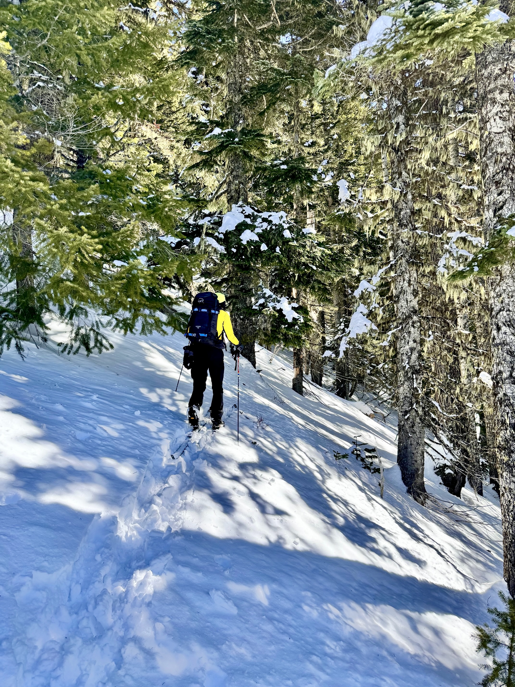 The forest slope was moderately steep and required lots of tedious zigzagging to work around the trees and under low-hanging branches. Yoko and I agreed that this part of the ascent would be much more expedient on snowshoes rather than skis. On a positive note, the forest snow was not at all sticky.