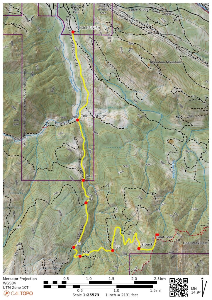 Way Points: Cabin Creek Viewpoint & Cole Creek Bridge & Cabin Creek Road / Cole Creek Road junction & Goat Peak Road / Cole Butte Road junction & Cole Creek culvert & Goat Peak Road fork & Goat Peak Ridge crest & Goat Peak summit (ski tour)