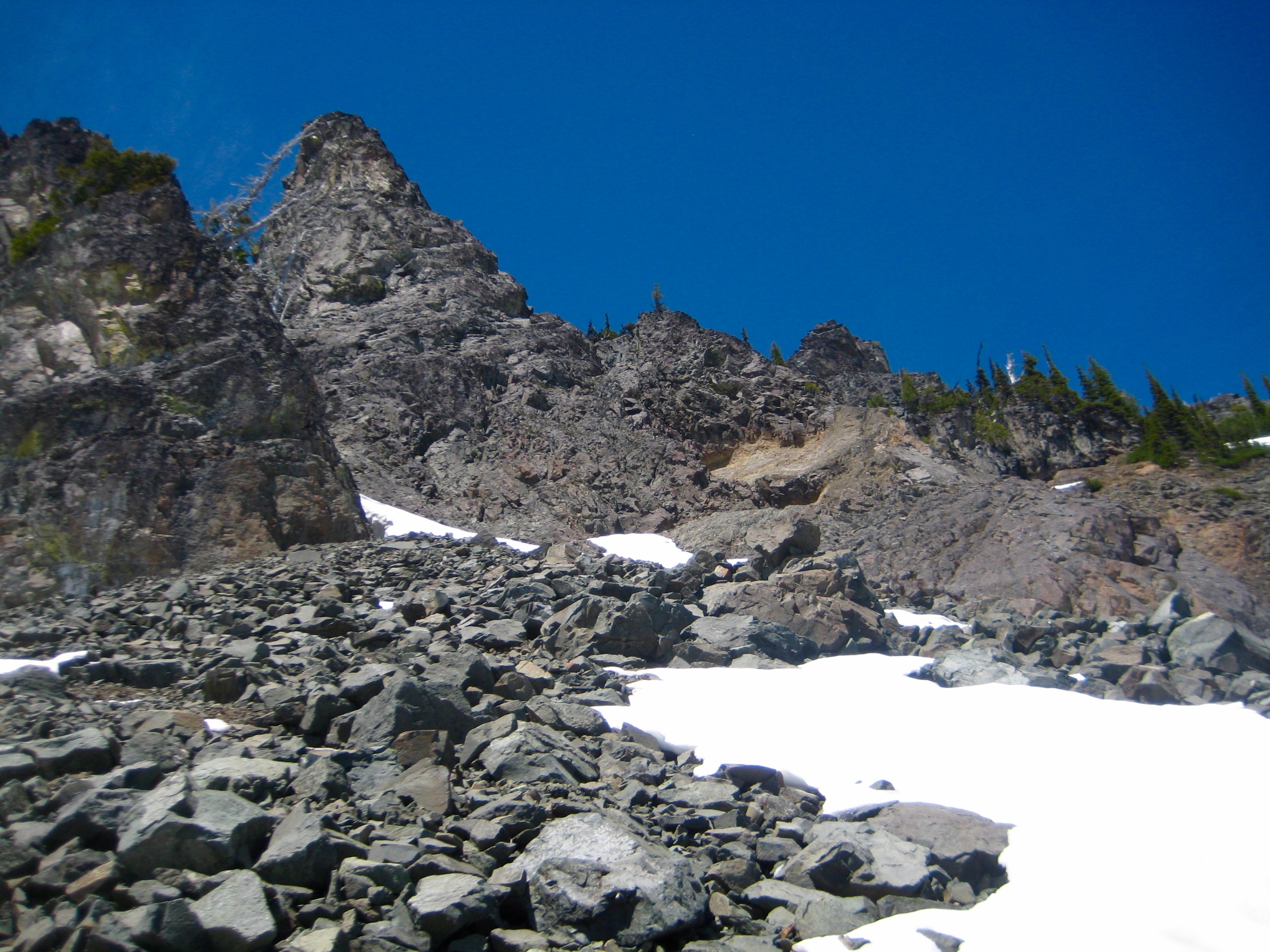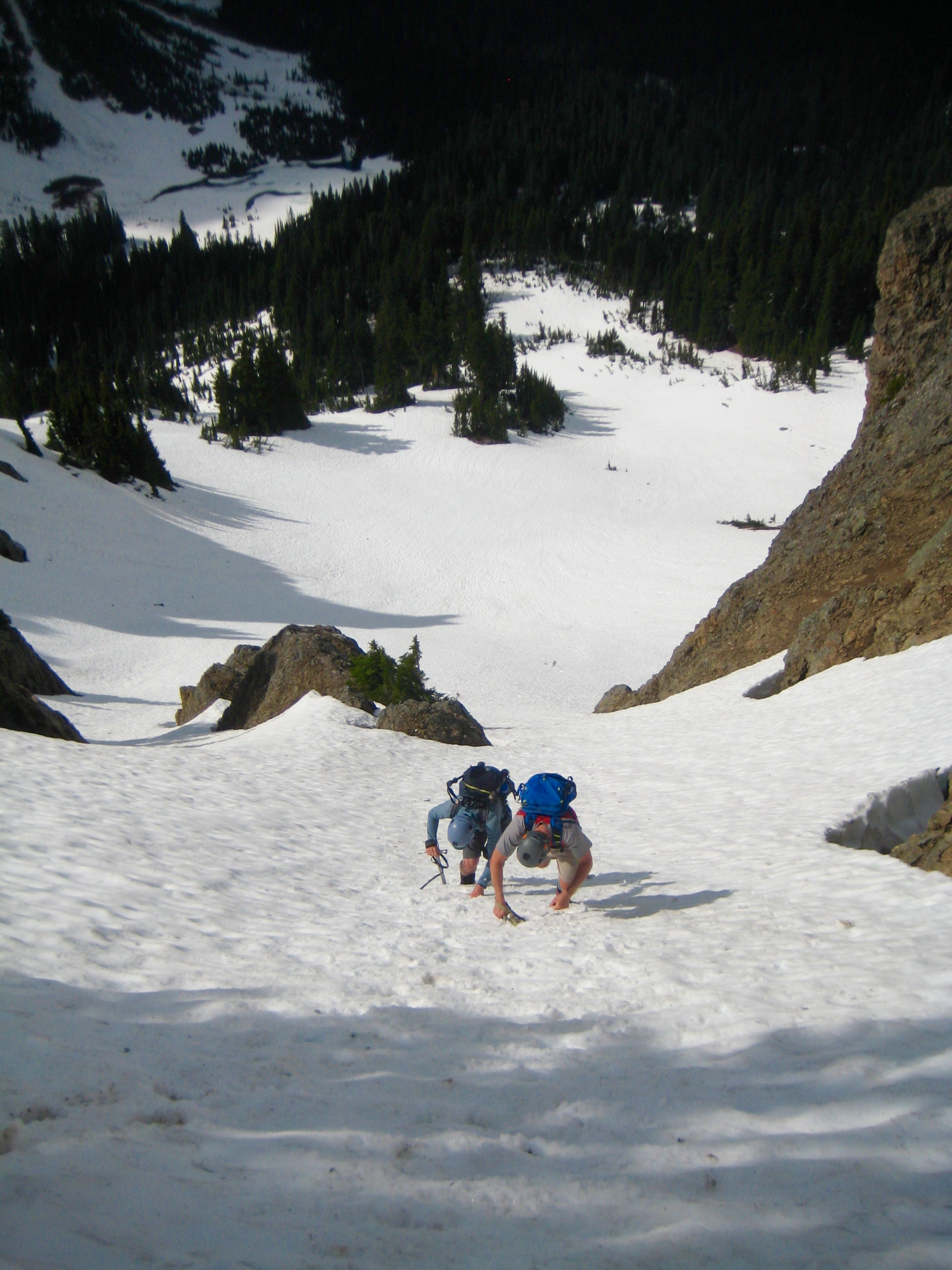 Our descent route went down the west ridge for 350 feet, then down a broad snow couloir to Owyhigh Lakes.