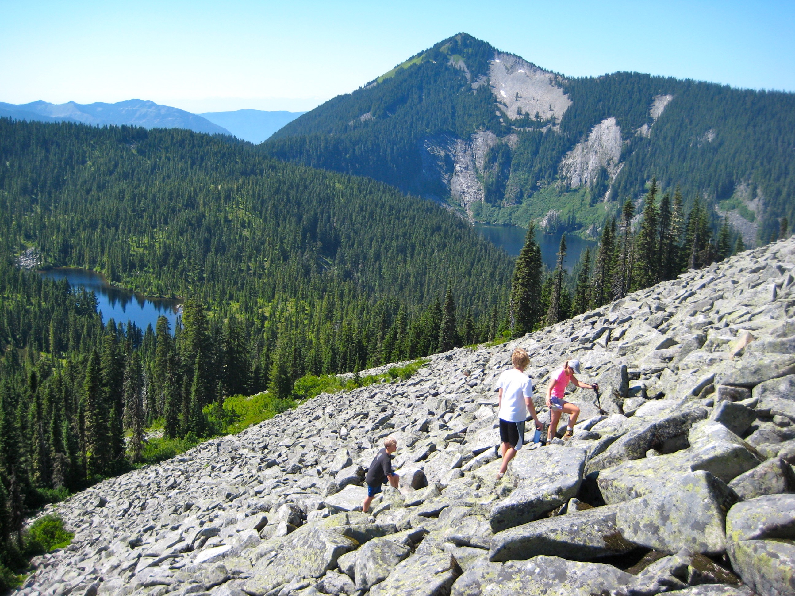 After dropping a car at the Denny Creek TH, we all drove over to the Pratt Lake / Granite Mtn TH and headed up to Pratt Pass.  Sarah and Nita proceeded over the pass in order to get us a campsite down at Lower Tuscohatchie Lake.  Meanwhile, Eileen, Derek, Thomas, and I took a sidetrip over to the Talapus Lake Overlook and scrambled up Pratt Mountain.