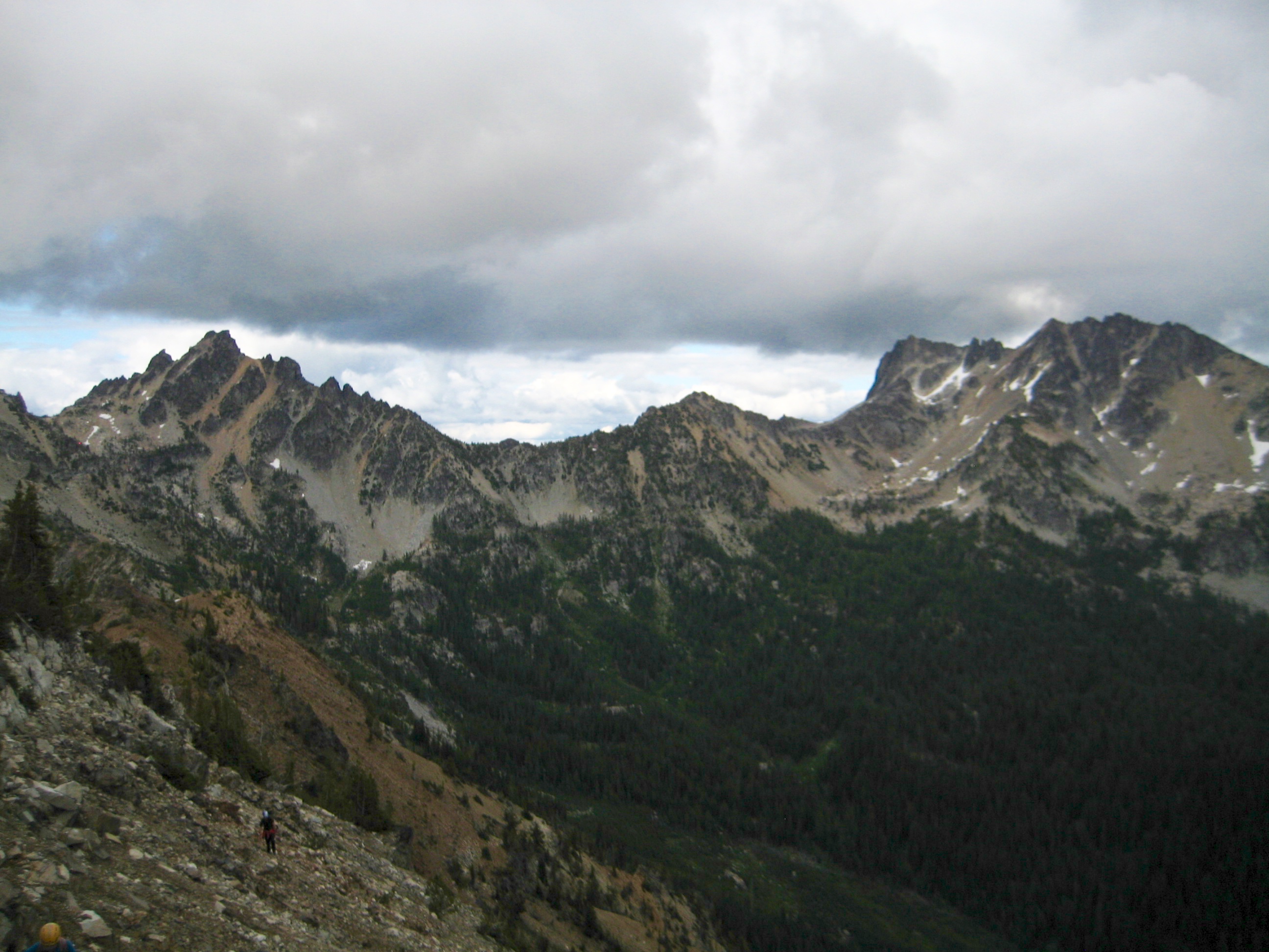 After having our planned weeklong trip to the Olympics rained out, Tony, Susie, Eric, David, Lisa, Kevin, Eileen, and I quickly shifted gears and headed to the Chelan Mountains. In a normal July, the Chelan Mountains would be uncomfortably hot, but this July has been far from normal. What we got was a lot of pleasantly cool weather, as well as some unpleasantly frigid weather and an unusual amount of rain. Nonetheless, we all had a fun trip with plenty of trail miles, summit views, and camp chatter.