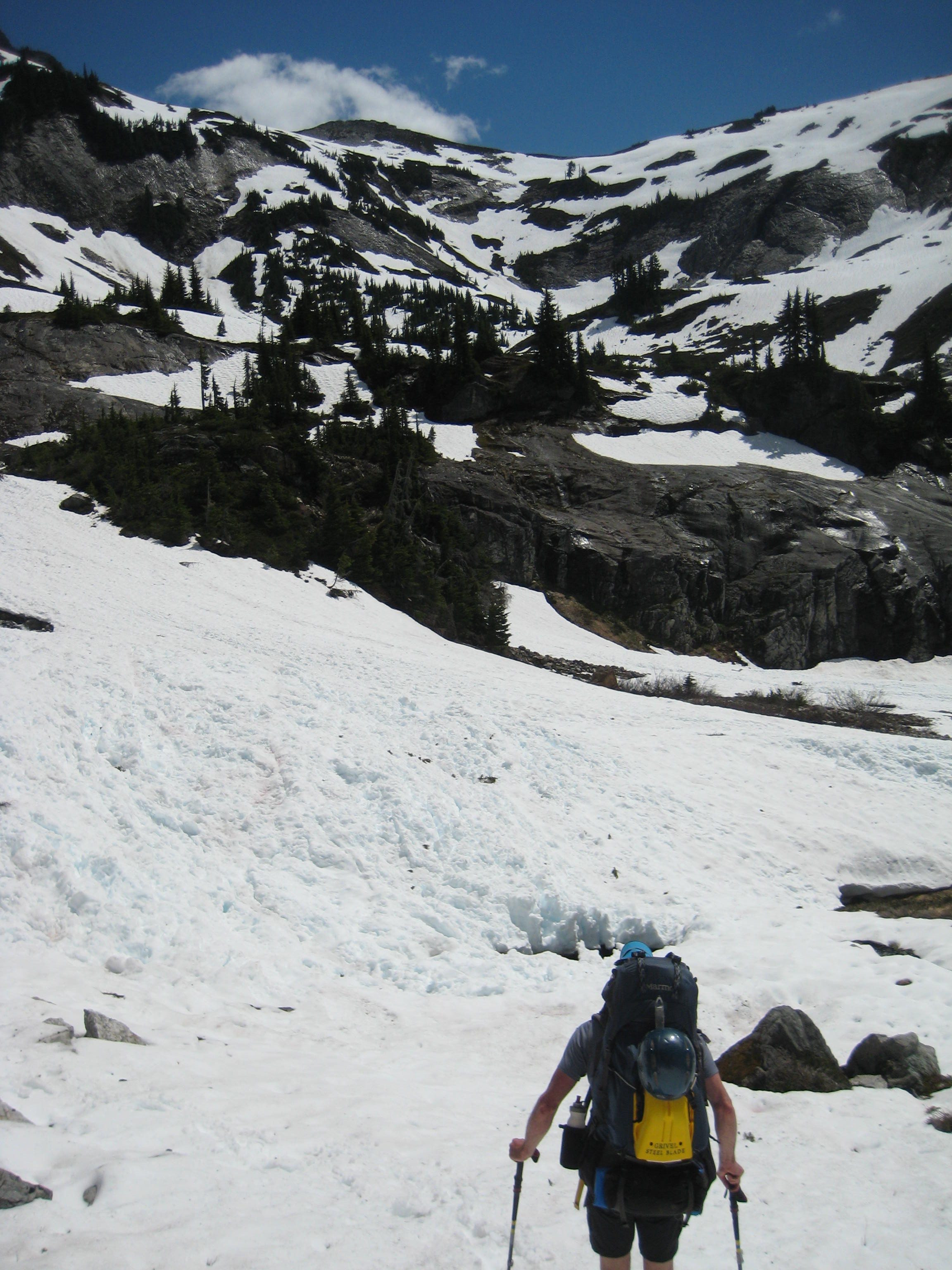 We continued up through Cub Lake Meadows and over Itswoot Ridge, then made a long traverse over to the Dome Glacier. Â Snow coverage was approximately 95 percent.