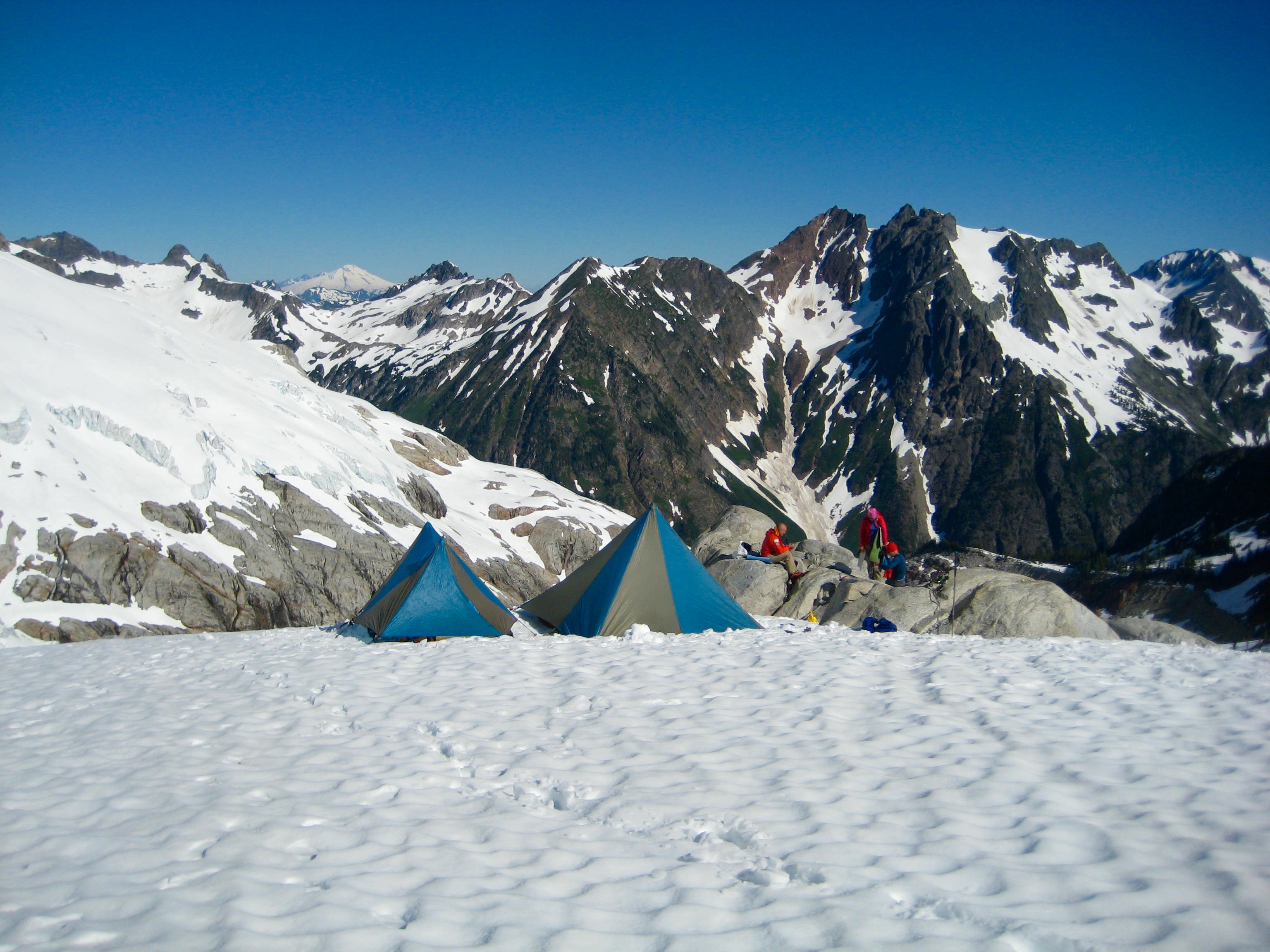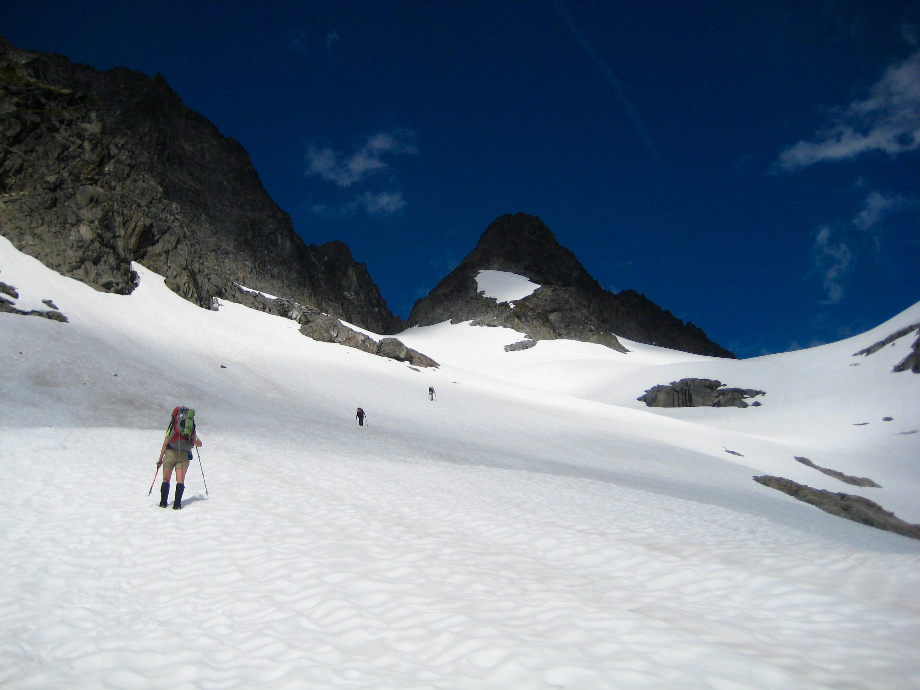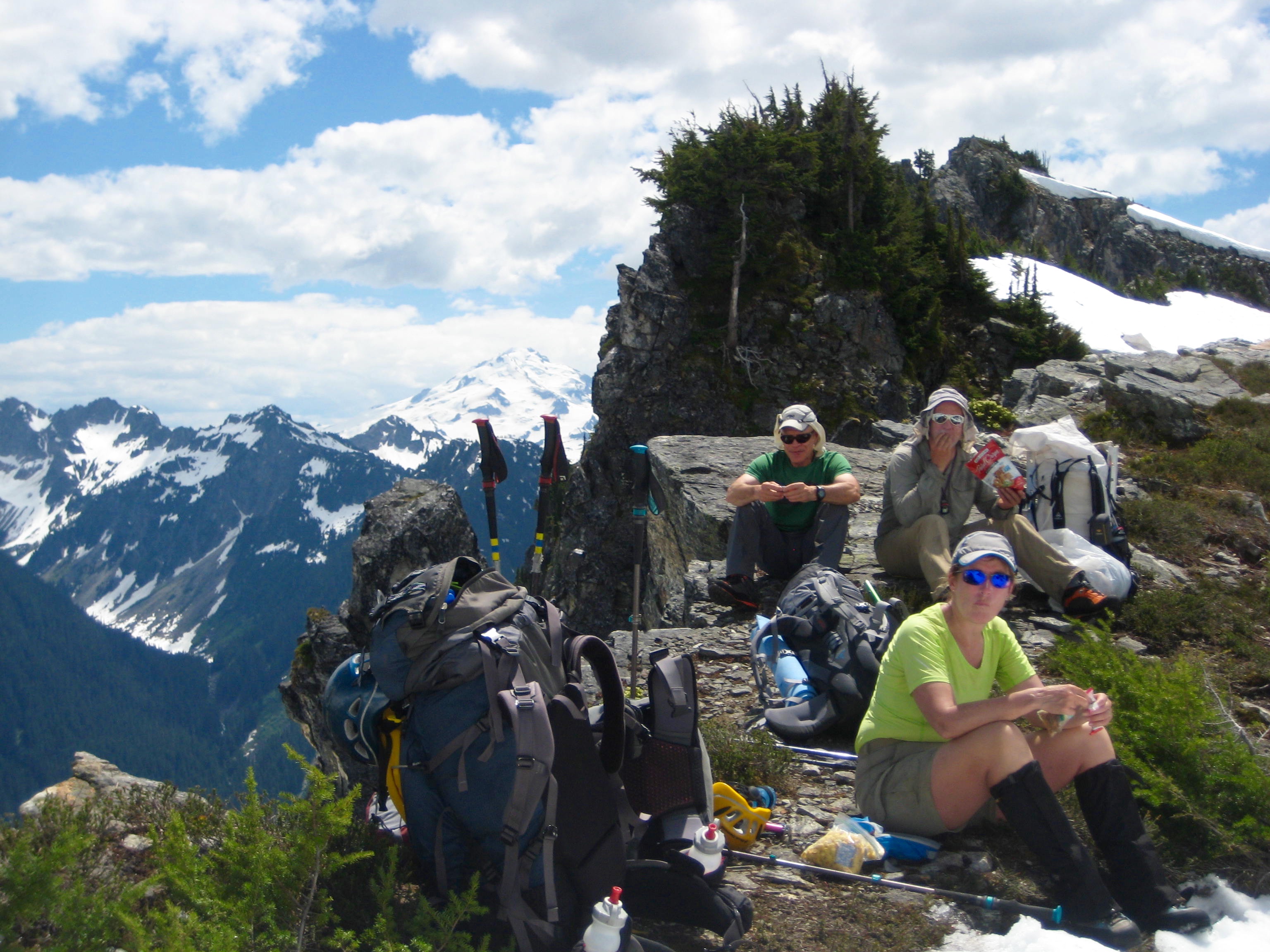 Although light fog had hung over the meadows throughout much of the night, it was completely gone by morning. We had a leisurely breakfast in the sun before Kevin and George wandered off to chat up some of the other campers. One party comprised a dozen NOLS instructors and students, all heading over to Dome Peak. We were also surprised to see two trekkers carrying backcountry skis and wearing telemark boots. This pair turned out to be James Hamaker and David Burdick, who were just completing a ski version of the Ptarmigan Traverse.