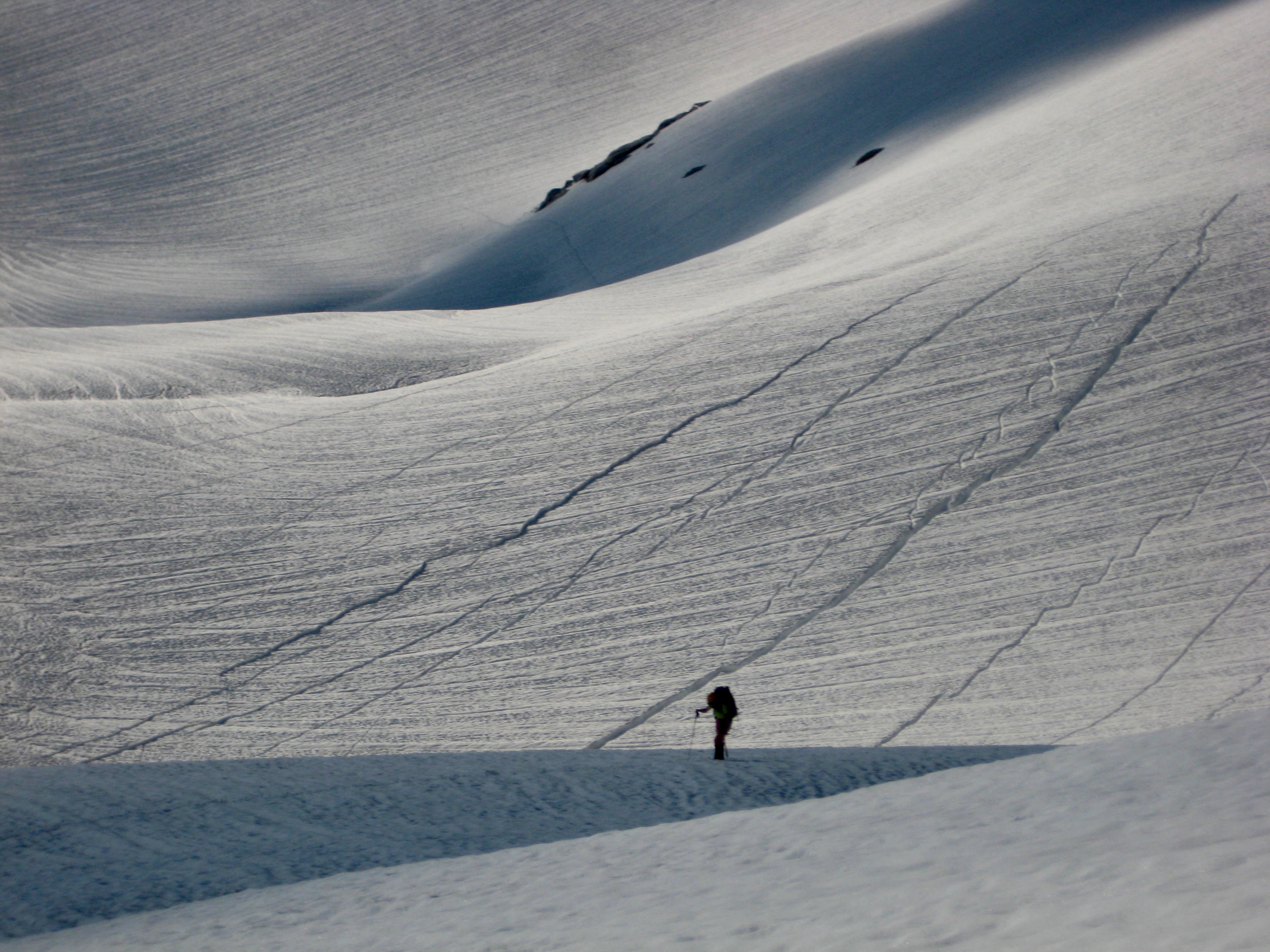 By staying high on the Dome Glacier, we were able to skirt all of the large crevasses. The prevalent “hairline” crevasses were easily stepped over.