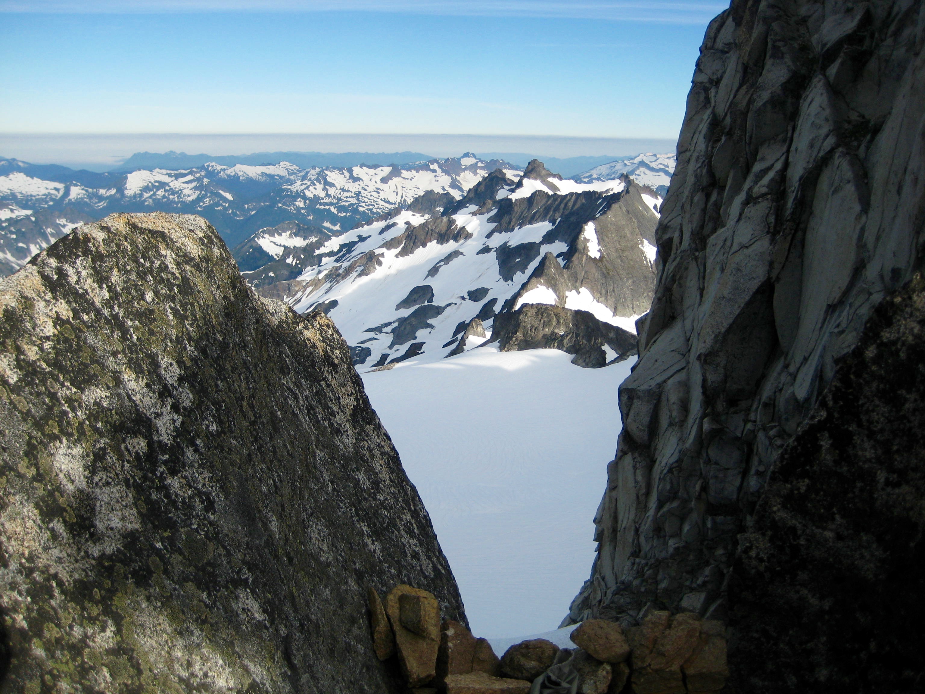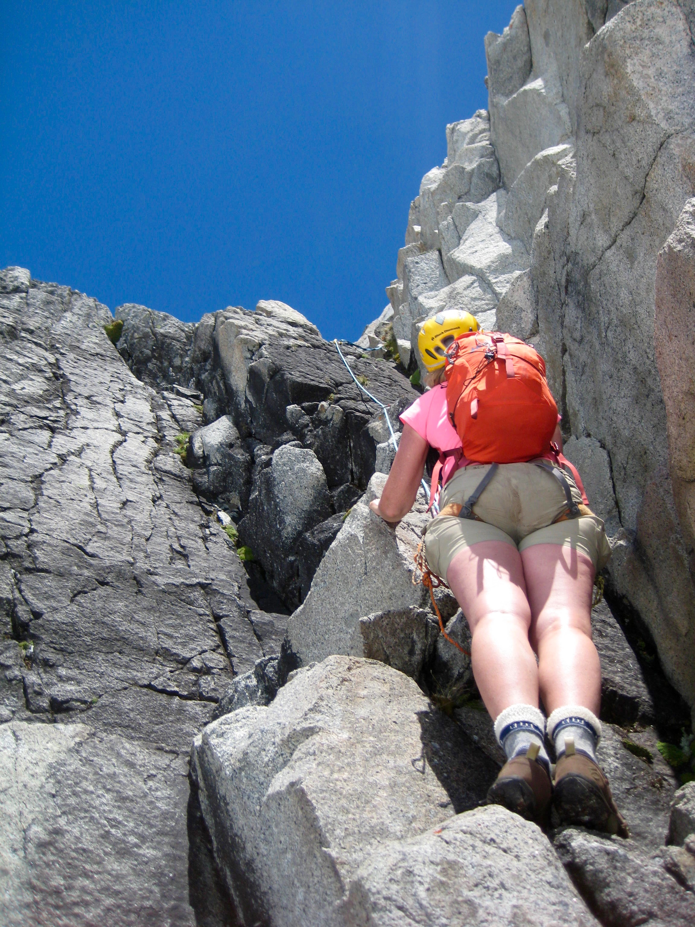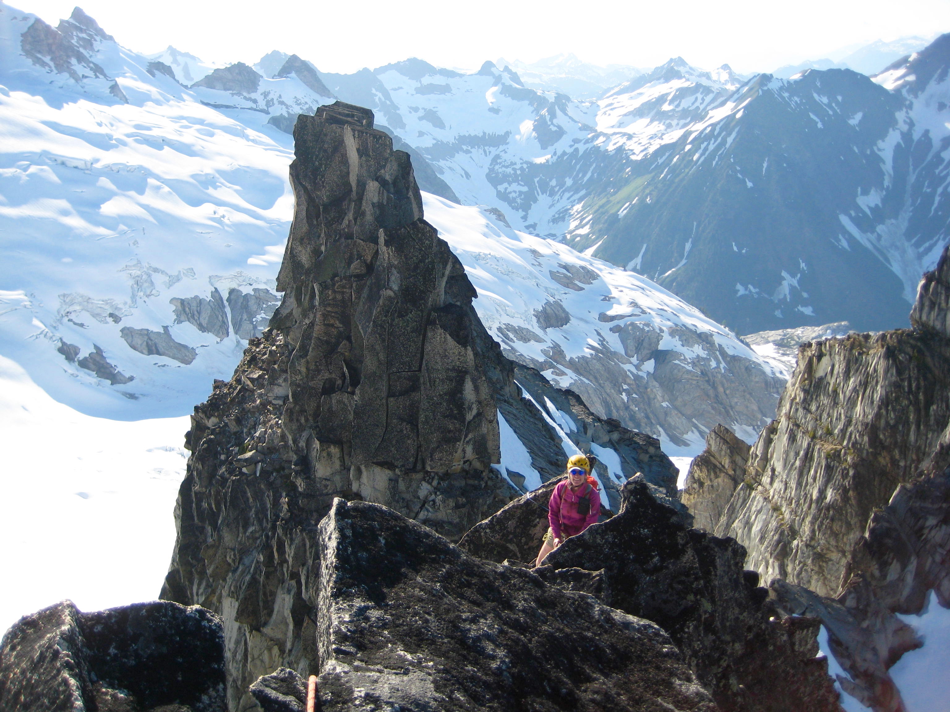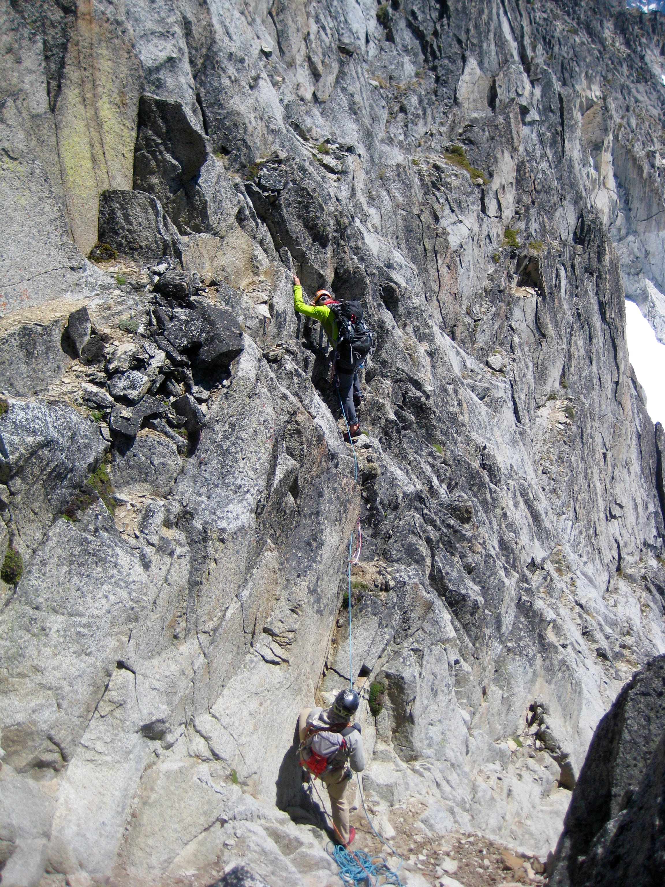 A series of short chimneys and cracks ranging up to Class 5.5 ended at the ridge crest adjacent to a large horn adorned with numerous rappel slings. This rappel station provided a welcome confirmation that we were truly on route.