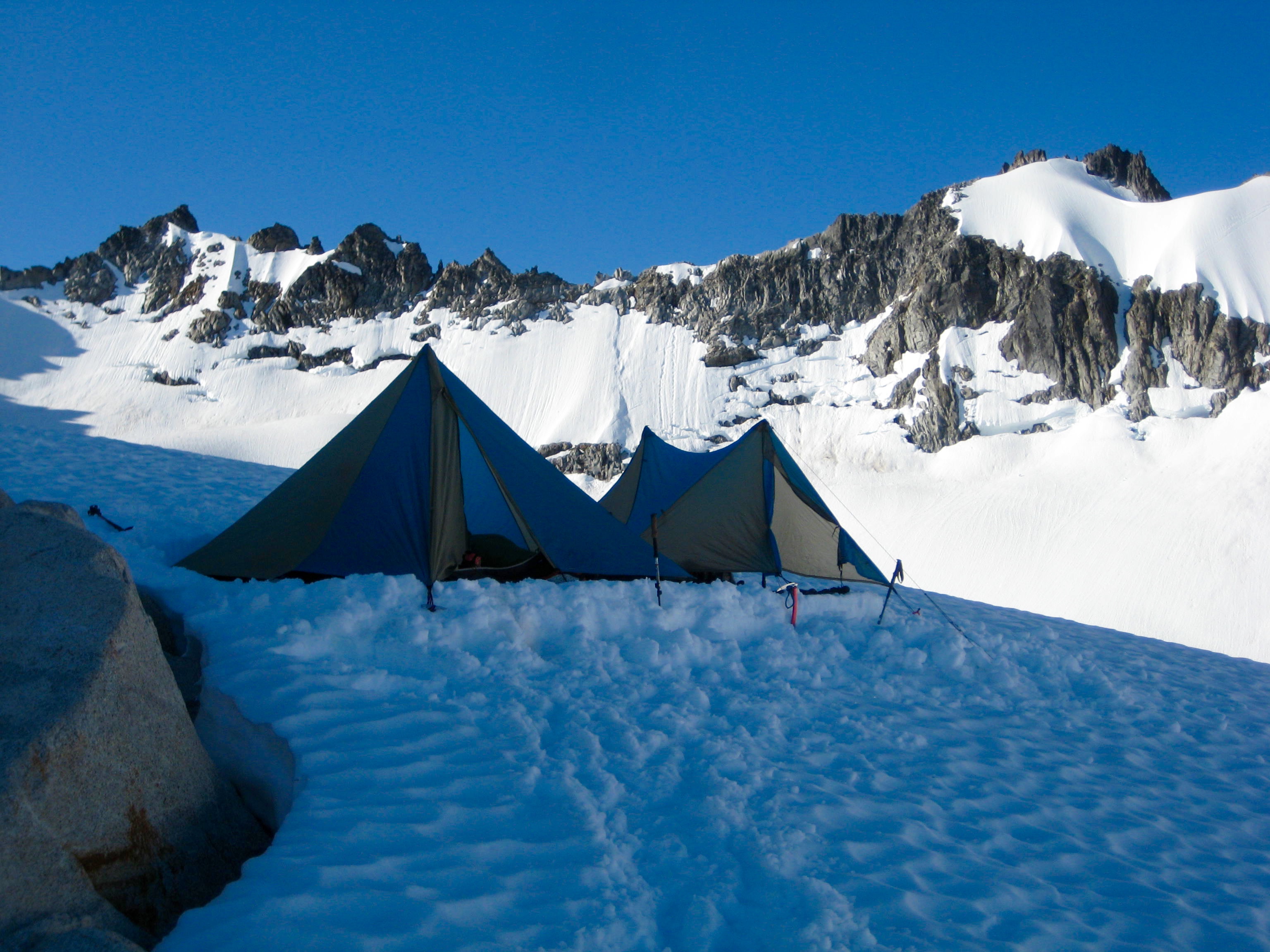 There is a well-established campsite at the Chikamin-Dome Col, with enough room for a small tent or several bivouac sacks. After a half-hour of earthwork, we were able to enlarge the site sufficiently to accommodate George’s four-person pyramid tent.