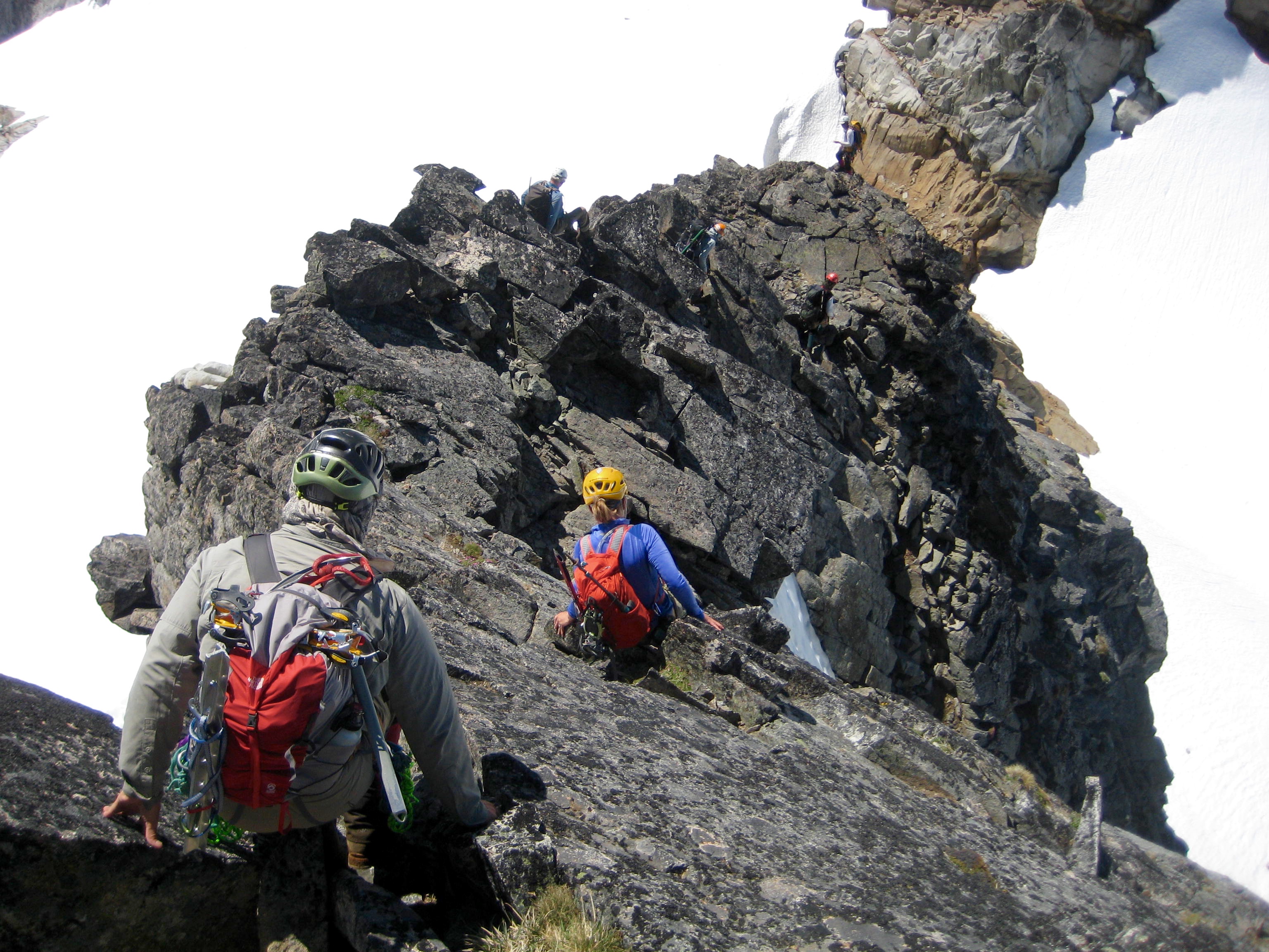 Rather than down climb the ugly gully, we followed the other party down the lower west ridge. This relatively new route involves some white-knuckle Class 3-4 scrambling on semi-solid rock. A fixed sling had been placed at one particularly tricky location, and there was considerable exposure along much of the route. We were happy to finally reach the gentle slopes of the Dome-Sinister saddle.