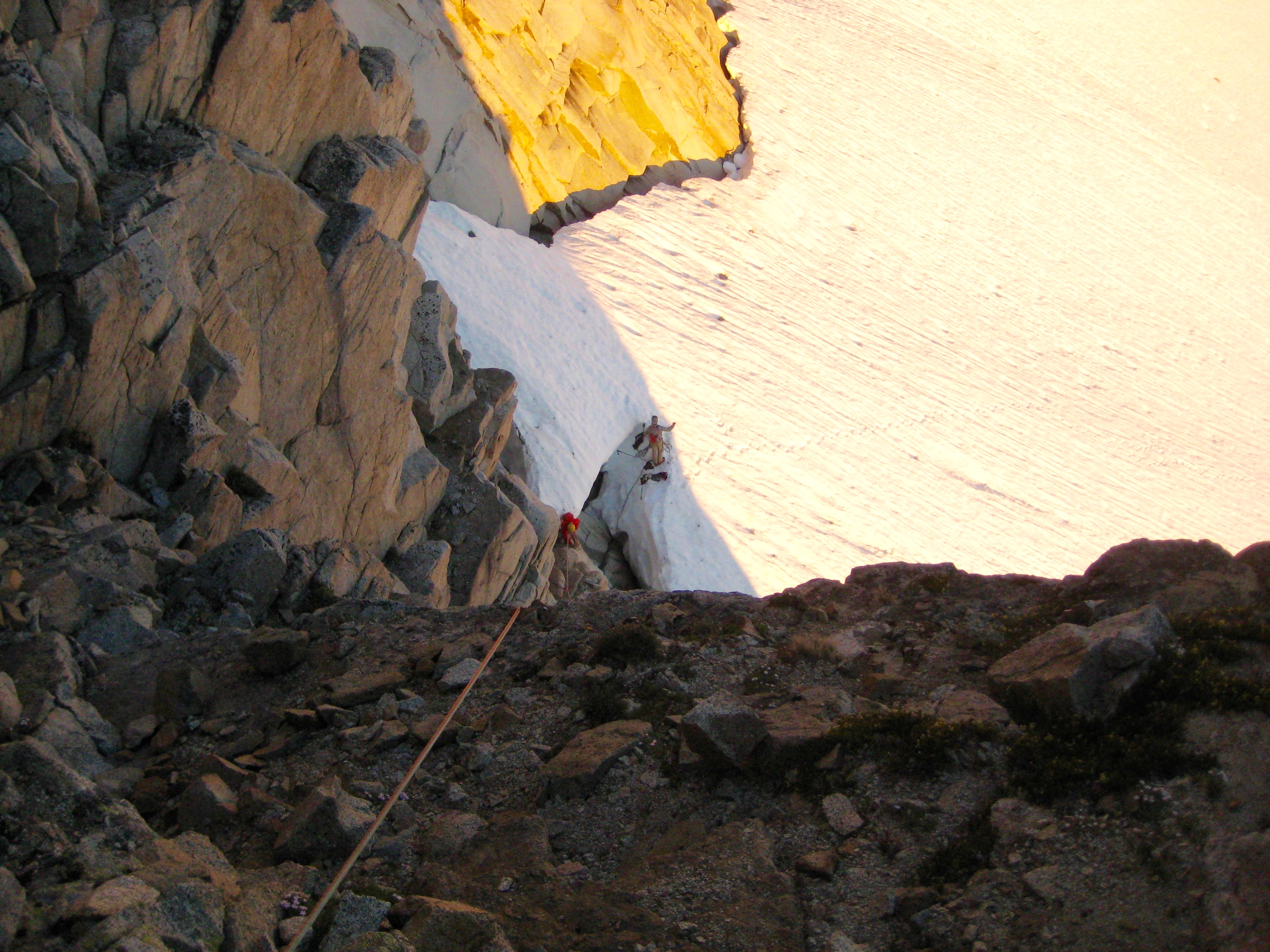 We belayed each other back down the exposed summit ridge, then made a double-rope rappel down the west face. From there, we were able to scramble down several hundred feet to the top of the black dihedral. Kevin led off a diagonal double-rope rappel, putting in directional protection along the way, which allowed us to reach the snow finger in one shot.