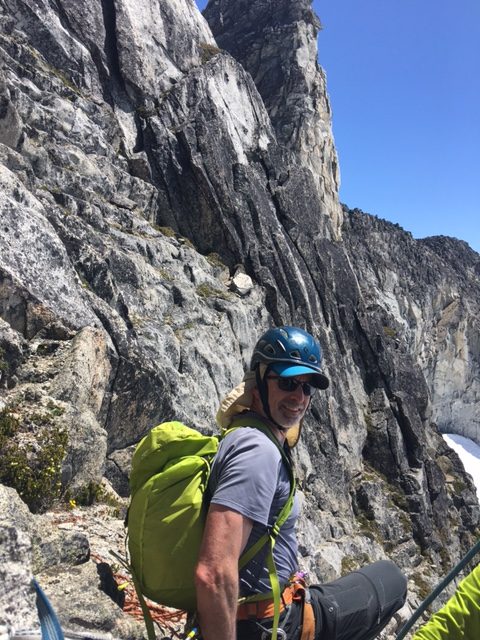 Over the long Independence Day Weekend, Kevin K. and George W. joined Eileen and me on a six-day climbing adventure into the Ptarmigan Mountains. Our goal was to climb Gunsight Peak and Sinister Peak. Eileen was the trip architect, and the rest of us were along to do the heavy lifting. We were fortunate to have beautiful weather (except for a few foggy hours on Day 4), scant bugs, and no other people for the first three days.