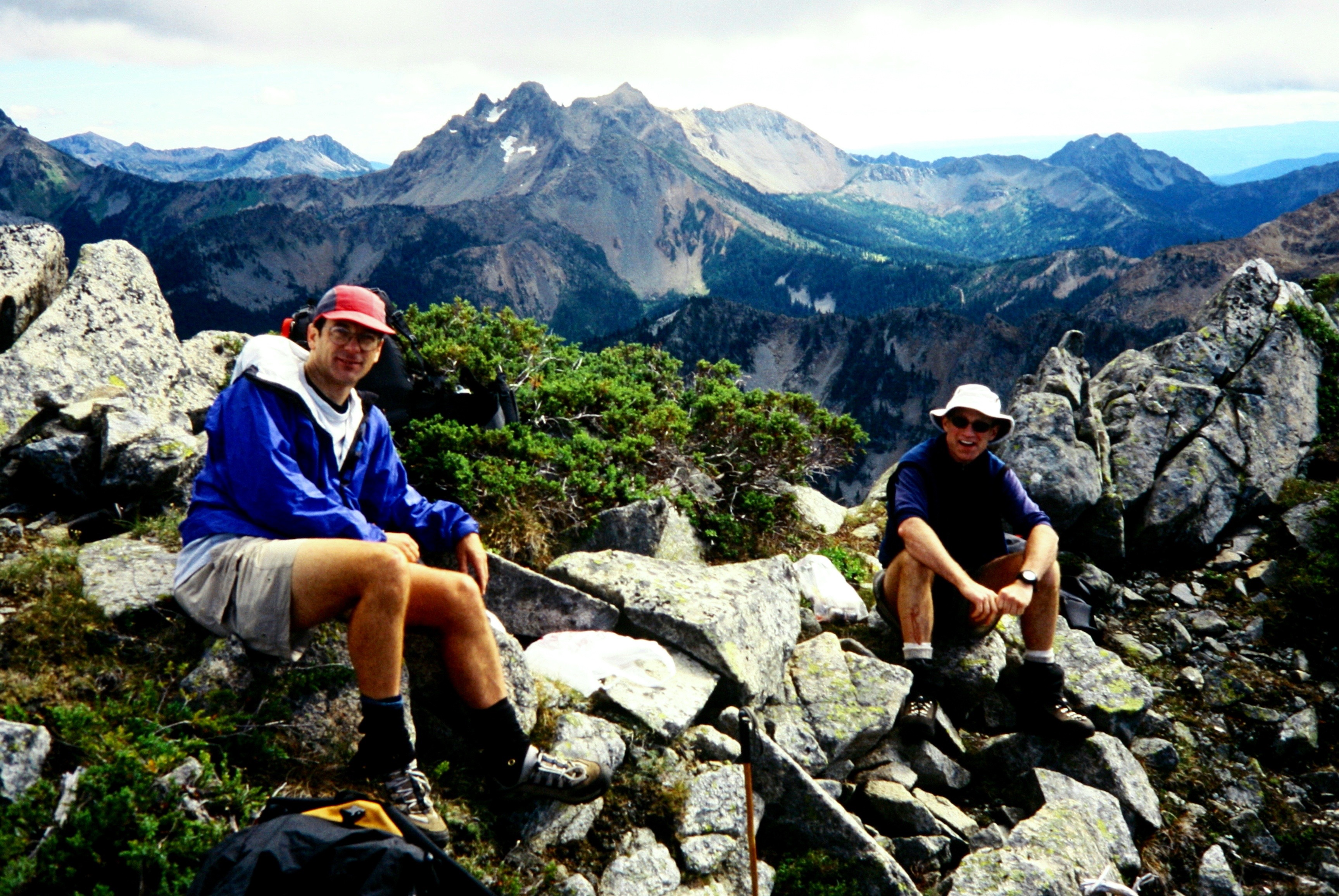 The register was a nice big PVC tube containing a new book (placed by Johnny Jeans in 2002) and a few pieces of paper from earlier climbs.  The book and papers listed surprisingly few ascents over the past decade.  We were the first party signing in this year, and only one person (Dick Kegle) had signed in all last year.  Harding Mountain obviously is not a hot-spot among climbers, although it does sit favorably between Mt. Stuart and The Cradle.  We relaxed for a while and enjoyed slowly improving views.  The skies continued to be partly cloudy, but we never felt a drop of rain.