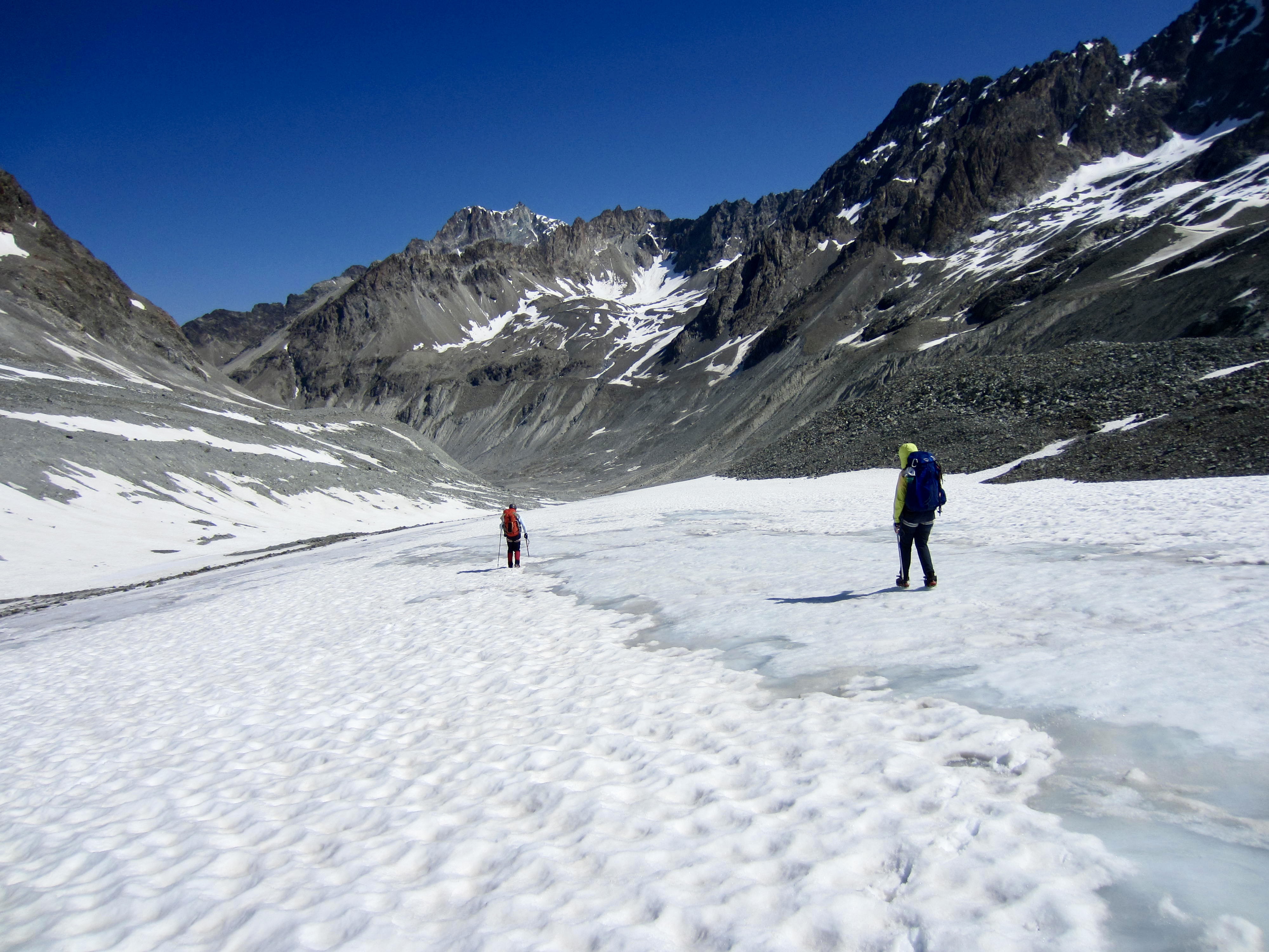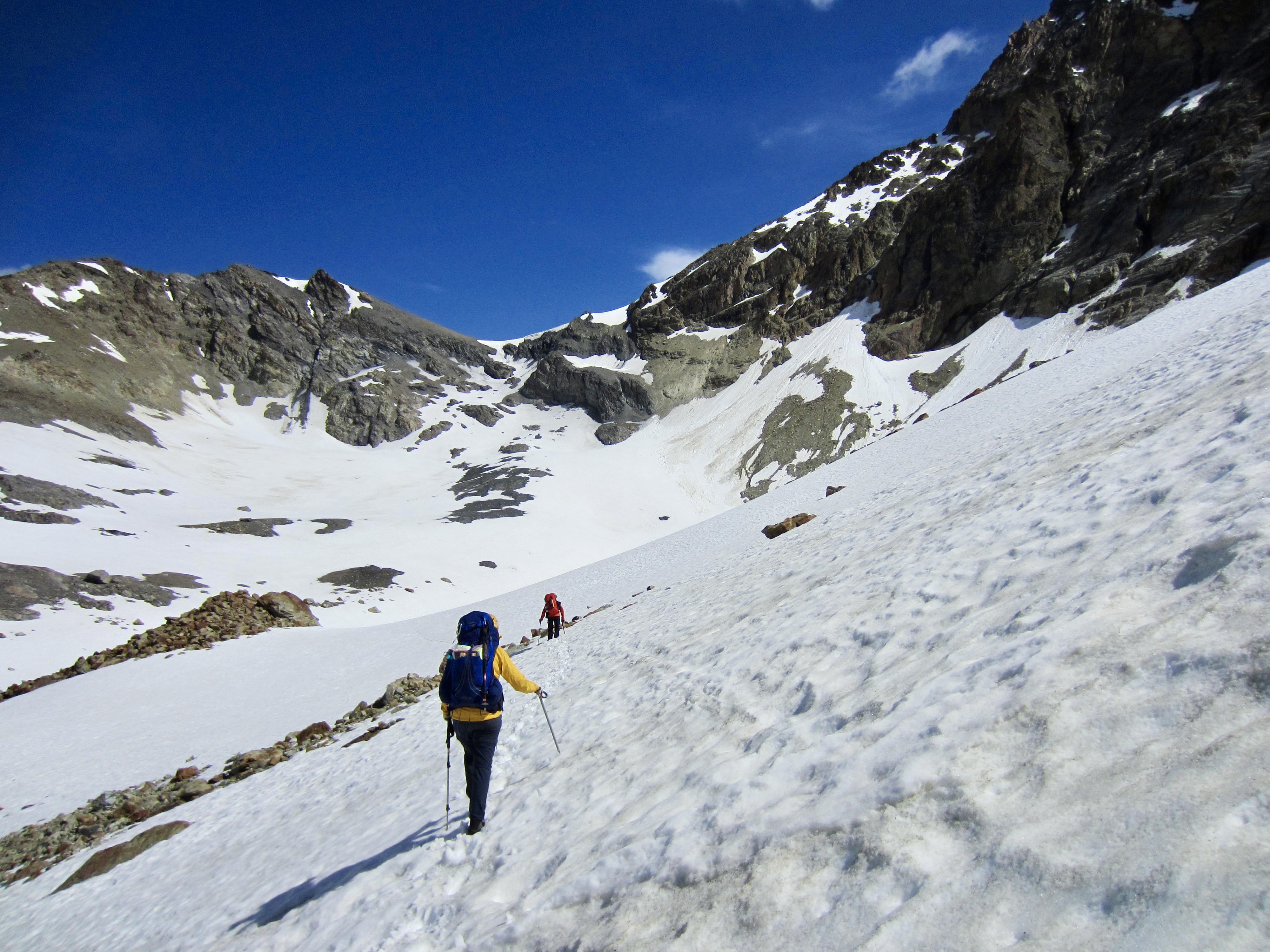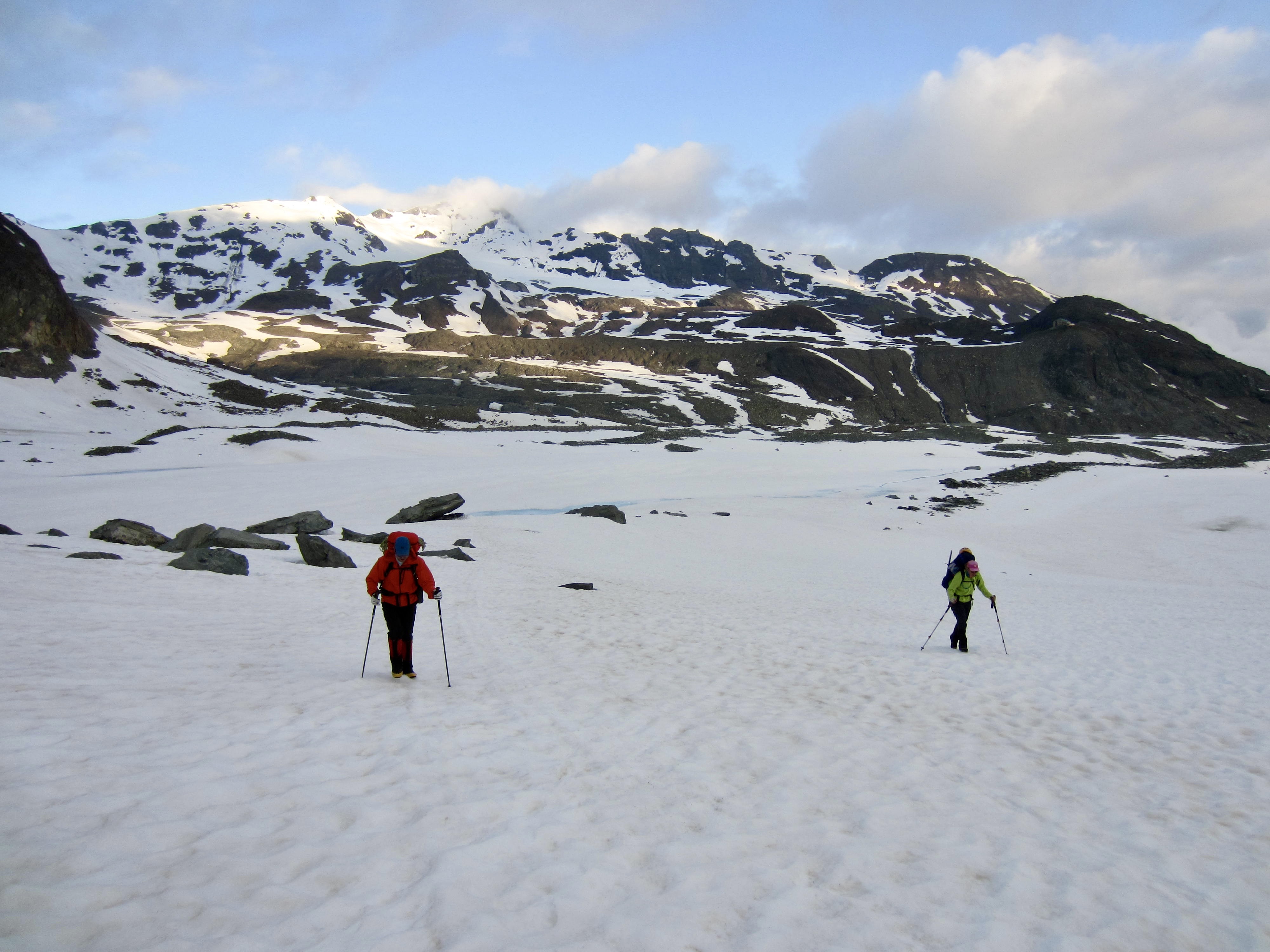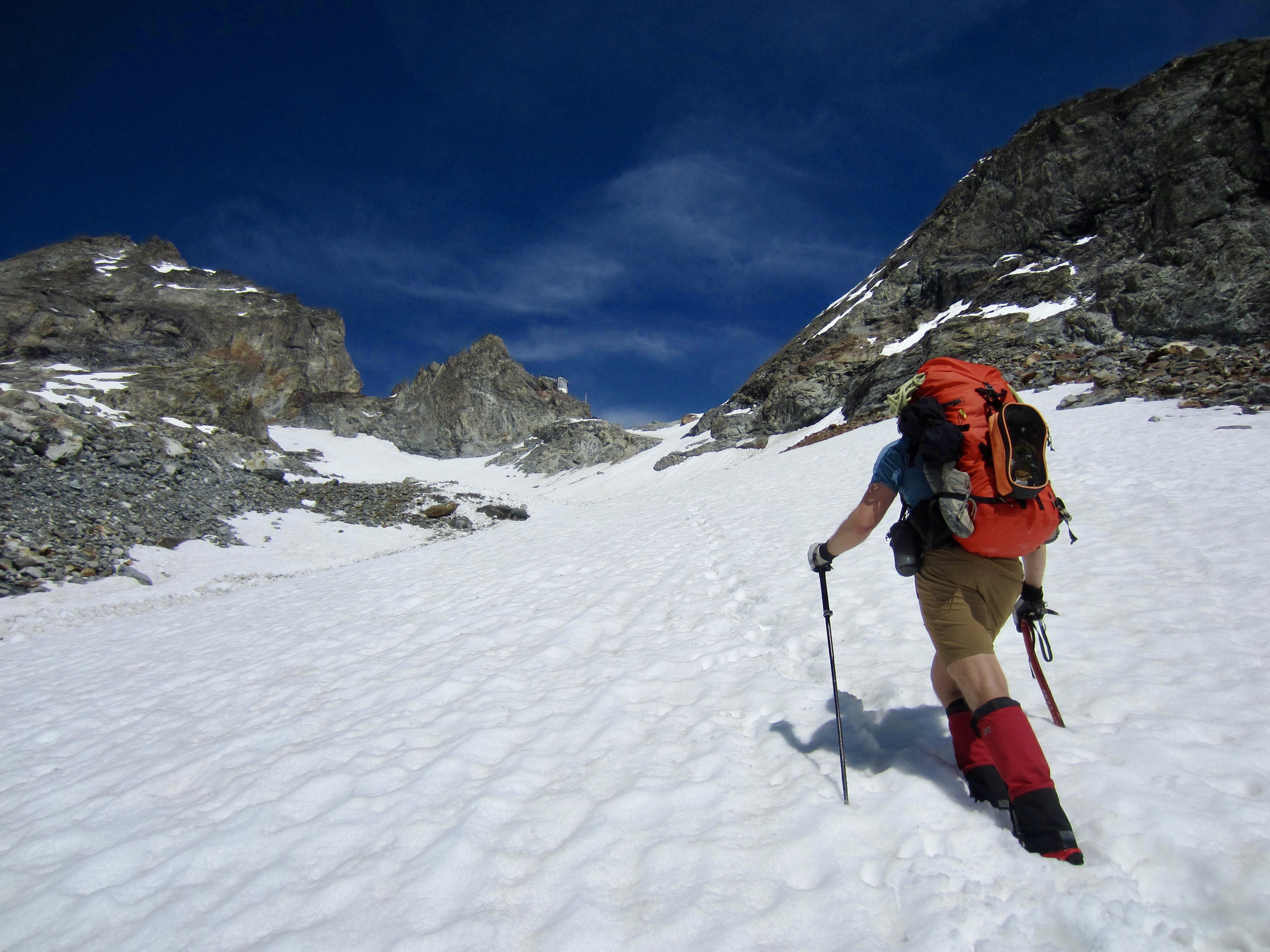 From Bertol Plain, we could clearly see Bertol Point and Bertol Col at the head of the valley. We headed up-valley, first on bare trail and then on a series of snowfields. Bertol Hut gradually came into view above the col.