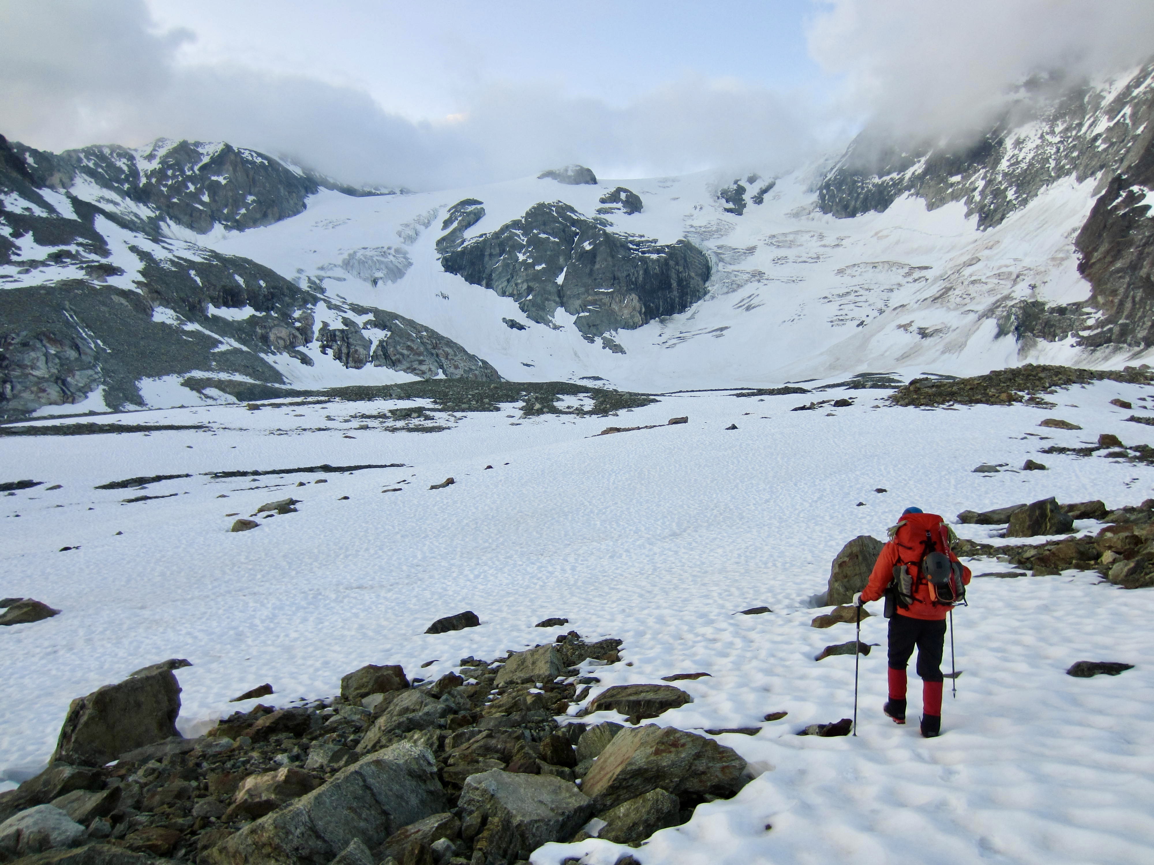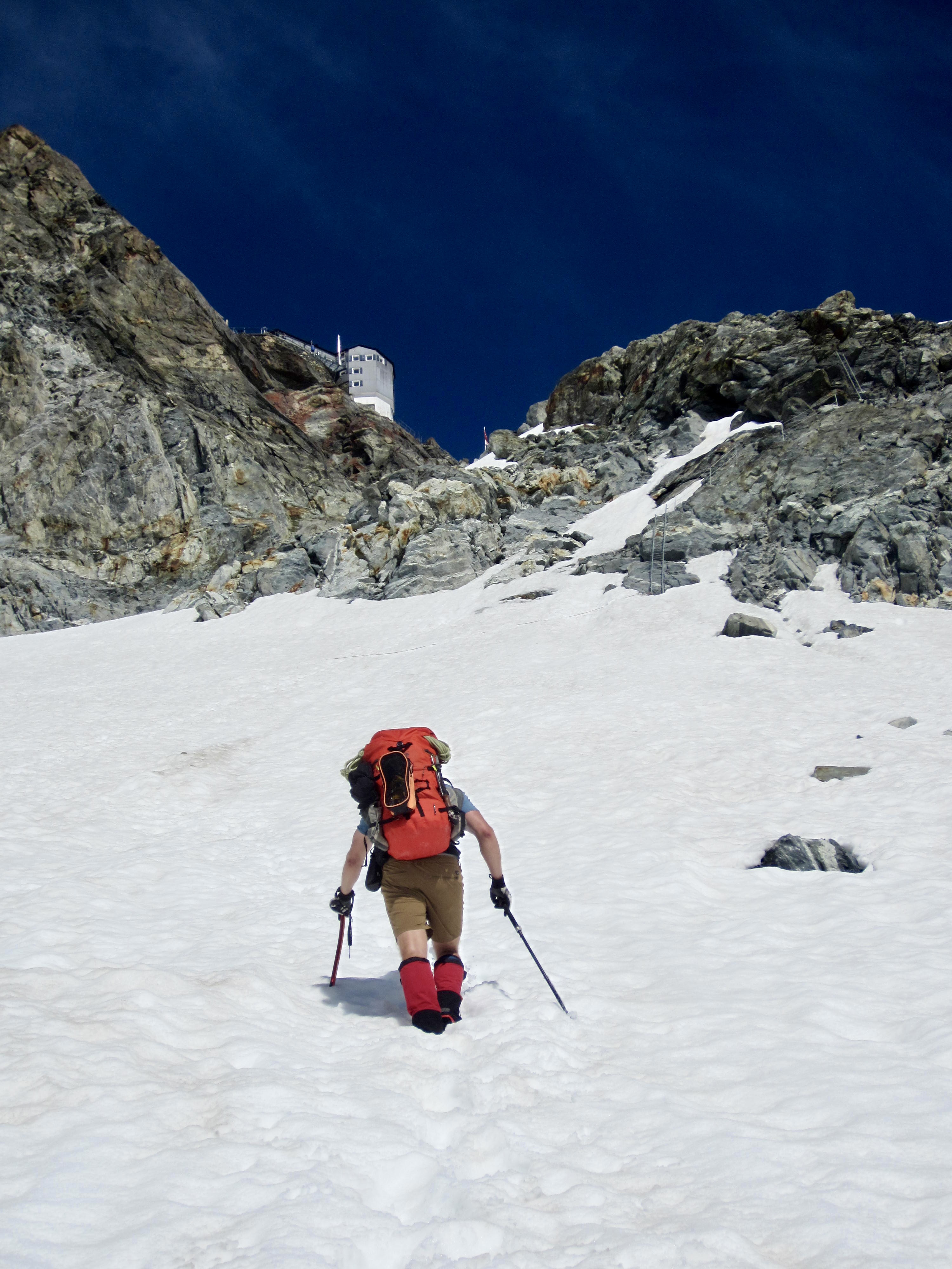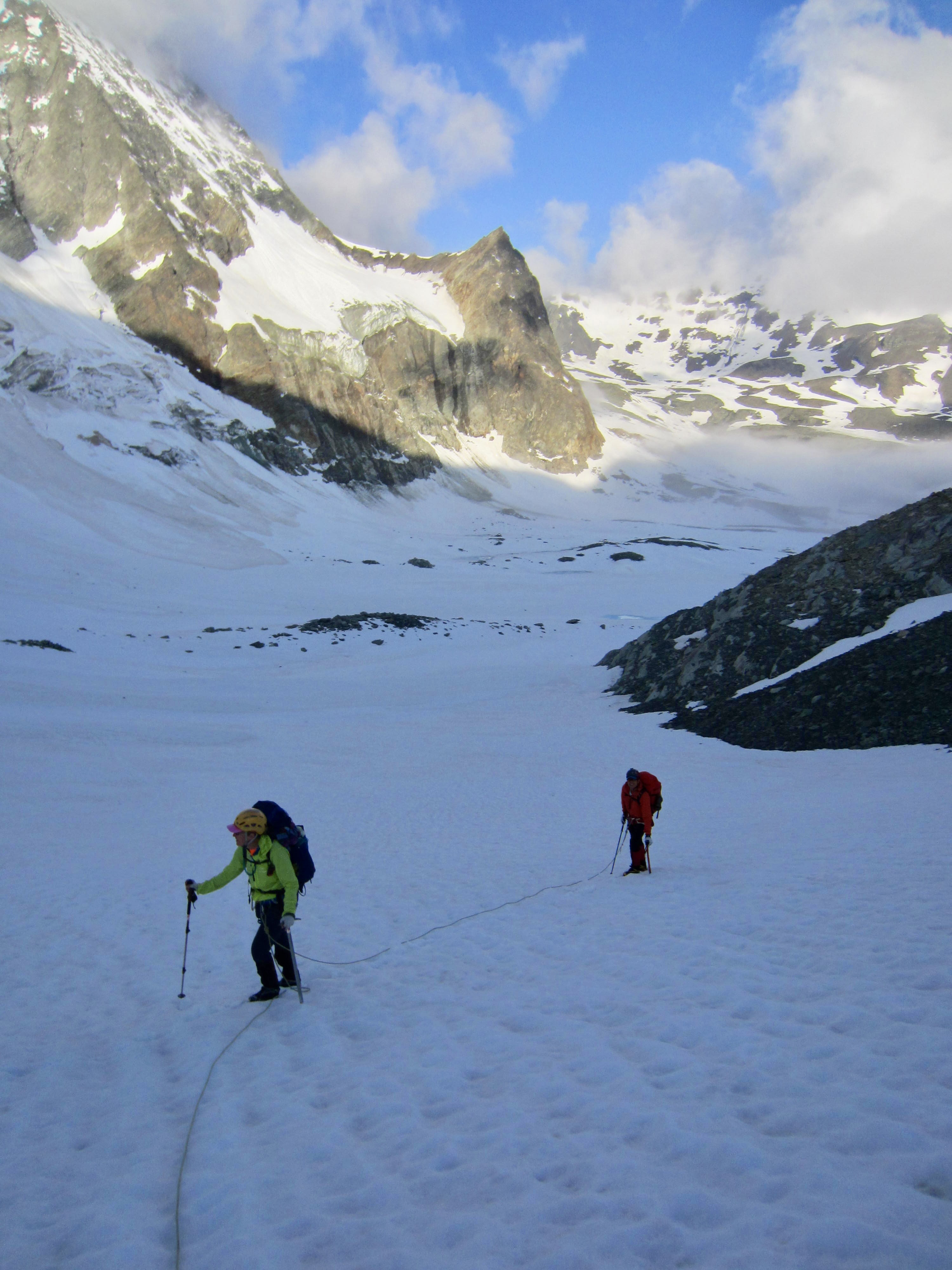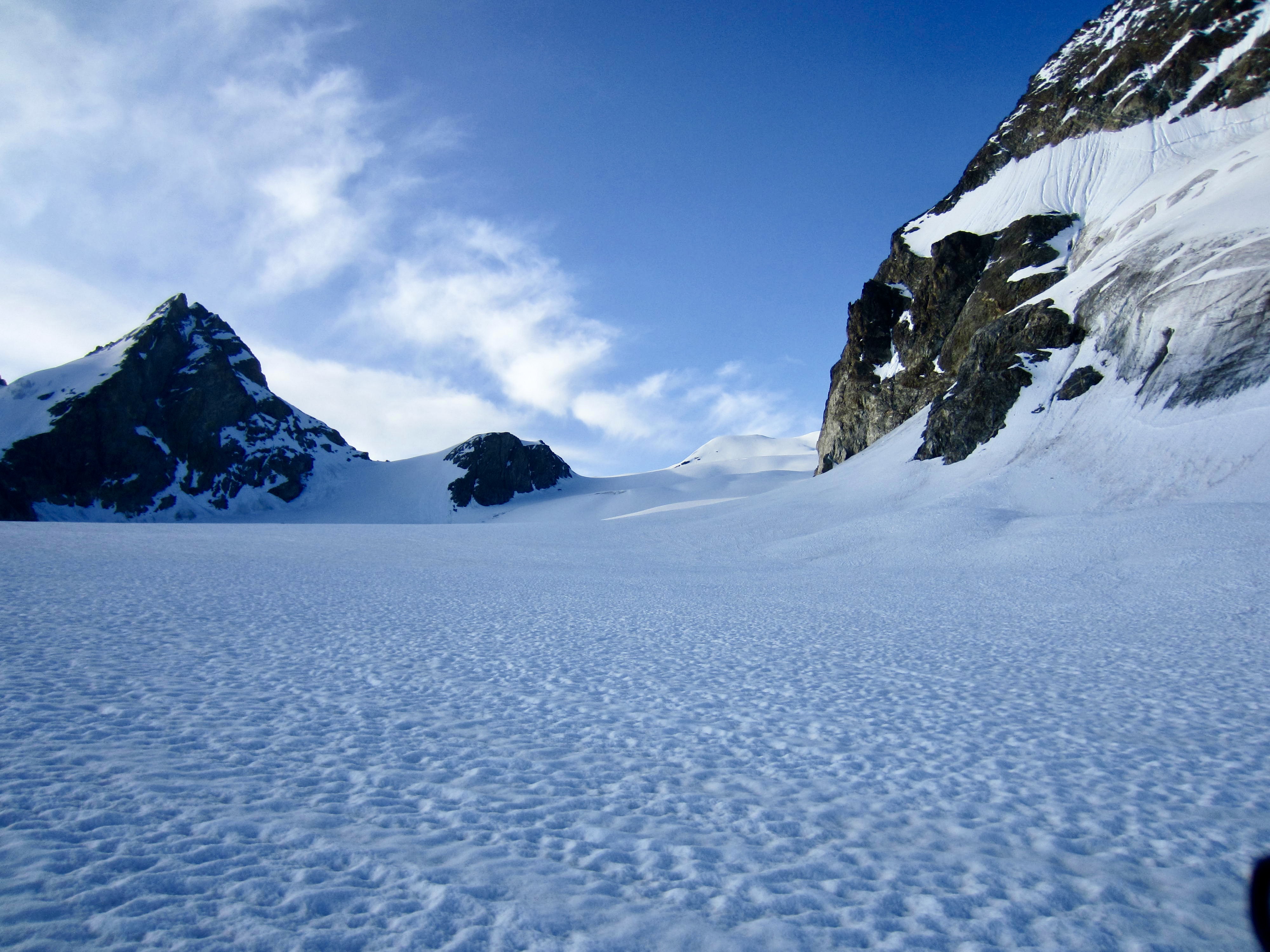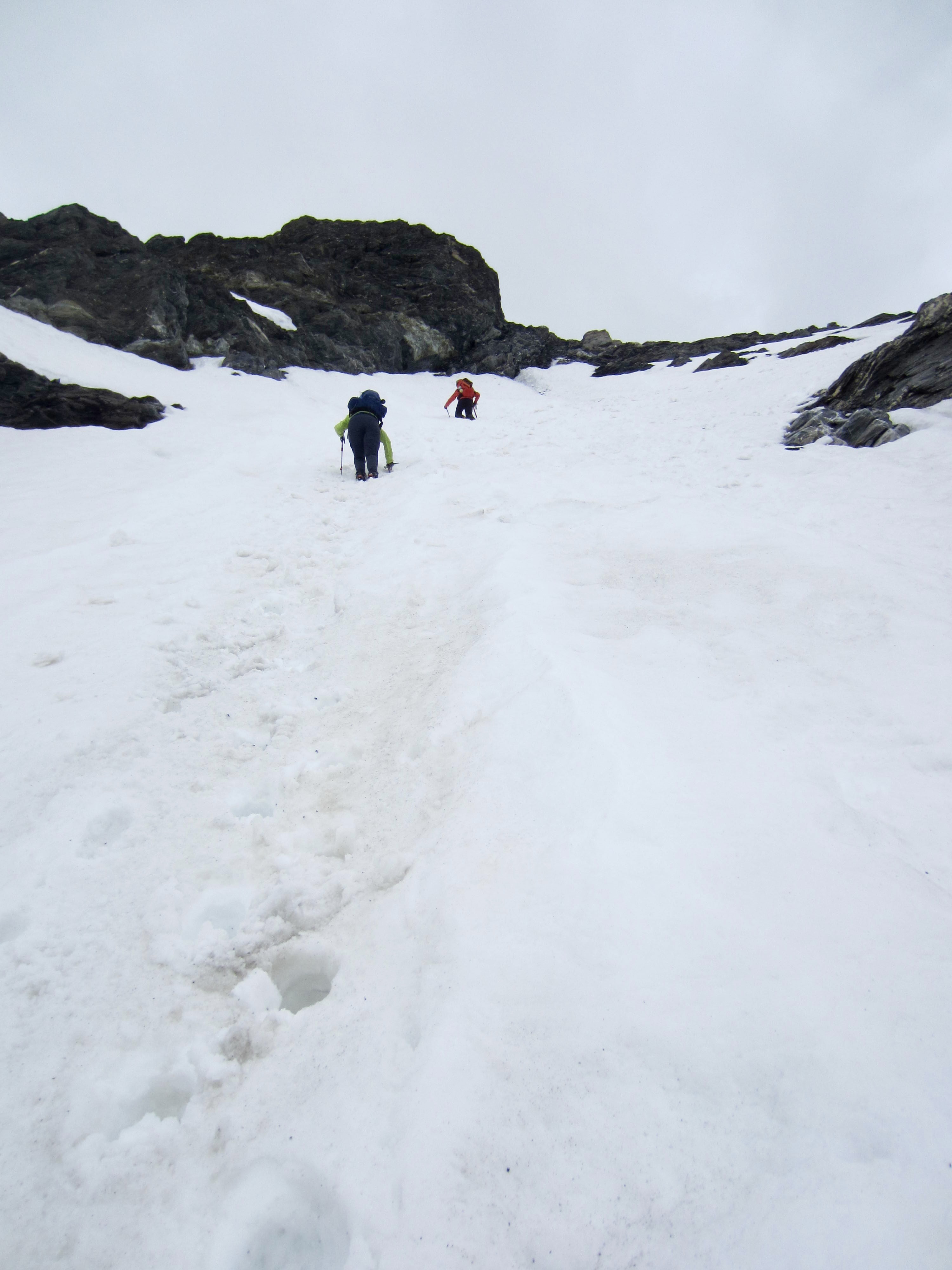 From Bertol Plain, we could clearly see Bertol Point and Bertol Col at the head of the valley. We headed up-valley, first on bare trail and then on a series of snowfields. Bertol Hut gradually came into view above the col.