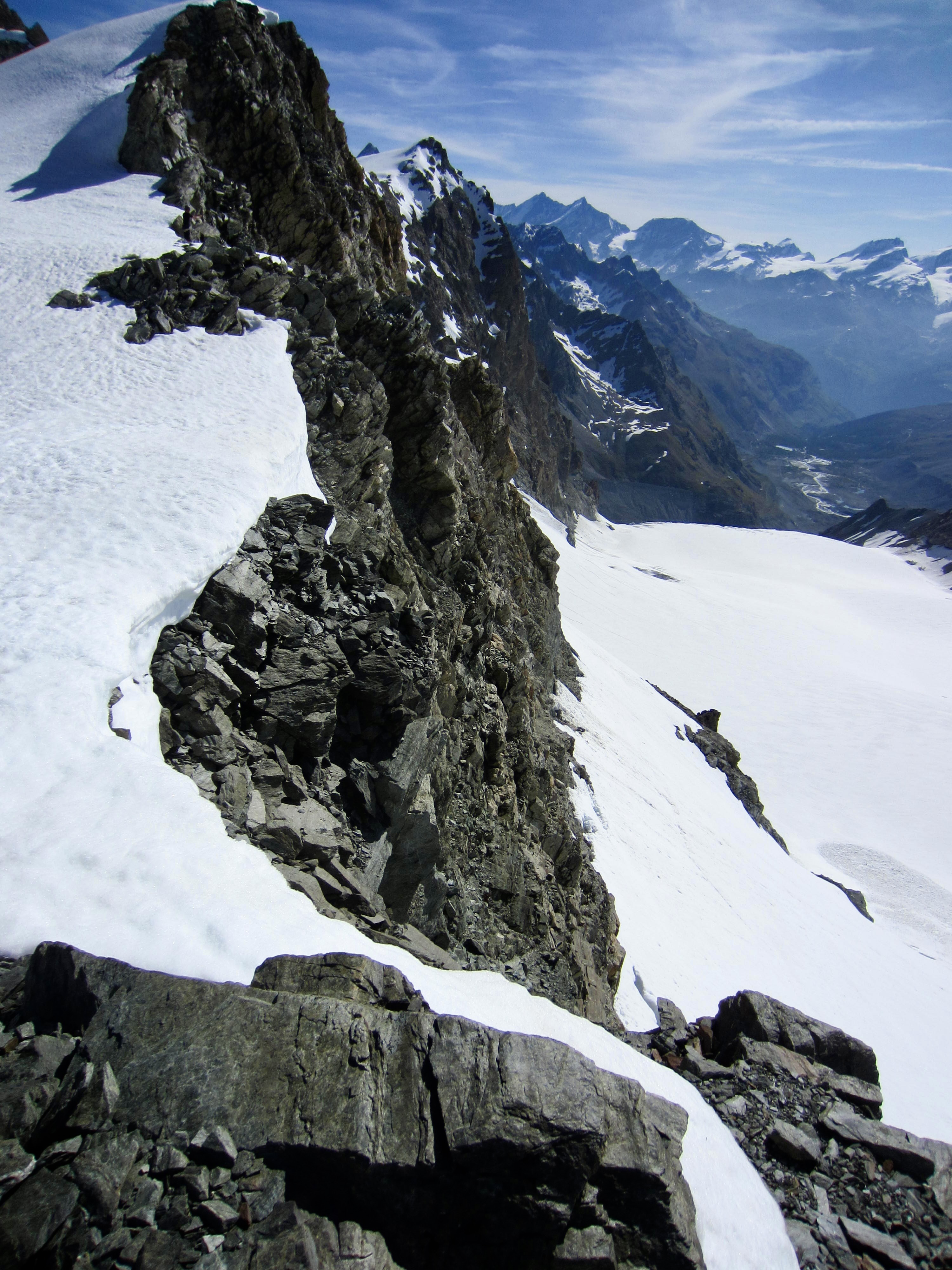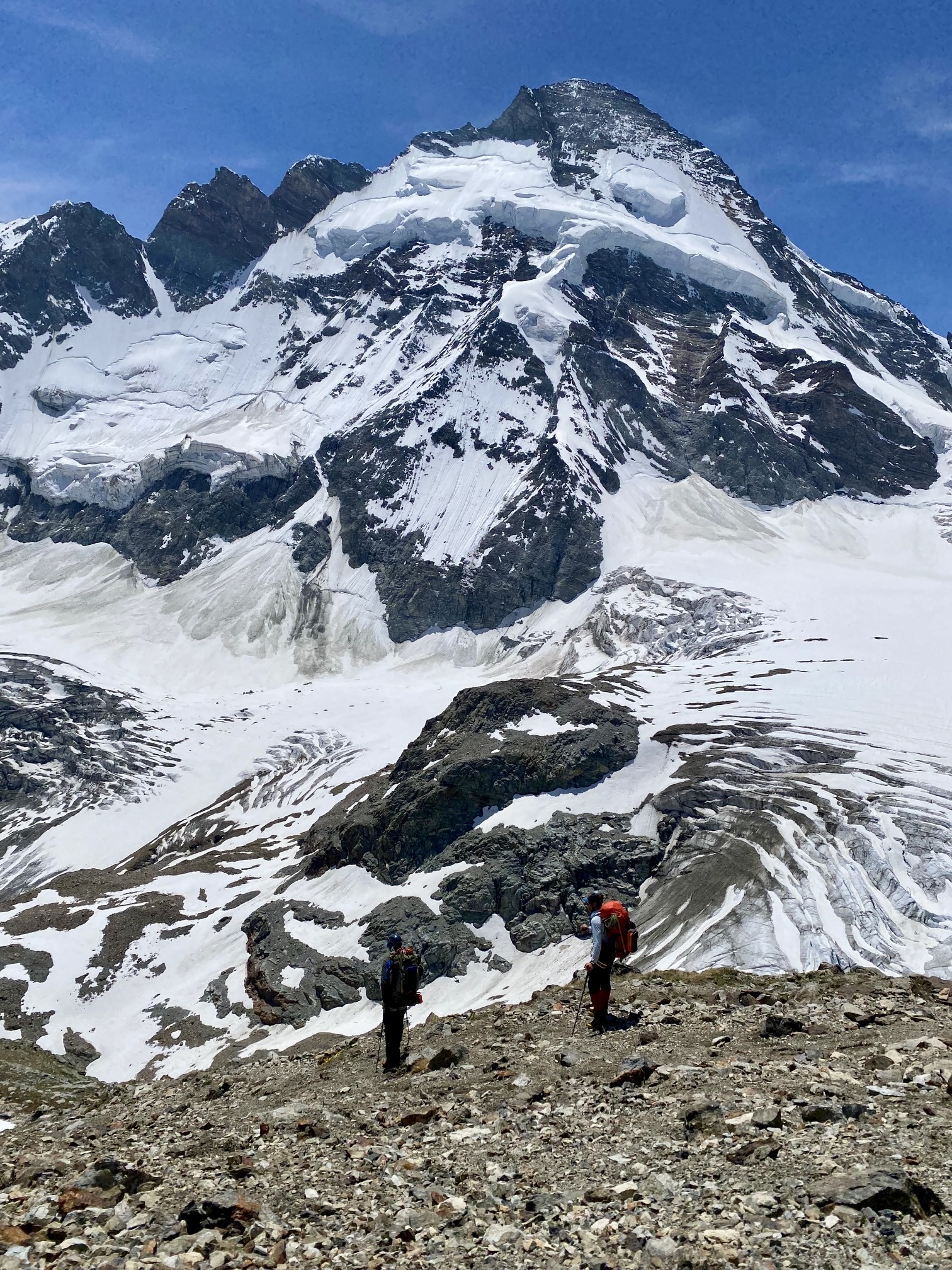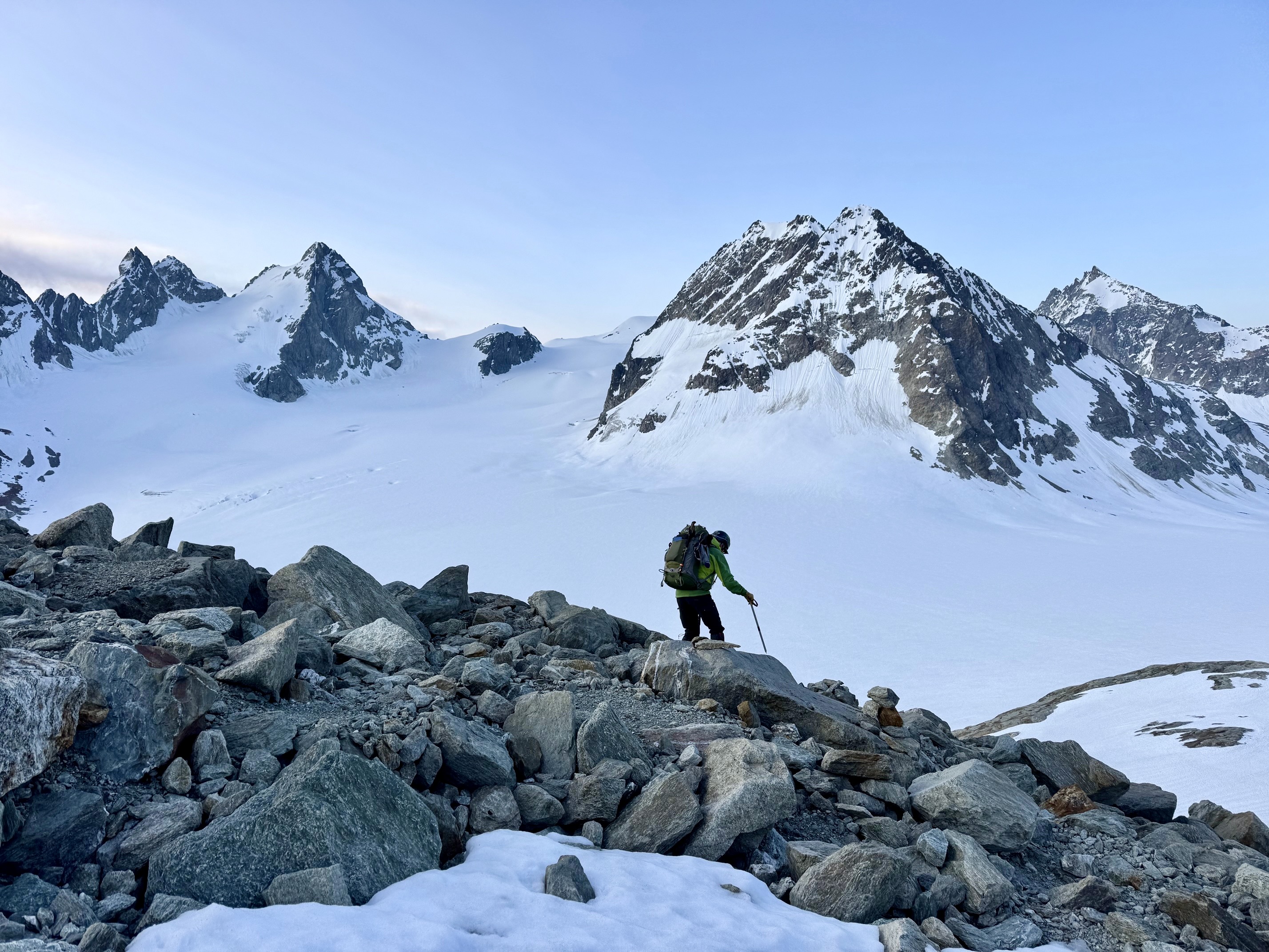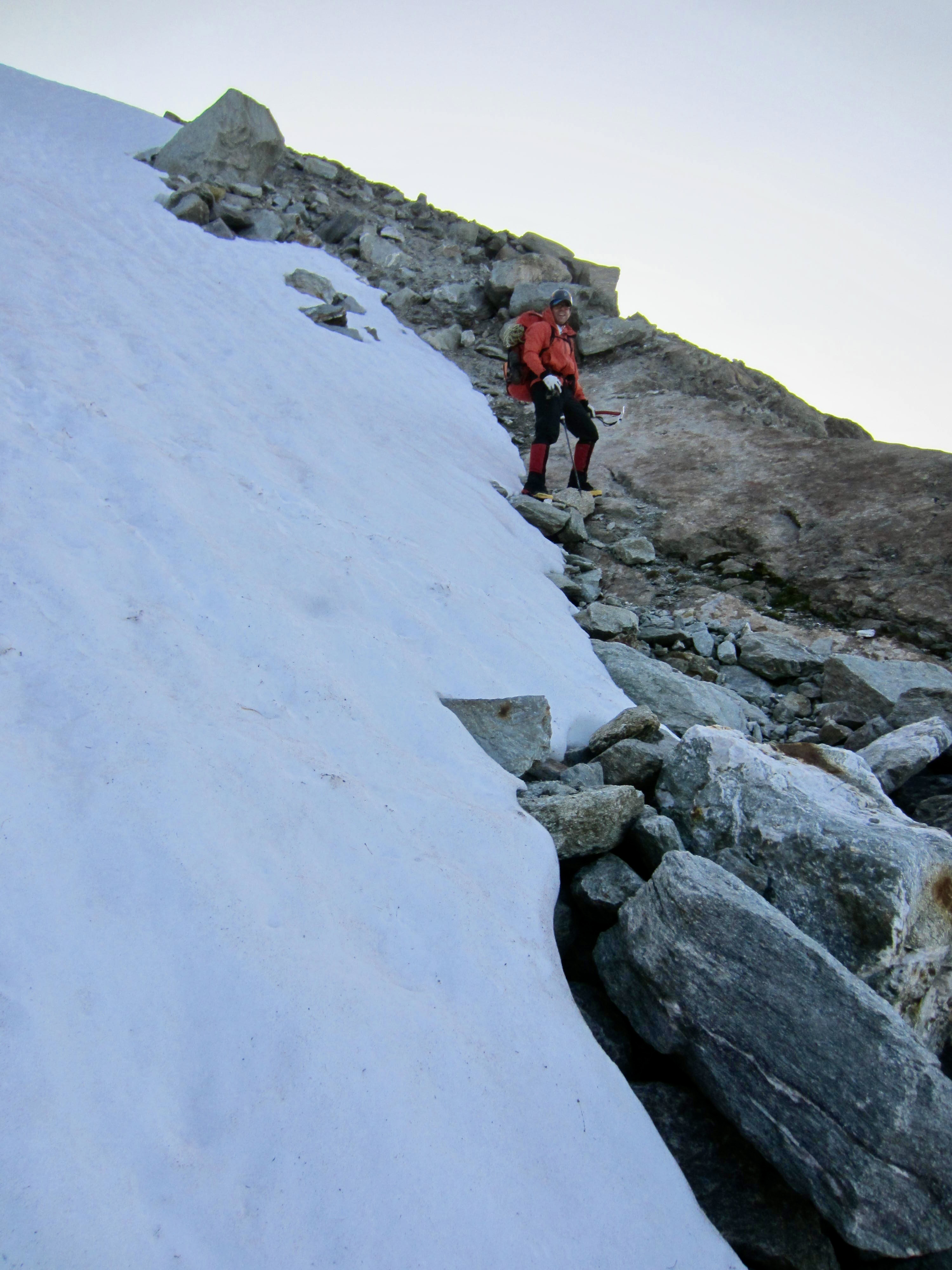 Our morning challenge was to get off the level bench and onto the Arolla Glacier. This involved scrambling down a super-steep, bouldery nose and then front-pointing down a rock-hard snowfinger. When done, we had a group debate regarding whether this descent was easier or harder than the descent off Cheilon Col two days ago. Ultimately, we agreed to disagree.