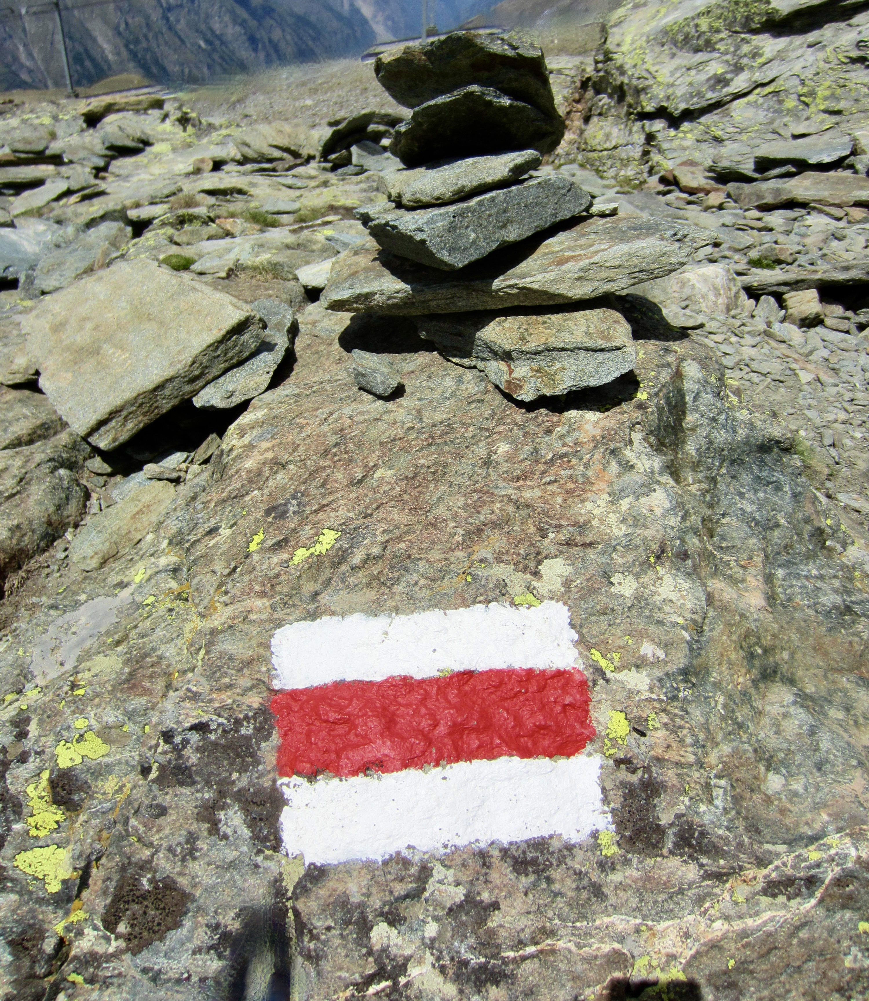 Upon reaching the lower end of The Stockje, we came to a marked path junction atop a moraine. A sign here indicated that the left fork led to Schonbiel Hut. Assuming that the right fork led directly down-valley, we chose that one. Very quickly, however, this fork ended at a steep slot-gully fitted with a scary old cable. We immediately backtracked to the junction and took the left fork.
