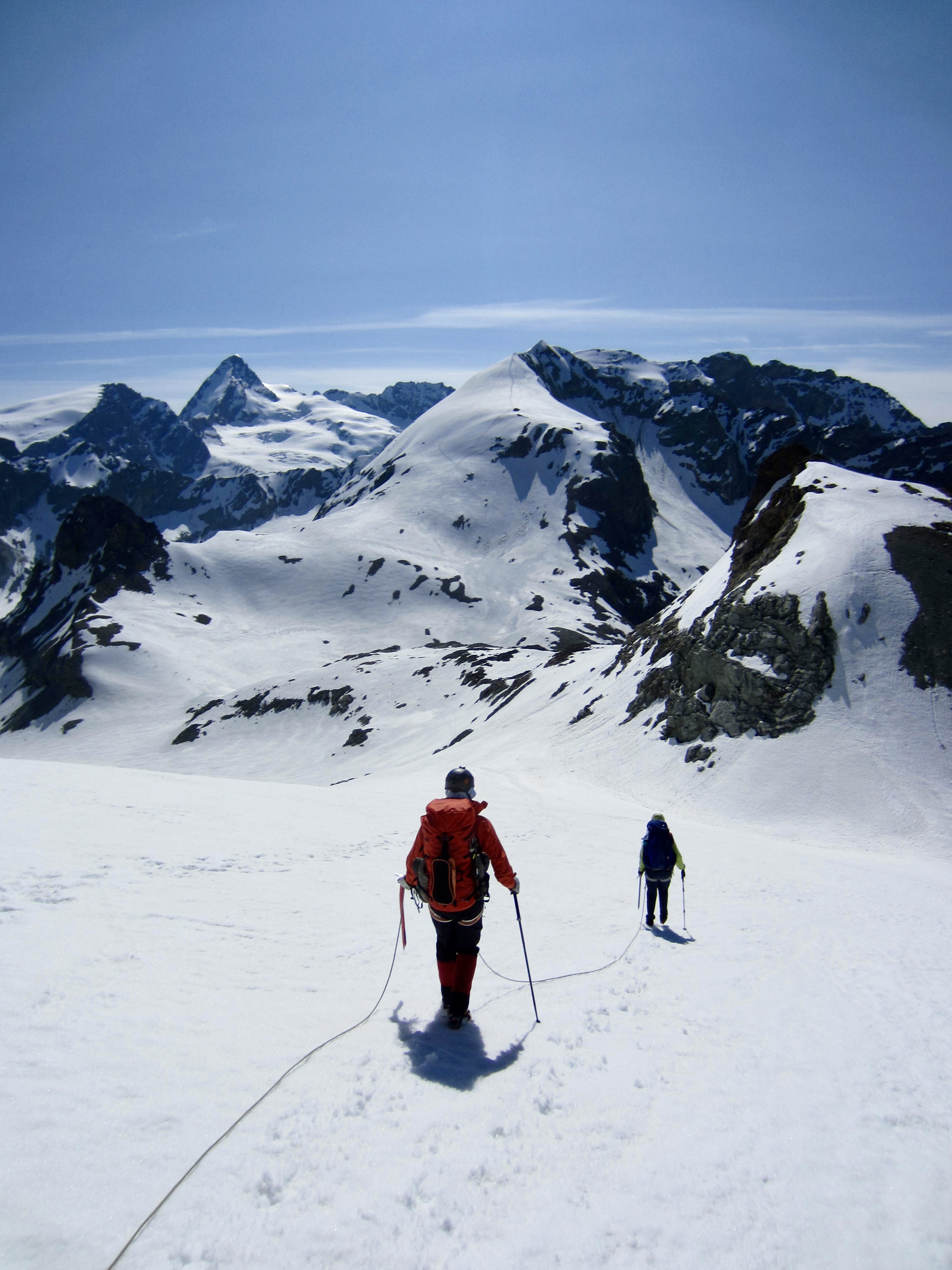 A major difference between the Alpine and Cascadian traverses is elevation. The Haute Route largely stays at elevations between 8,000 feet / 2,400 meters and 12,000 feet / 3,600 meters, whereas the Ptarmigan and Picket Traverses largely stay below 7,000 feet / 2,100 meters. This difference makes the Haute Route feel more strenuous, especially to those of us who live near sea level and are not naturally acclimated.
