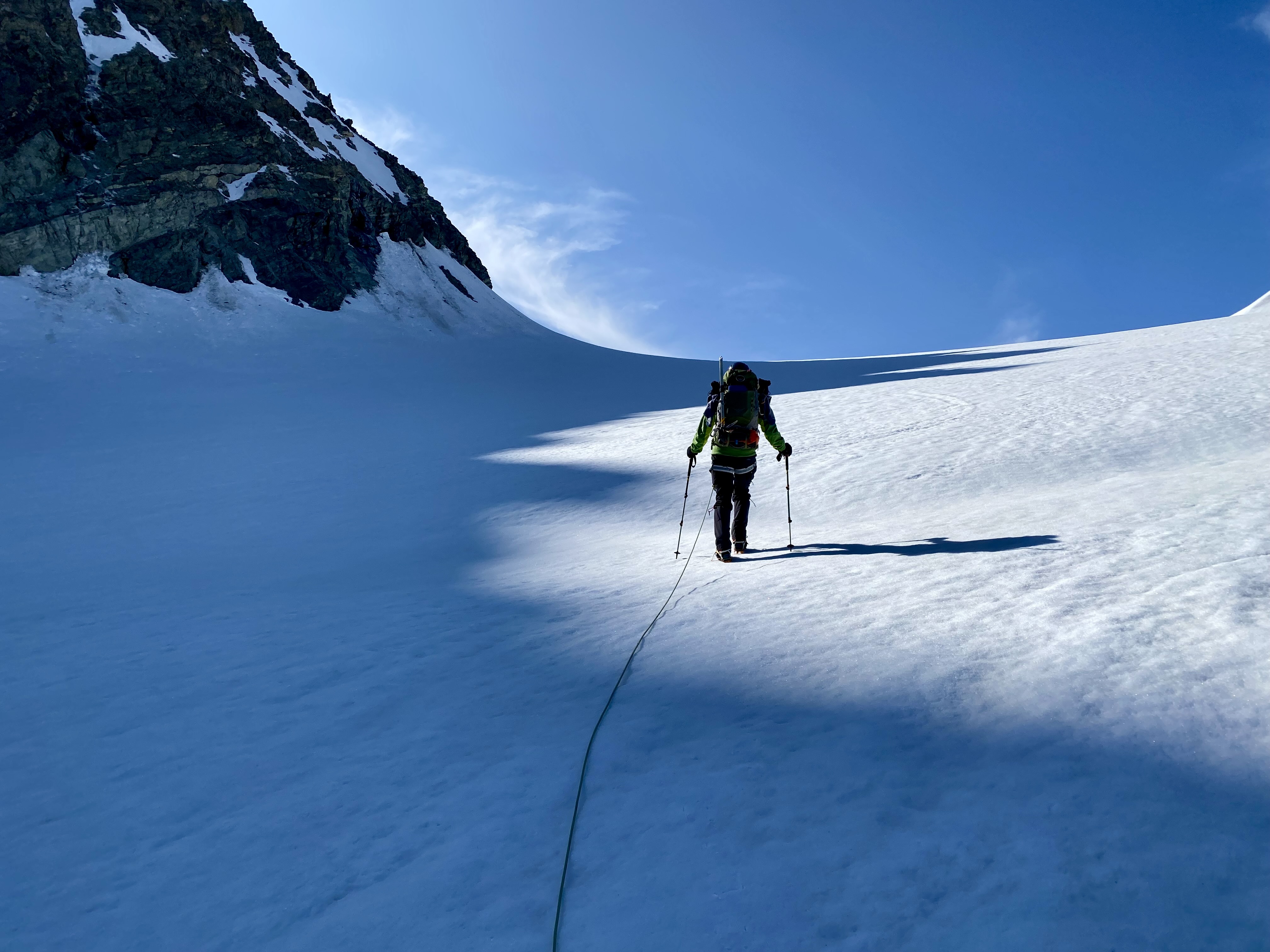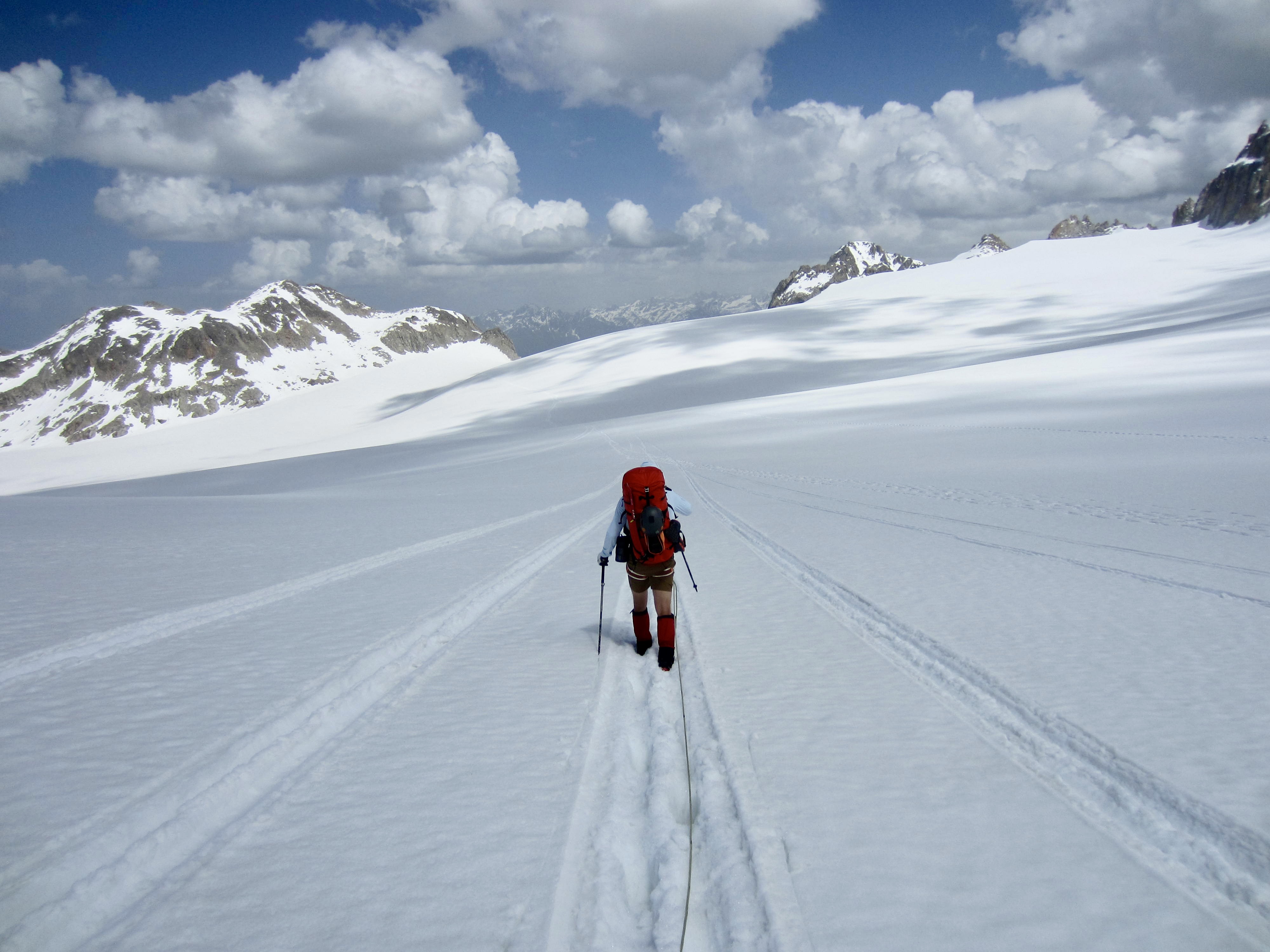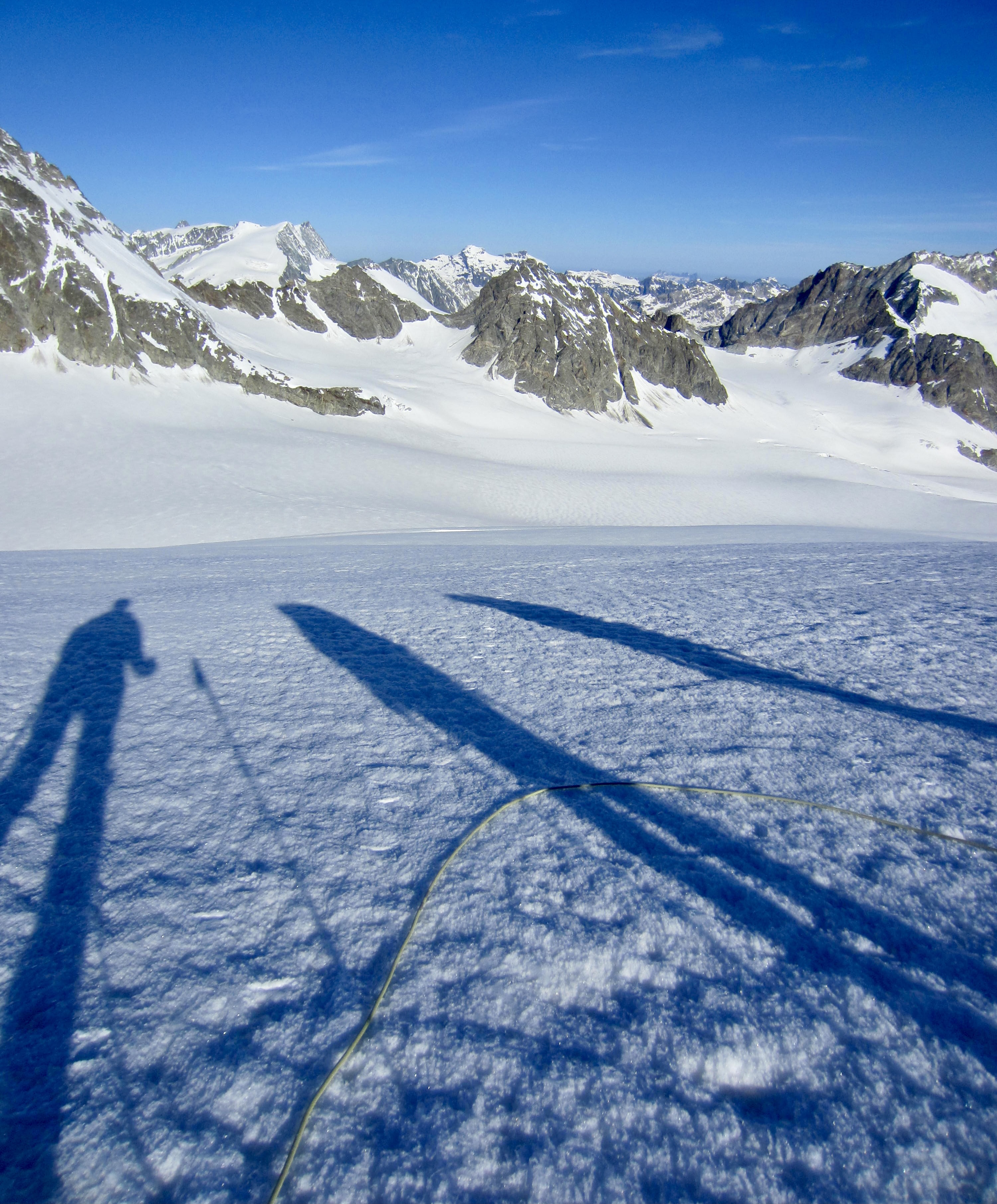 After rejoining Eileen and collecting our backpacks, we roped up and began a long march across the Trient Glacier. The afternoon sun had now turned the surficial snow into bottomless mush. Ah ha, that’s why the guides set a 3:00am alarm! For a while, we were able to follow the airplane’s pontoon tracks, but most of the traverse was a slow, tedious, post-holing slog.