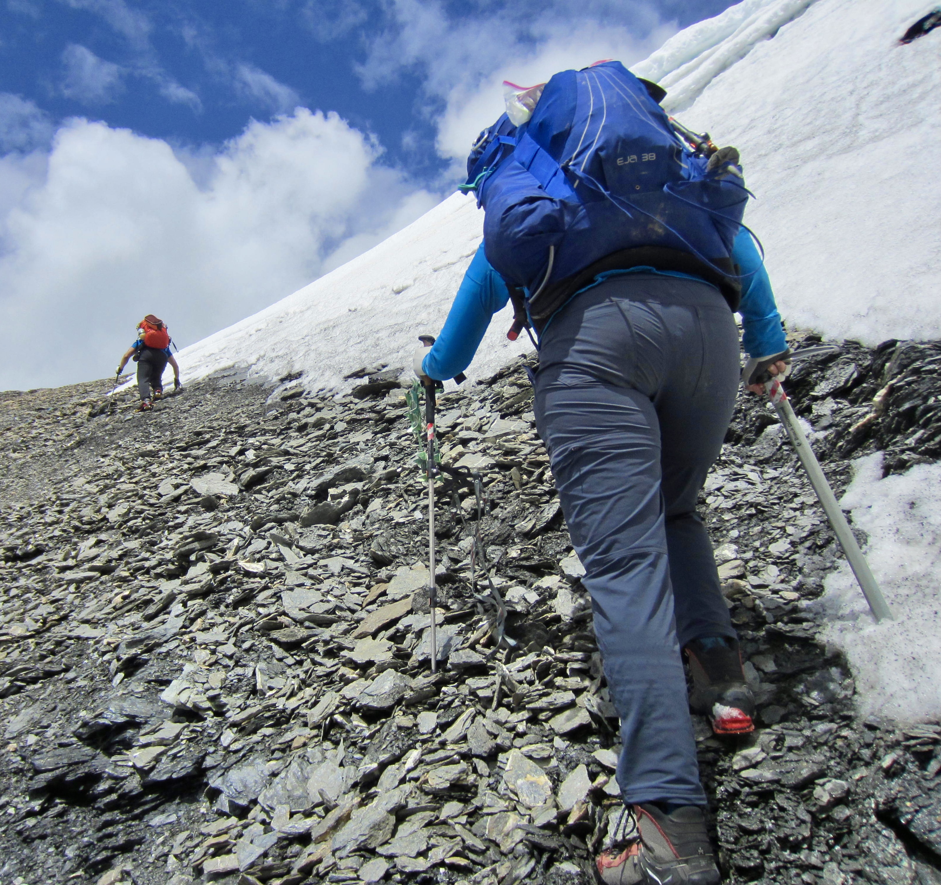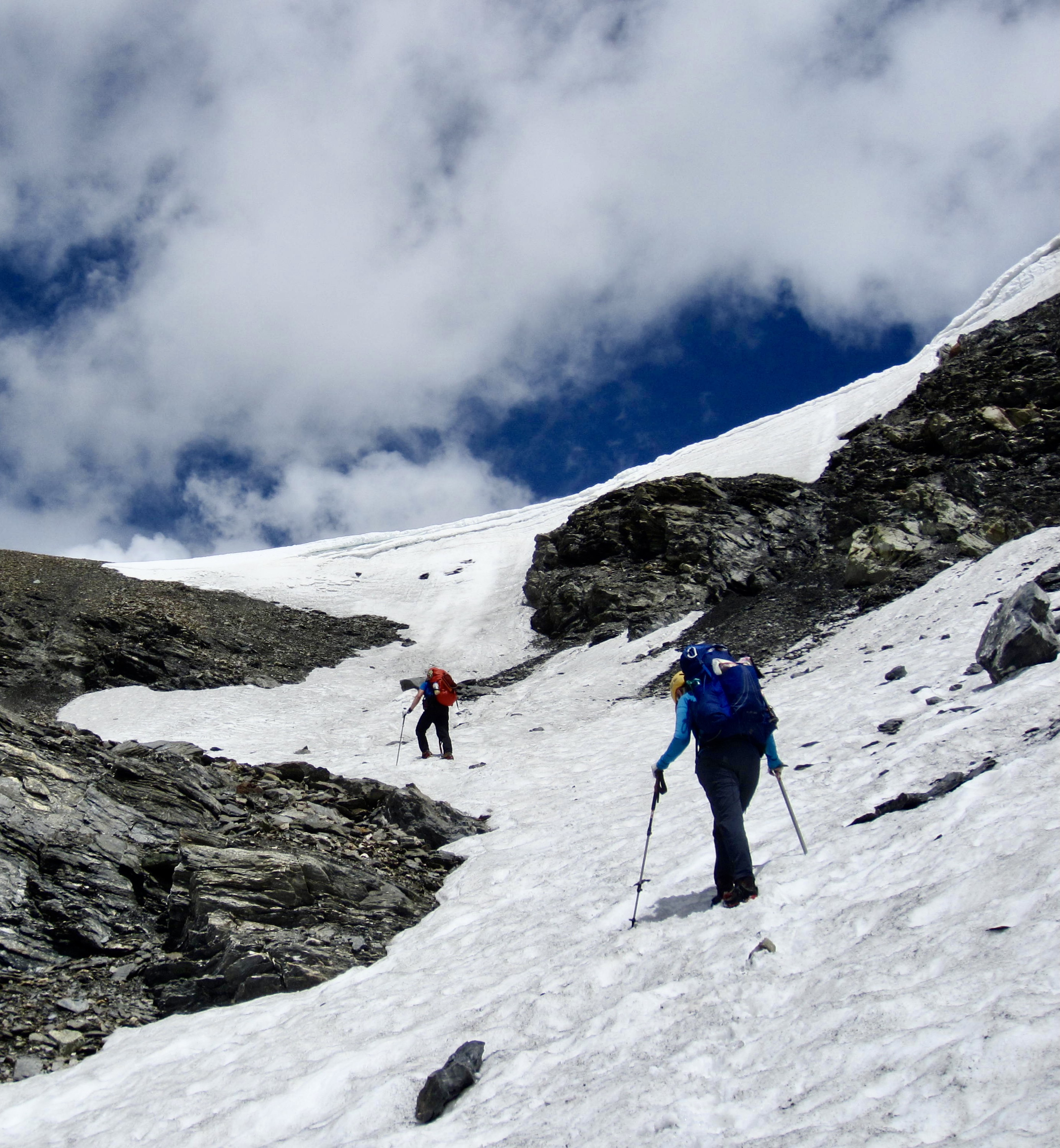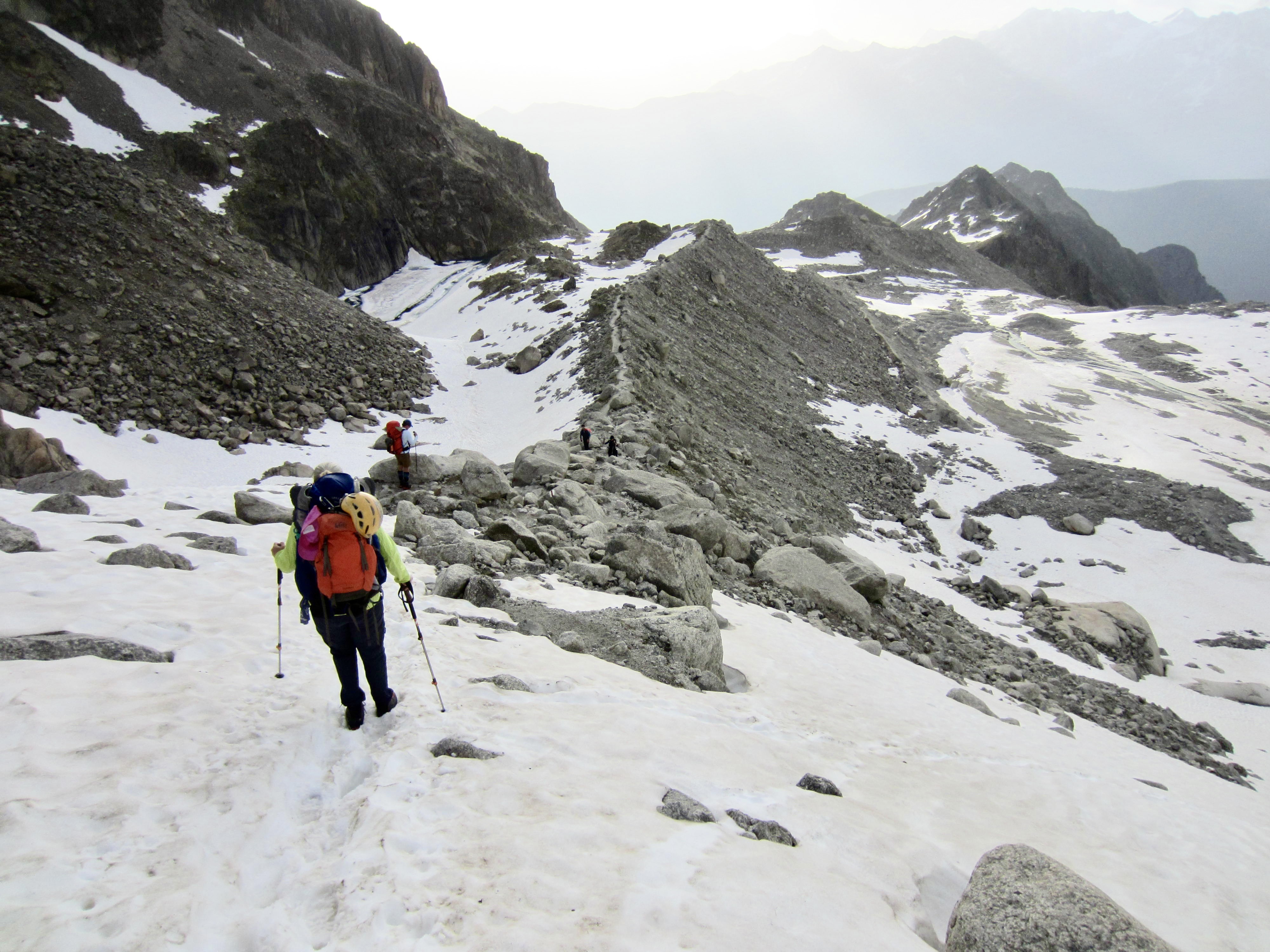 After an all-too-short night of sleep, we were out the door and on the move before 6:30am. Our morning started with a hike back up to Tsofeiret Col and then a hike and snow climb farther up to Lire Rose Col. Intermittent rain showers prompted numerous clothing adjustments throughout the day.