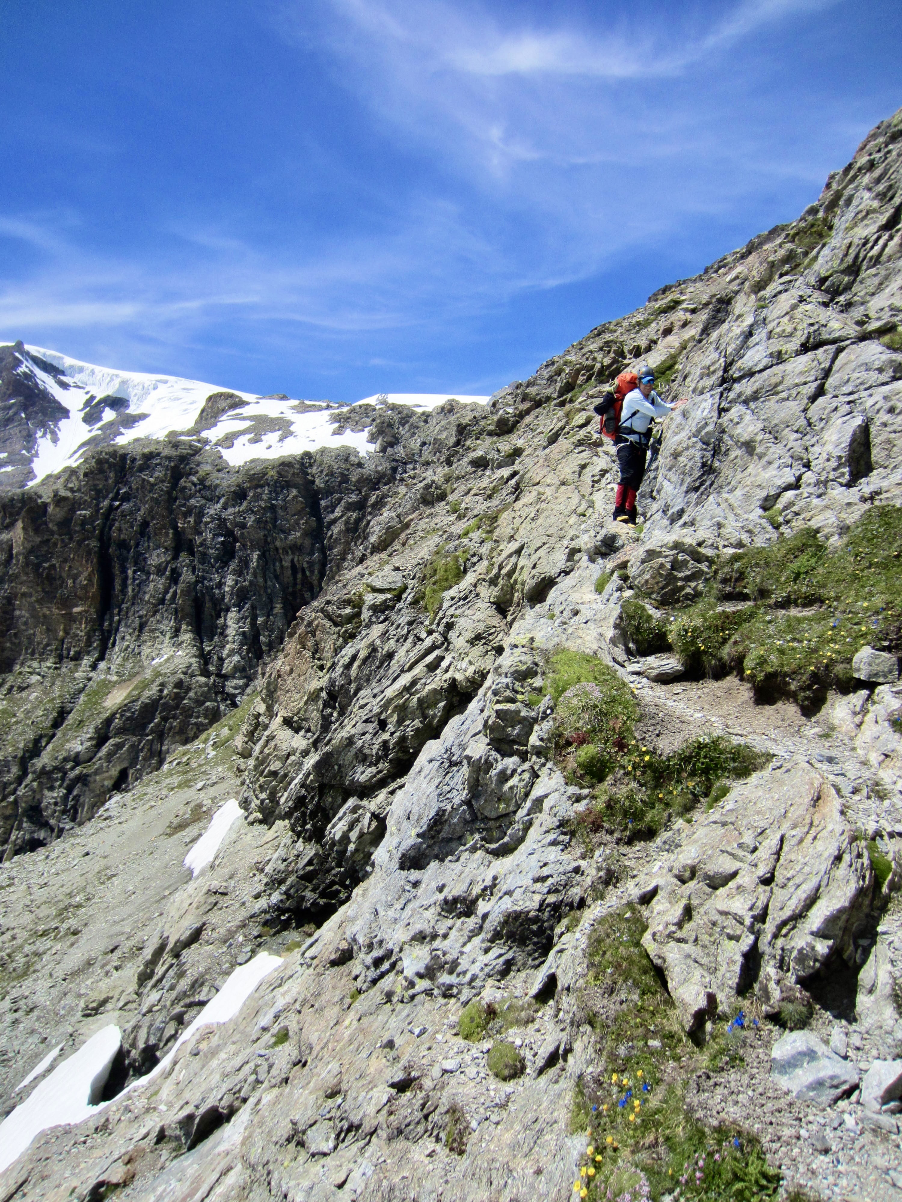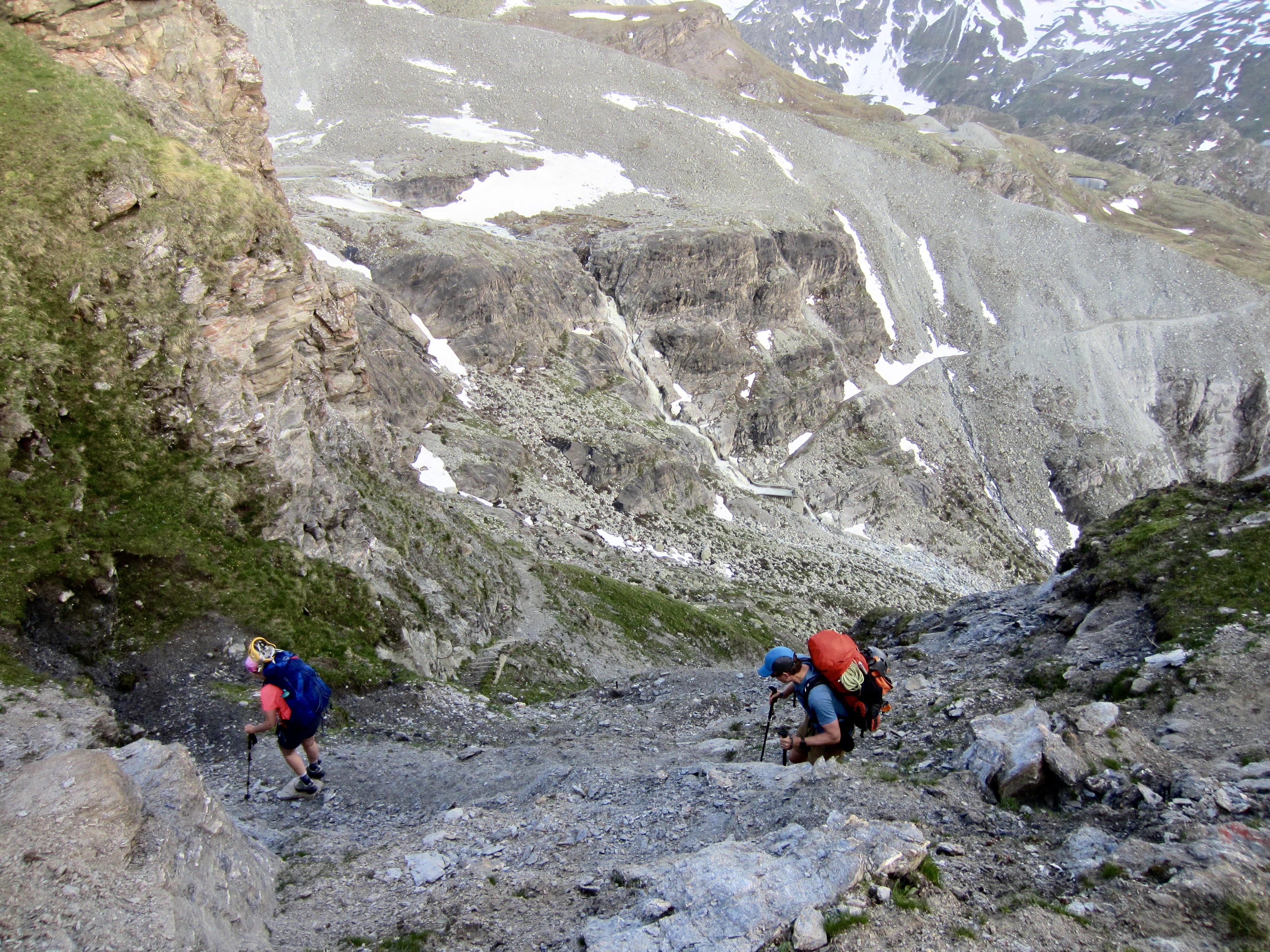At the stoss, or up-gradient end, of The Stockje, we were delighted to find a well-marked climber’s path running up the crest and then down along the right (south) flank. For the next several hours, we followed this path across steep sidehills and down short cliff bands. New handline ropes were in place at any location that involved significant exposure or serious scrambling. Clearly, the local mountain guides were getting ready for a summer season on the Haute Route.